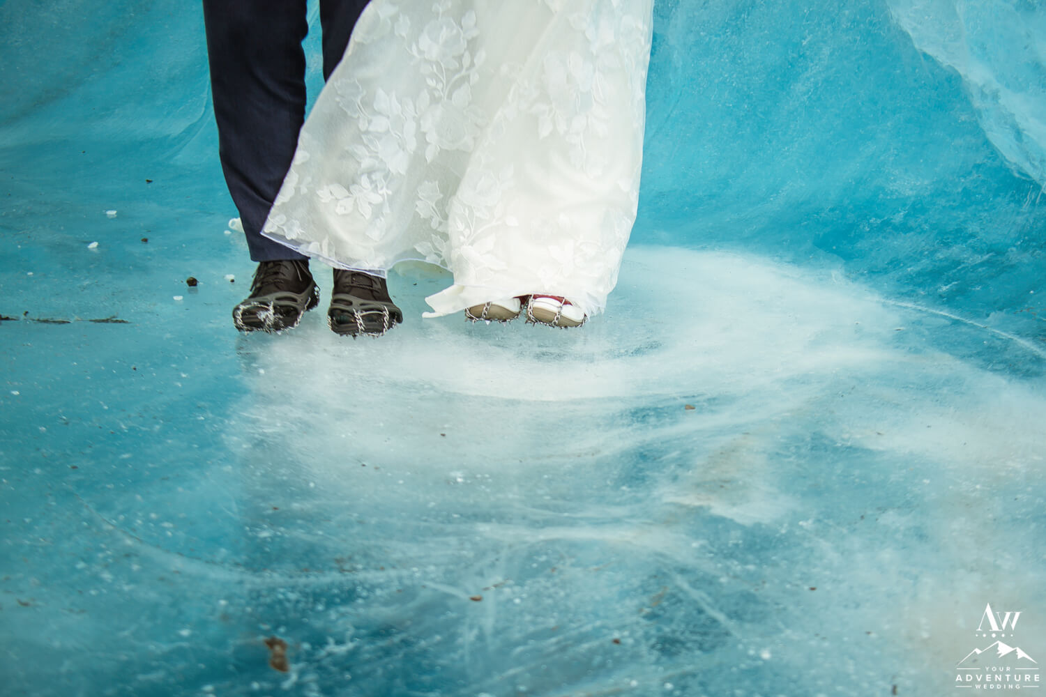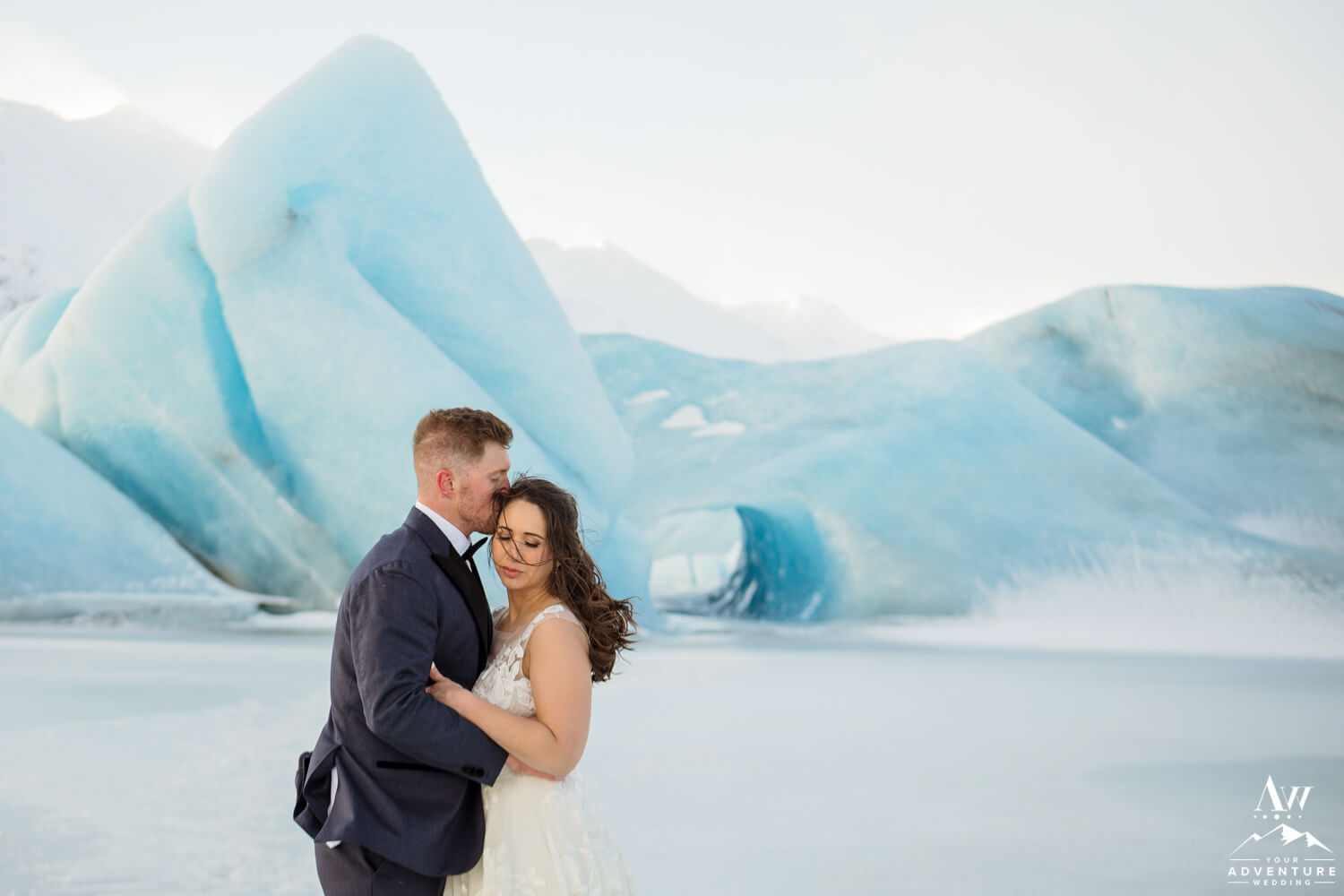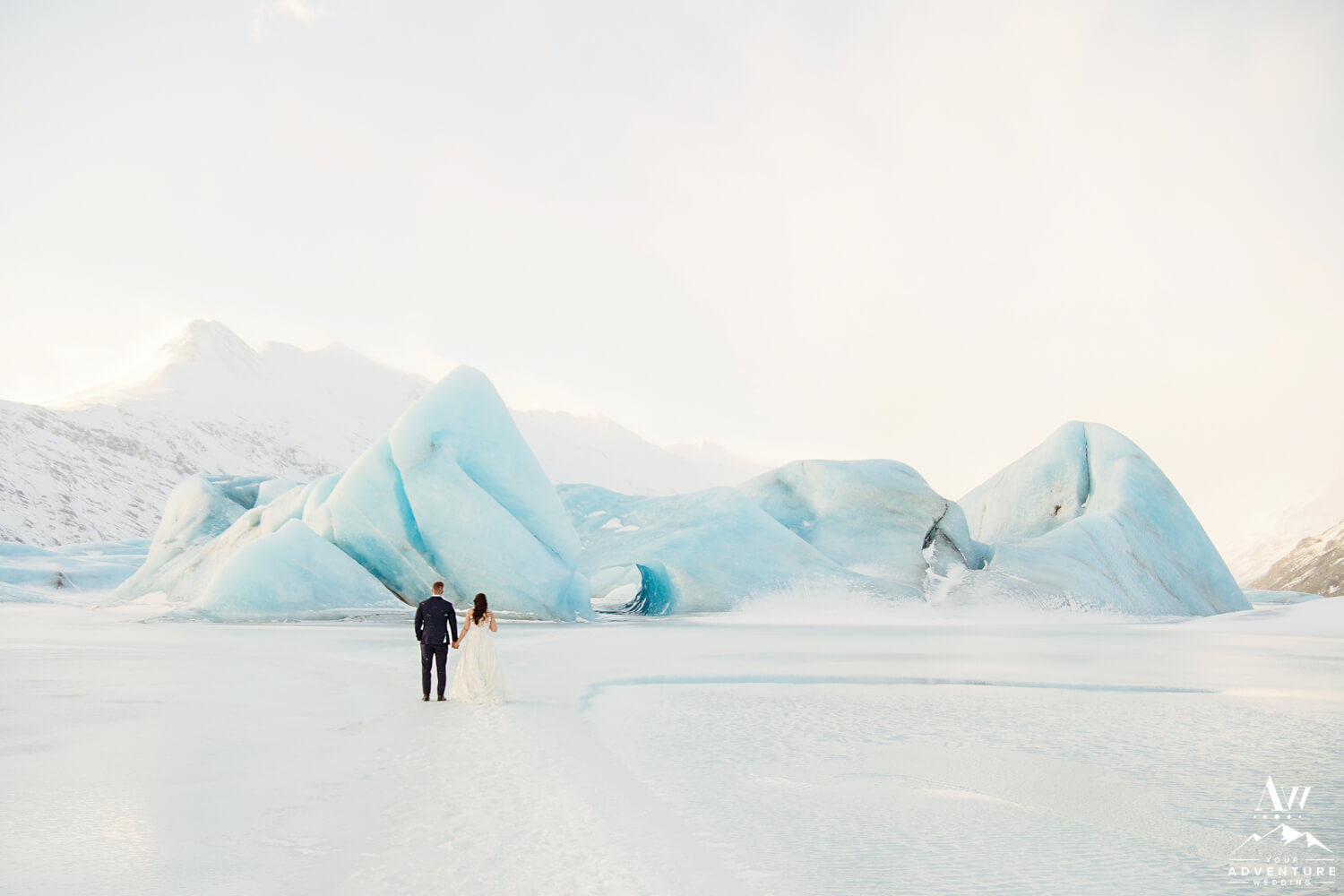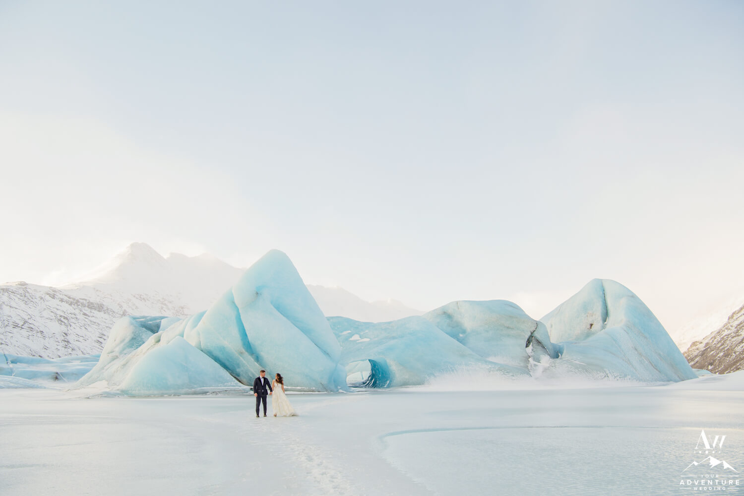 Leading up to their elopement adventure, we could not say for sure what blue ice cave would be an option for them. Usually not until the week of are we able to know what ice caves will be viable options and what the conditions could look like (IE, glacier walking crampons versus ice climbing ones, etc). However, all of the plans included some sort of blue ice cave. Meanwhile, one of our plans for the day included a frozen lake hiking elopement! For example, the morning brought cold enough temperatures to make the magical fairytale frozen glacier lake elopement and ceremony inside of a floating iceberg reality.