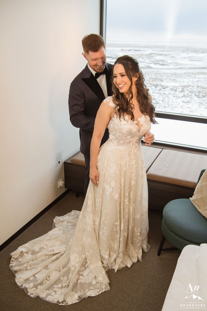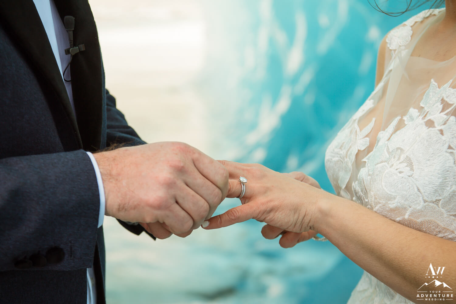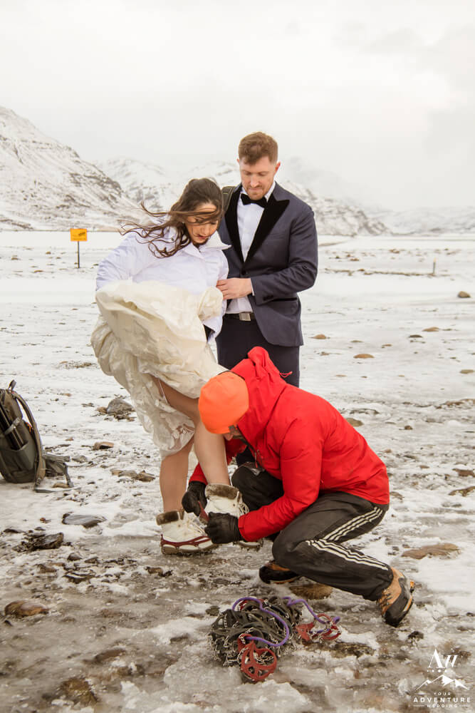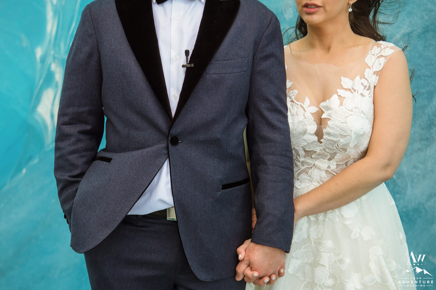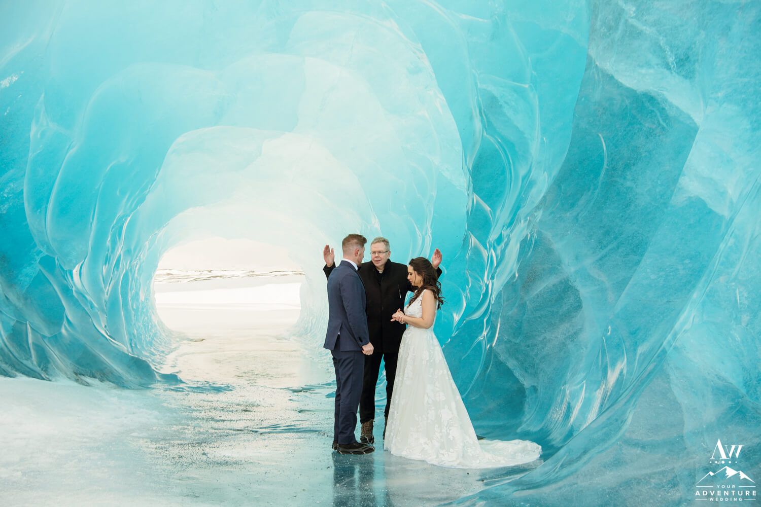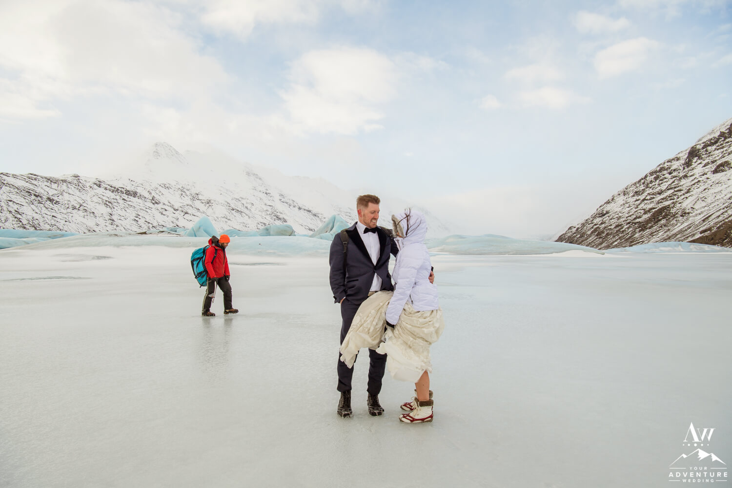 Leading up to their elopement adventure, we could not say for sure what blue ice cave would be an option for them. Usually not until the week of are we able to know what ice caves will be viable options and what the conditions could look like (IE, glacier walking crampons versus ice climbing ones, etc). However, all of the plans included some sort of blue ice cave. Meanwhile, one of our plans for the day included a frozen lake hiking elopement! For example, the morning brought cold enough temperatures to make the magical fairytale frozen glacier lake elopement and ceremony inside of a floating iceberg reality.