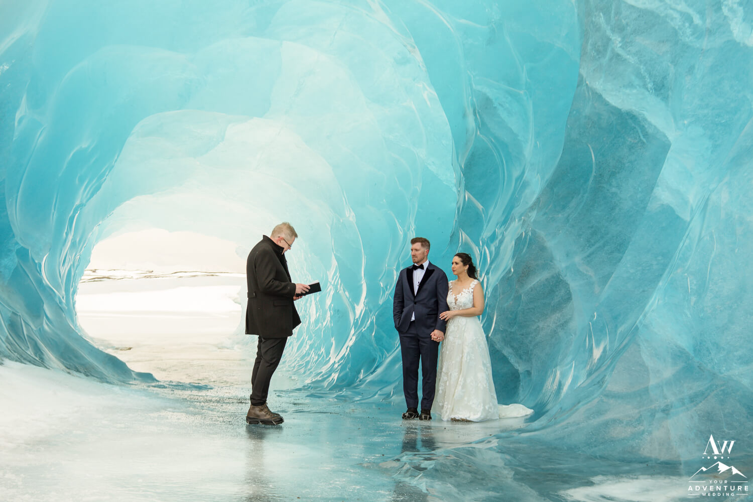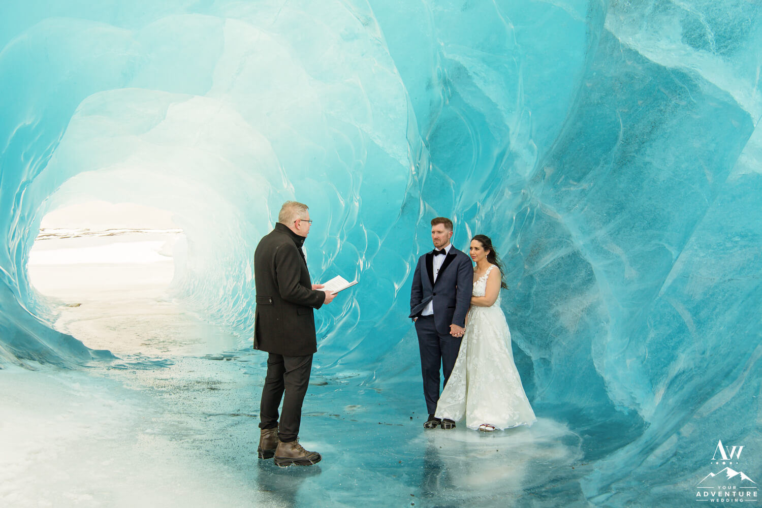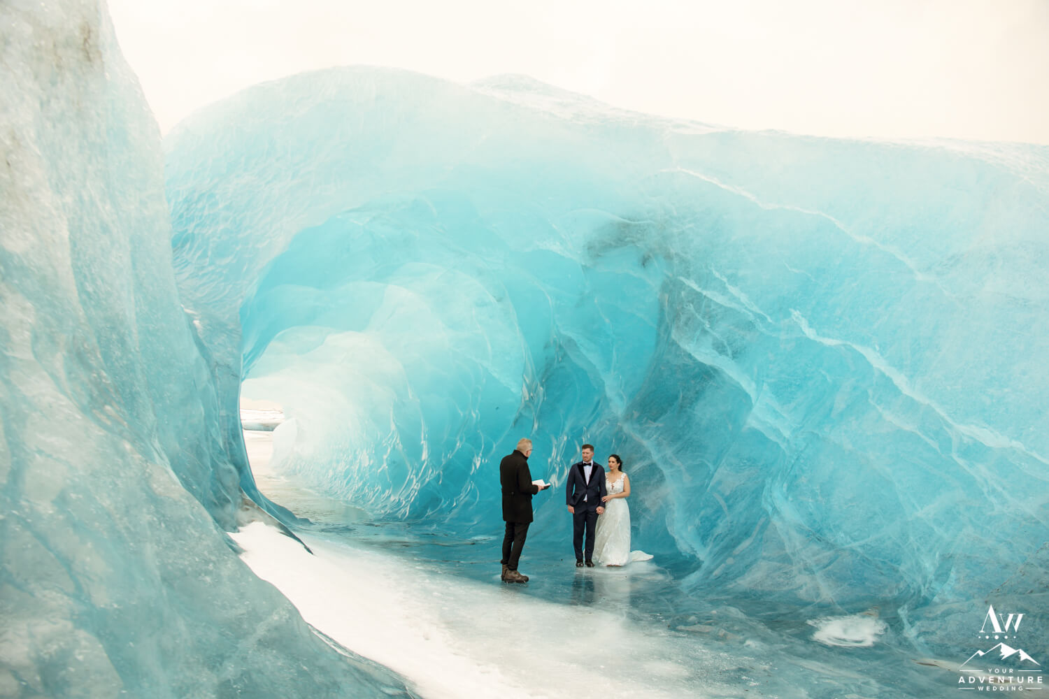 Additionally, as we alluded to earlier these two were also seeking a Iceland wedding ceremony location which looked and felt like another planet. So when the arrived, they were speechless!! The wind whirled through the cave but these two held such an intimate inspiring frozen glacier lake elopement ceremony inside of that very blue ice cave!