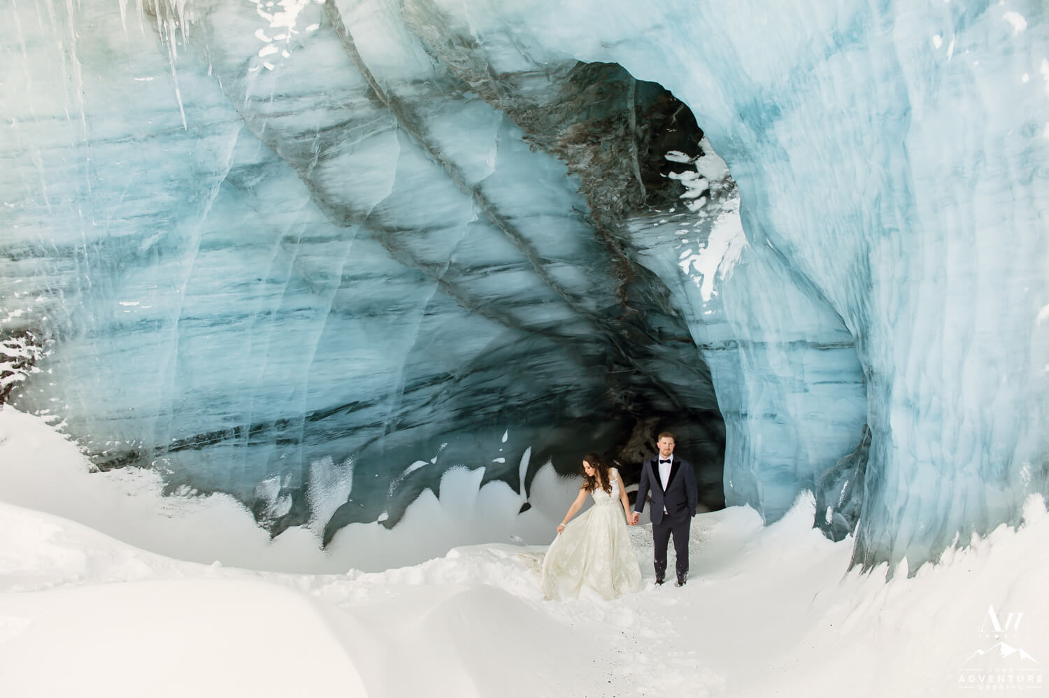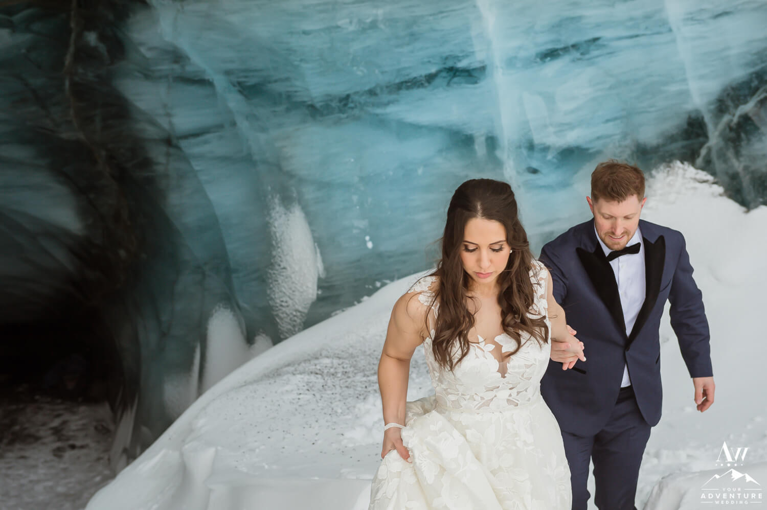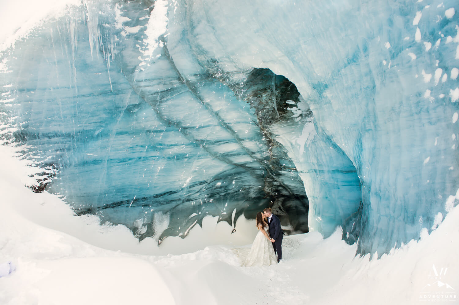 Having a hiking honeymoon is totally a thing and doing it during winter in Iceland gives you bragging rights, truly! These two got all dolled up again, put on their GORGEOUS Iceland wedding dress and suit to hike to one of the most BEAUTIFUL ice caves we have ever found. Well, I should rephrase and say second to their once-in-a-lifetime ice cave in an iceberg on a frozen lake, that is! Kristina was so hardcore she didn’t even wear leggings under her dress!! And your heart will melt when you see Ben helping her through the snow on the hike during their Iceland honeymoon adventure…