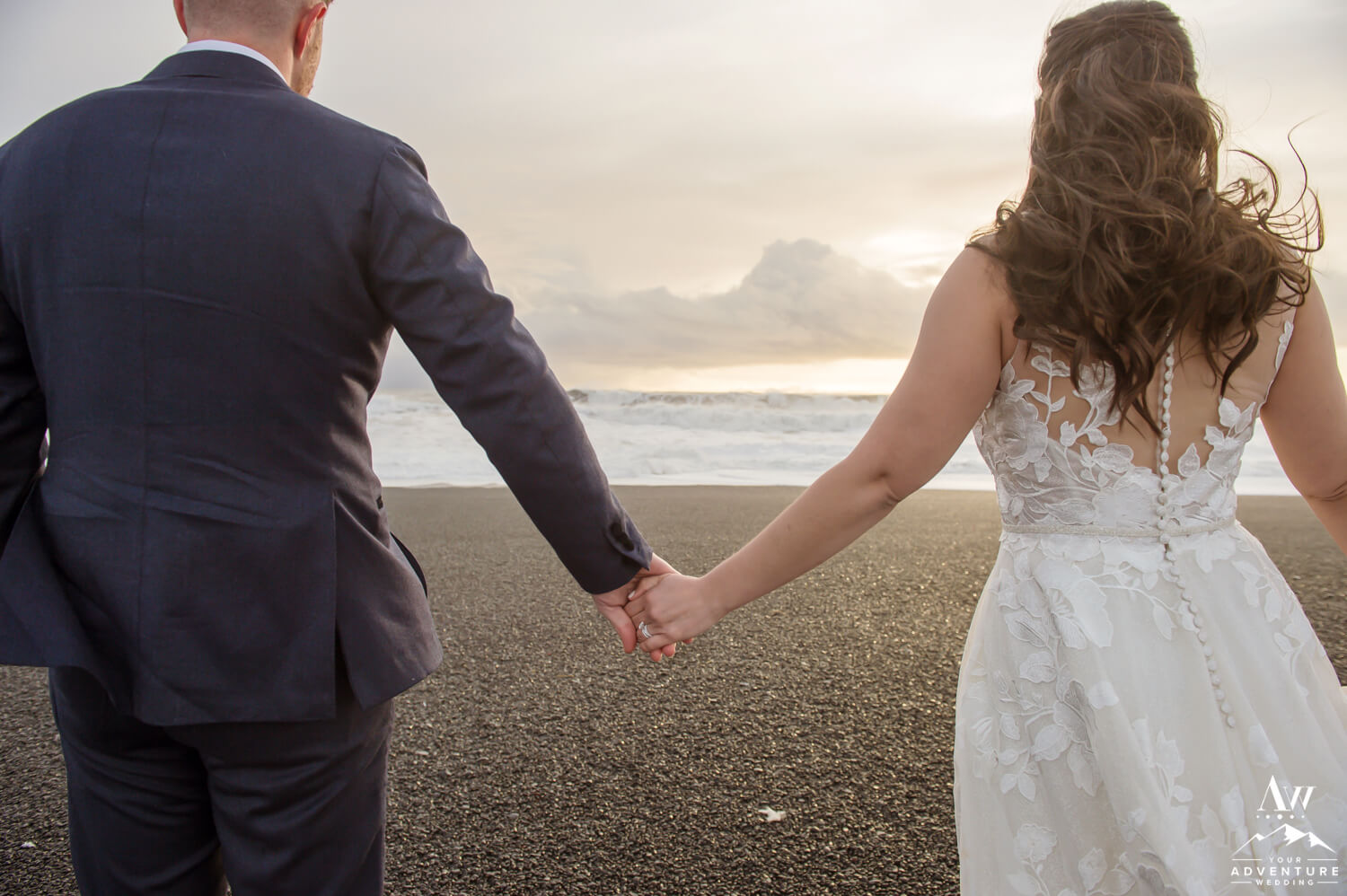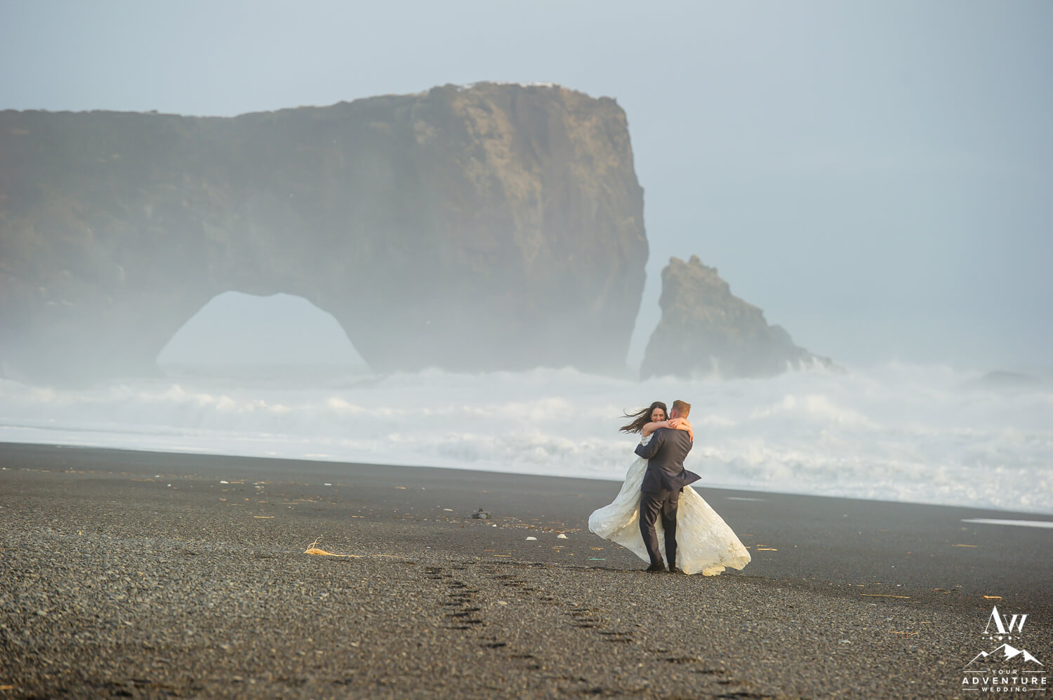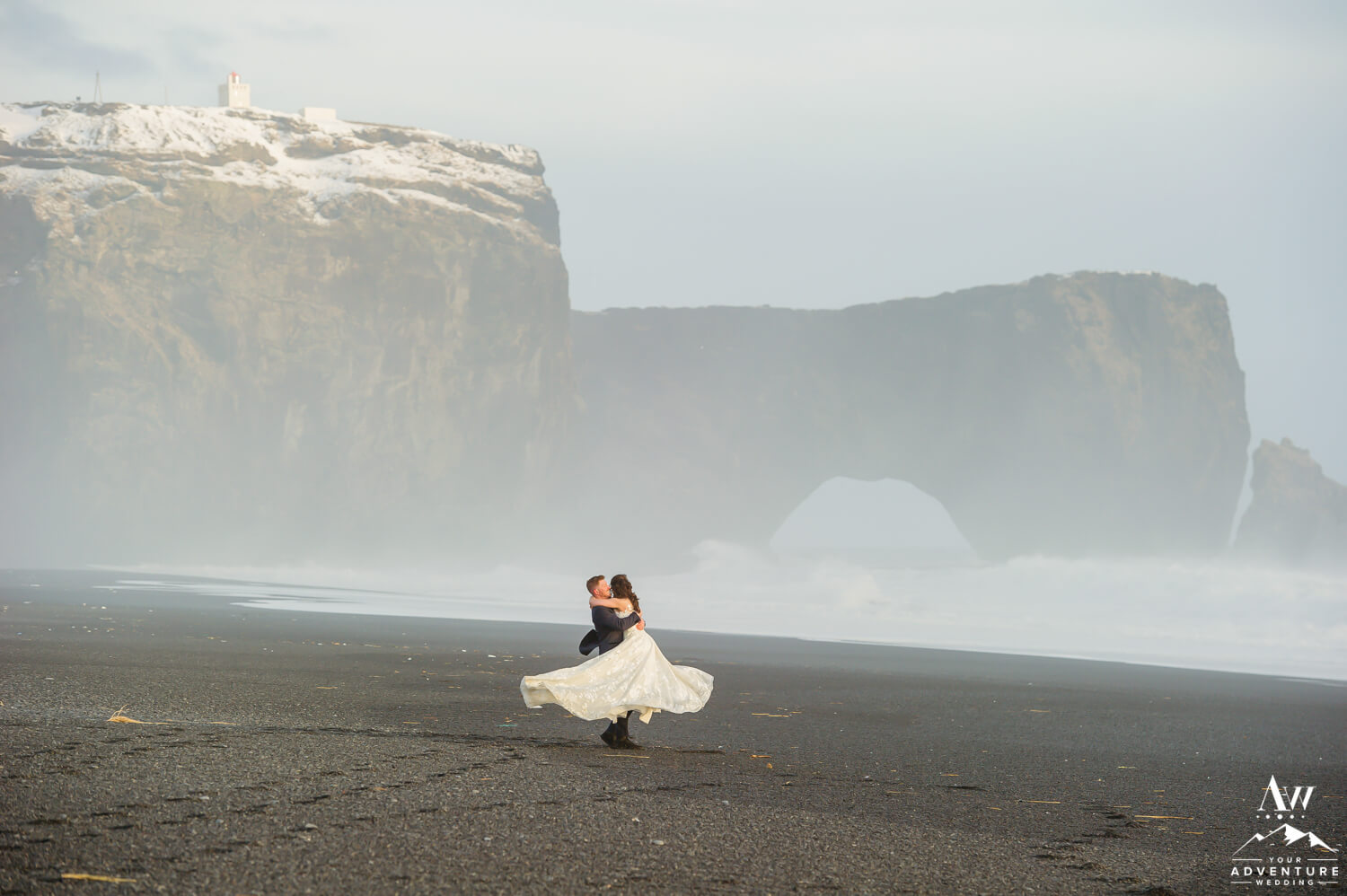 What could be more powerful than experiencing an incredible winter sunset on a private black beach during your Iceland honeymoon adventure? Ummm, nothing! …Okay, so maybe their unforgettable elopement adventure! This specific beach is wild, but seeing the waves like this swelling to an extraordinary height was NUTS!! Honestly, even though these two were really cold, they hugged each other and laughed even harder through it! After all, preparing for the weather in Iceland can be a challenge all in itself! But oh so #worthit!