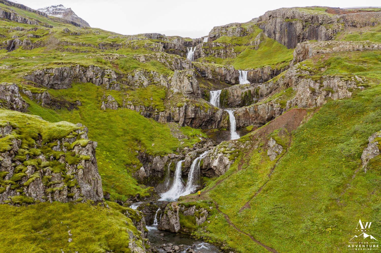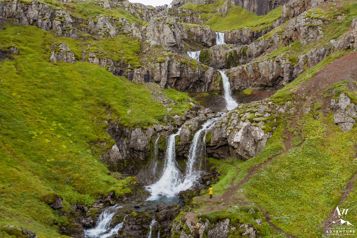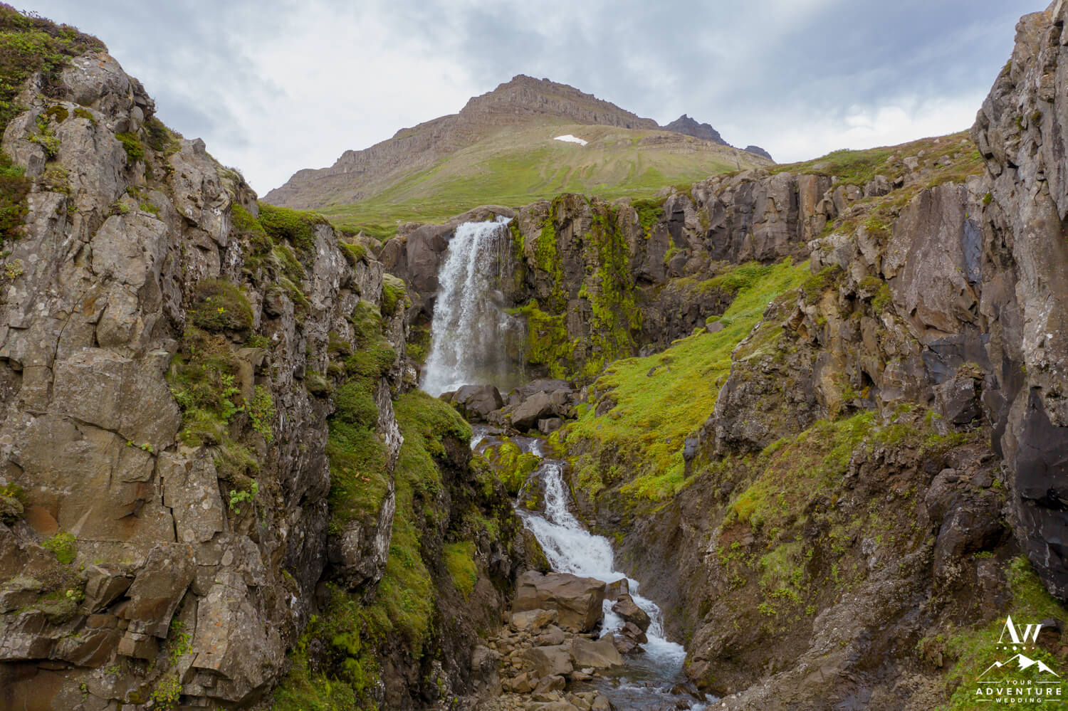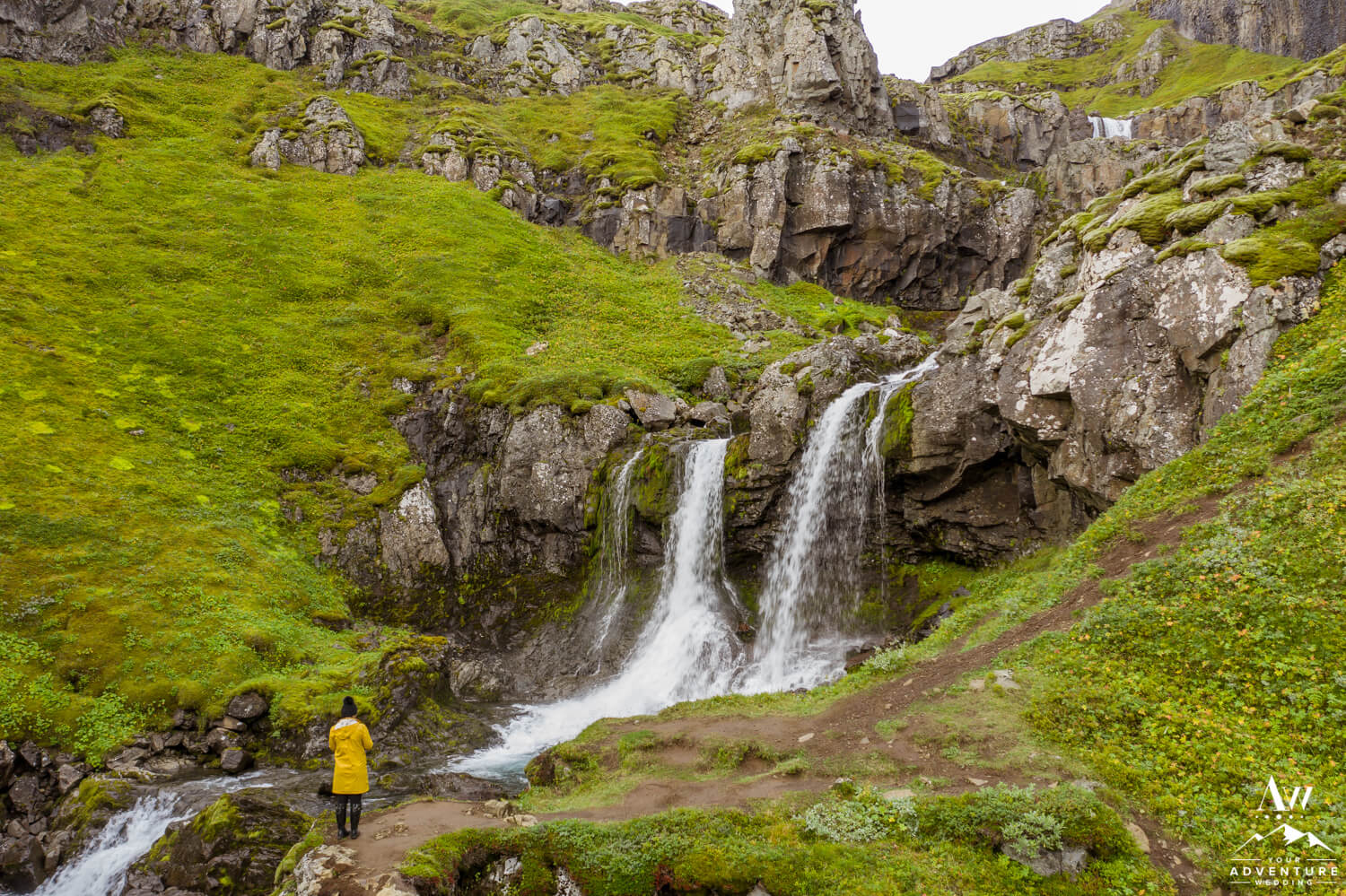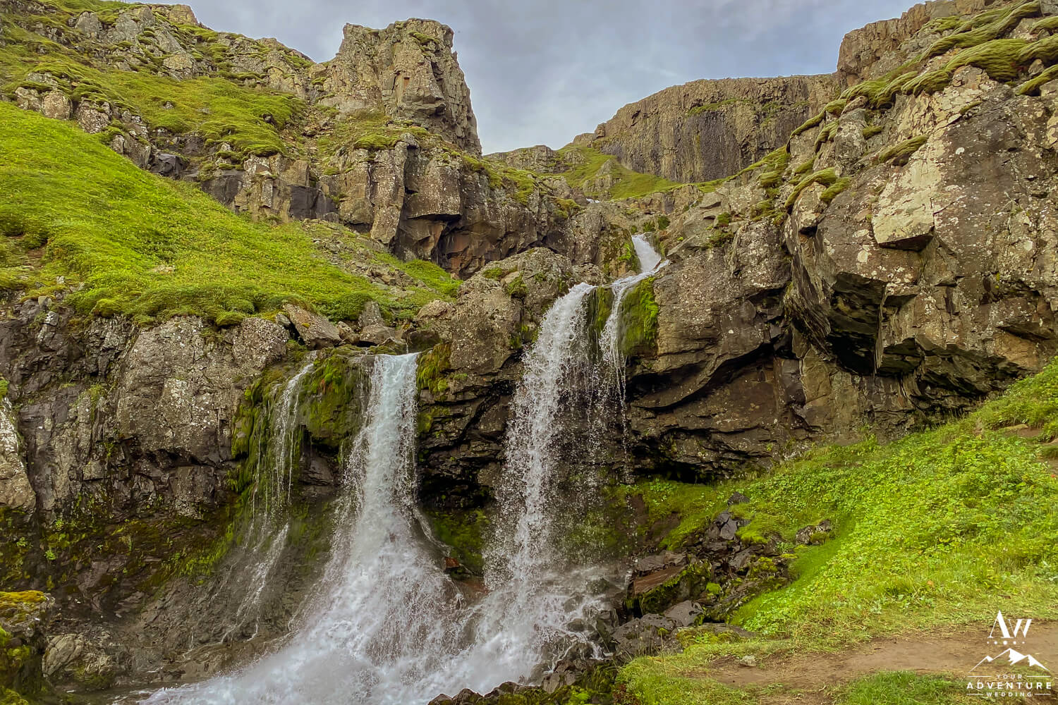 One of the most stunning waterfalls is the first thing you come to when you come down from the mountain pass coming into the fjord. Firstly there is small parking lot you can pull into. Next, you’ll follow the sign and clear path over a small river and continue to follow the path back. As you’ll see it’s an easy 5 minute walk back. If you have time, you can take your time hiking to the different levels of the Klifbrekkufossar Waterfall. Note: Proper hiking boots are needed if you wish to go to all of the levels (and they help stabilize you when it’s muddy too).
