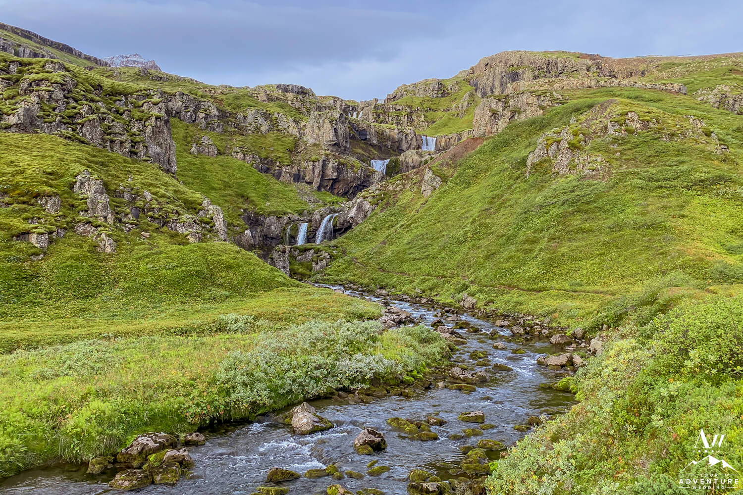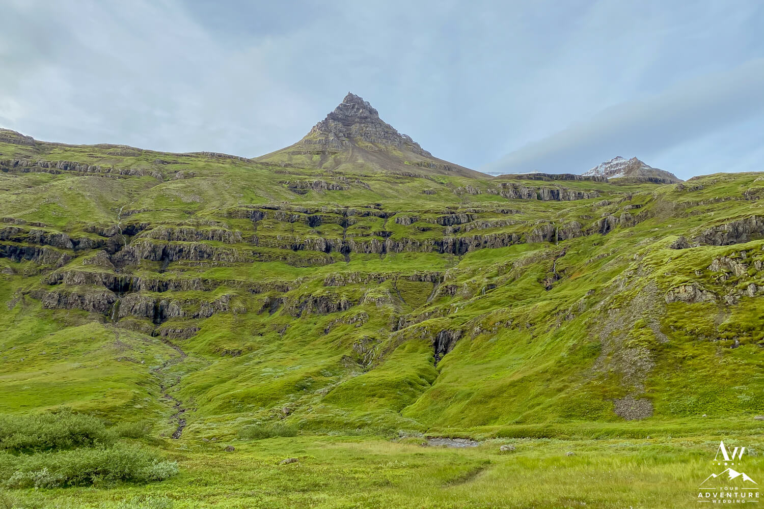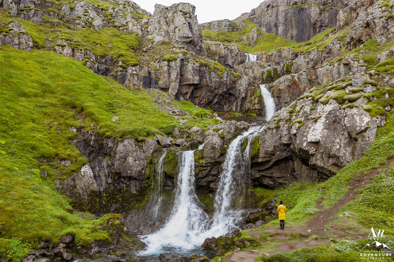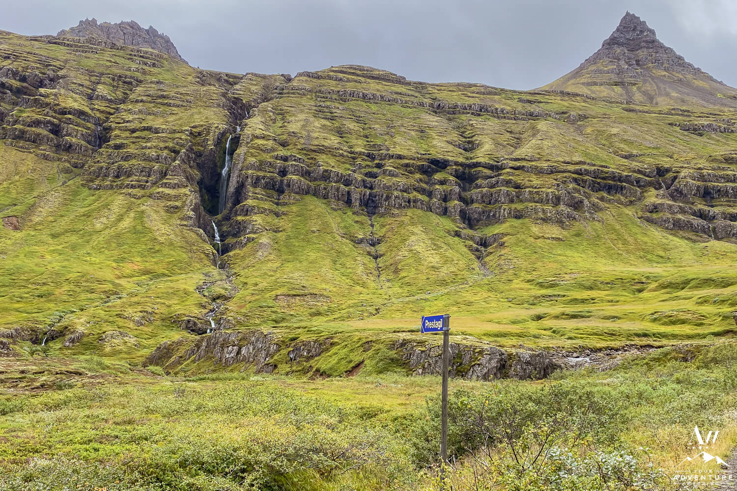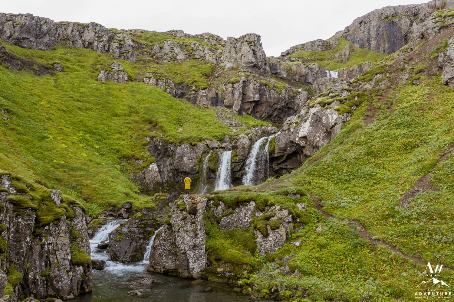 One of the most stunning waterfalls is the first thing you come to when you come down from the mountain pass coming into the fjord. Firstly there is small parking lot you can pull into. Next, you’ll follow the sign and clear path over a small river and continue to follow the path back. As you’ll see it’s an easy 5 minute walk back. If you have time, you can take your time hiking to the different levels of the Klifbrekkufossar Waterfall. Note: Proper hiking boots are needed if you wish to go to all of the levels (and they help stabilize you when it’s muddy too).