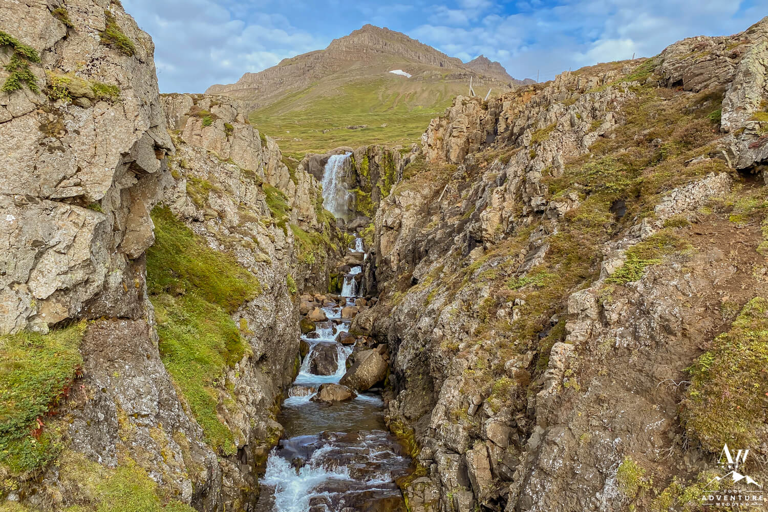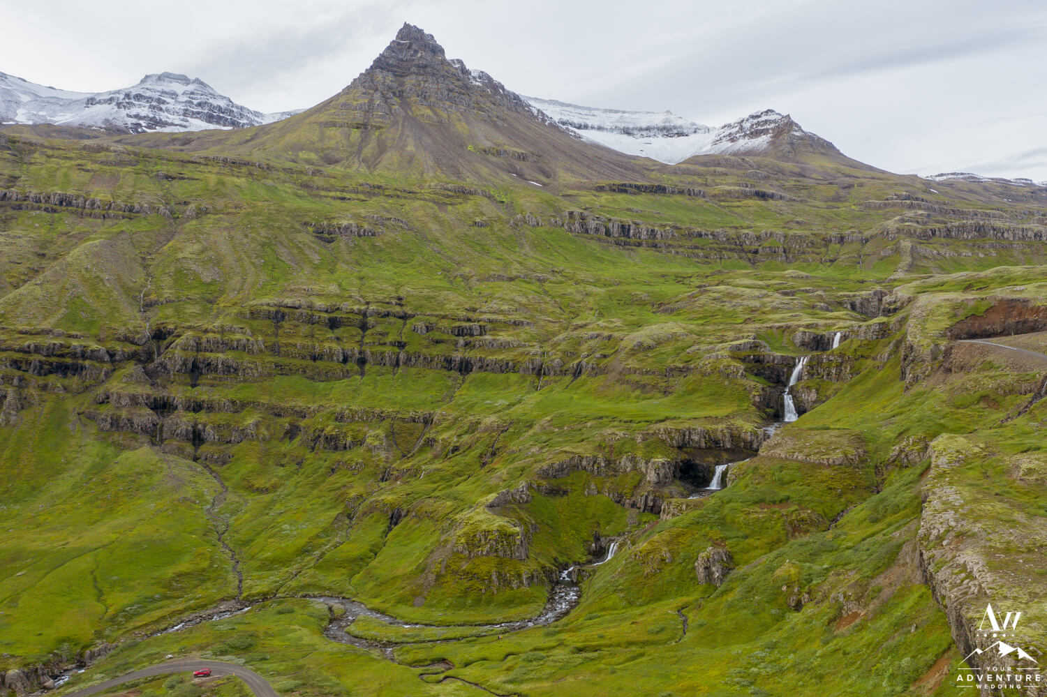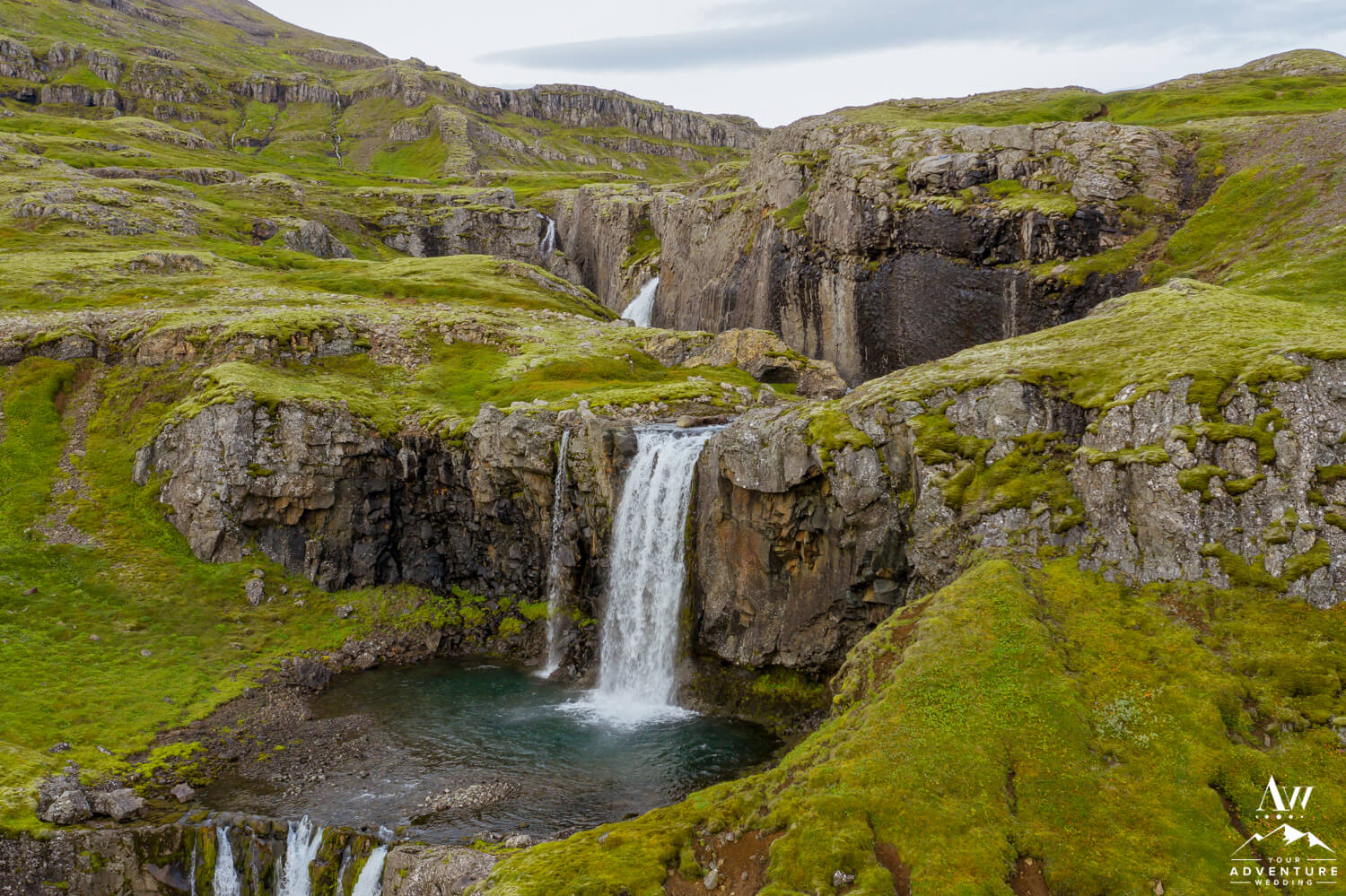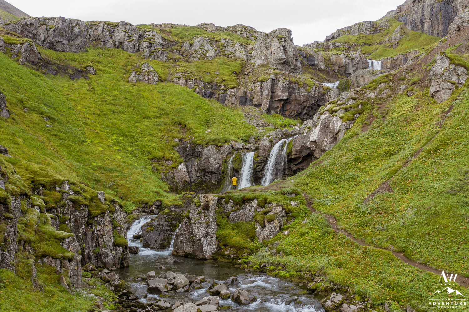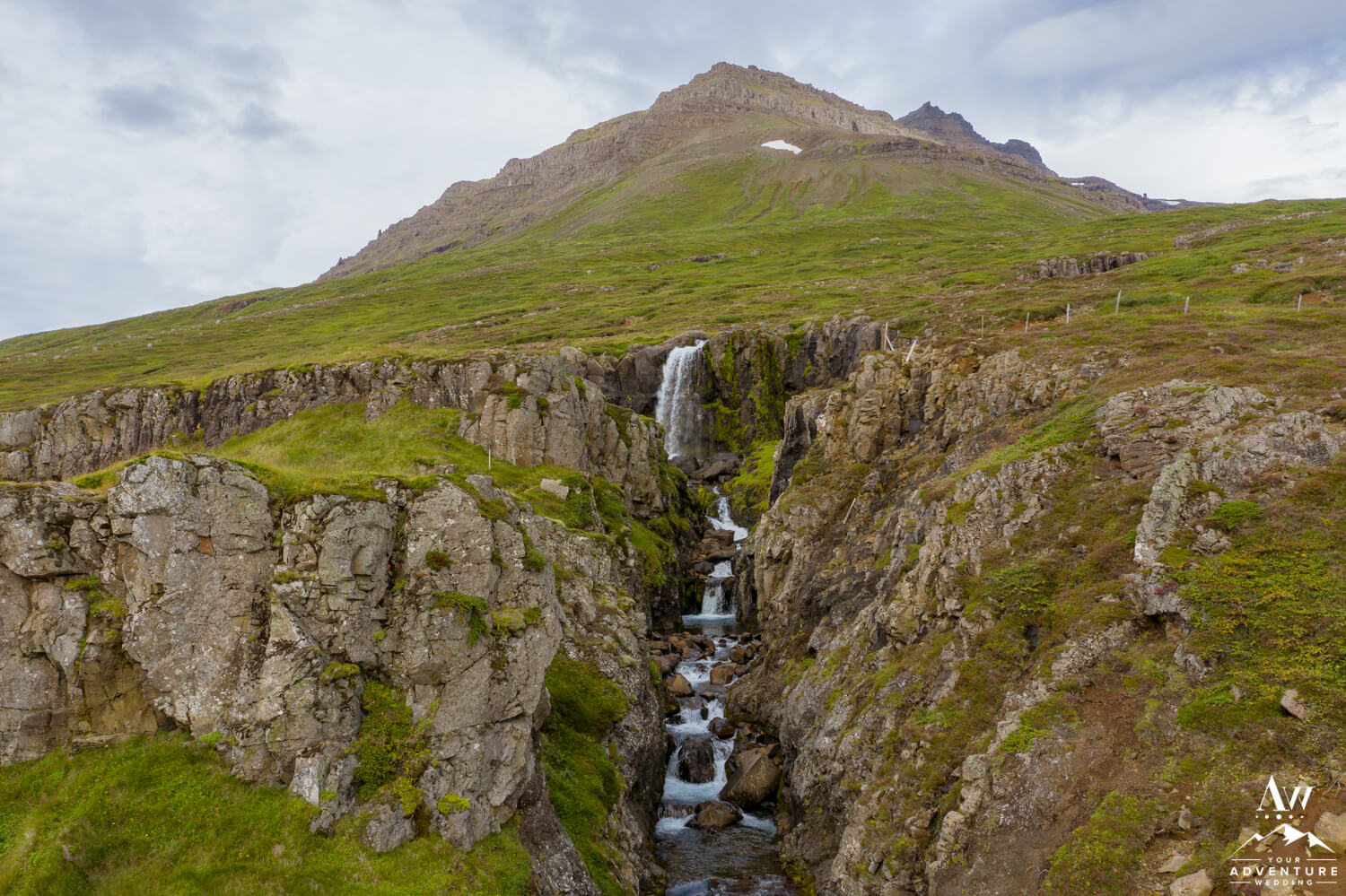 One of the most stunning waterfalls is the first thing you come to when you come down from the mountain pass coming into the fjord. Firstly there is small parking lot you can pull into. Next, you’ll follow the sign and clear path over a small river and continue to follow the path back. As you’ll see it’s an easy 5 minute walk back. If you have time, you can take your time hiking to the different levels of the Klifbrekkufossar Waterfall. Note: Proper hiking boots are needed if you wish to go to all of the levels (and they help stabilize you when it’s muddy too).