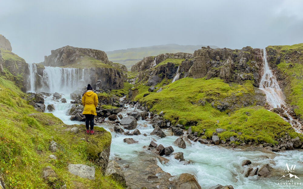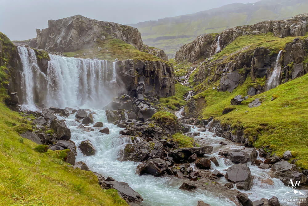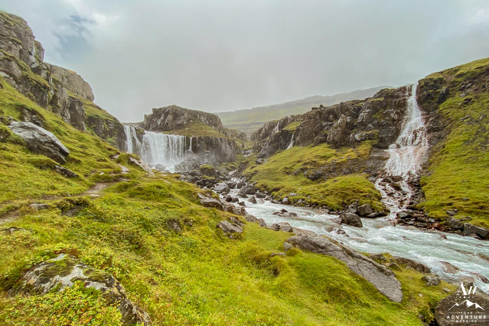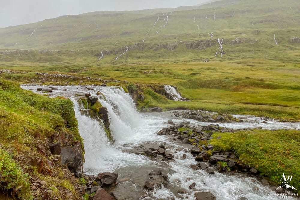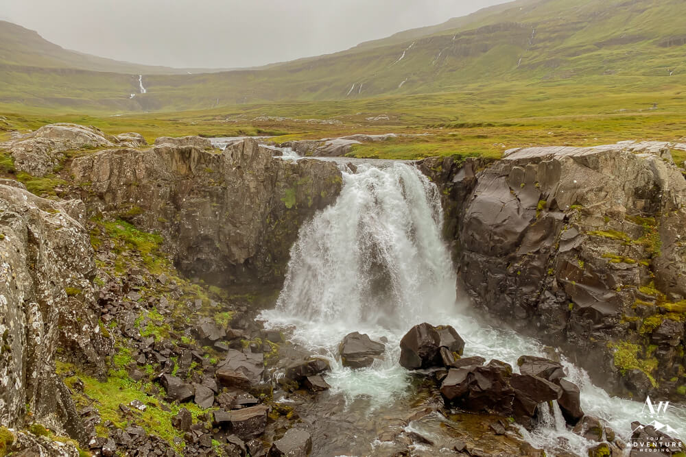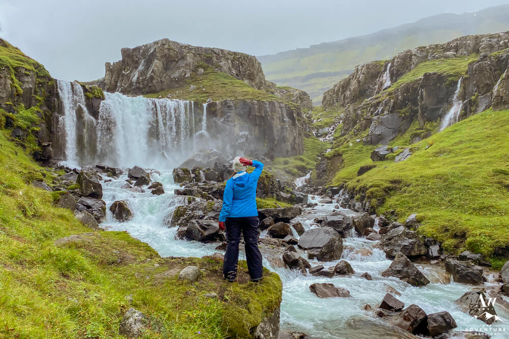 Believe it or not, hiking to the top of the first set of valley waterfalls within Vestdalsfossar reveals another pretty waterfall to marvel over! For example, this specific waterfalls name is Arnarfossar. Here you will also have a 360 degree view of the fjord too!