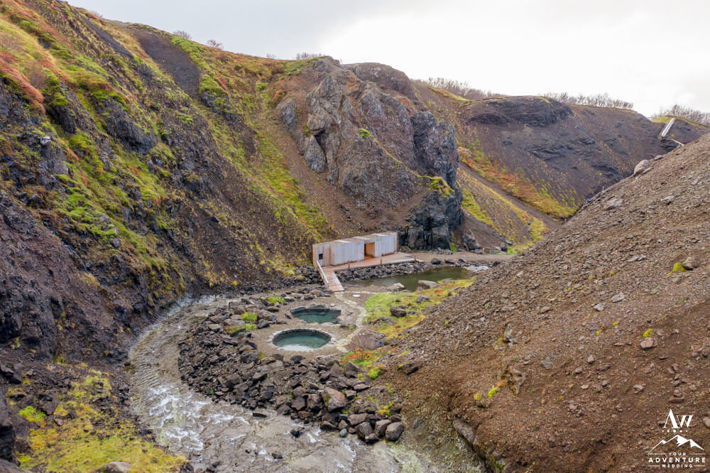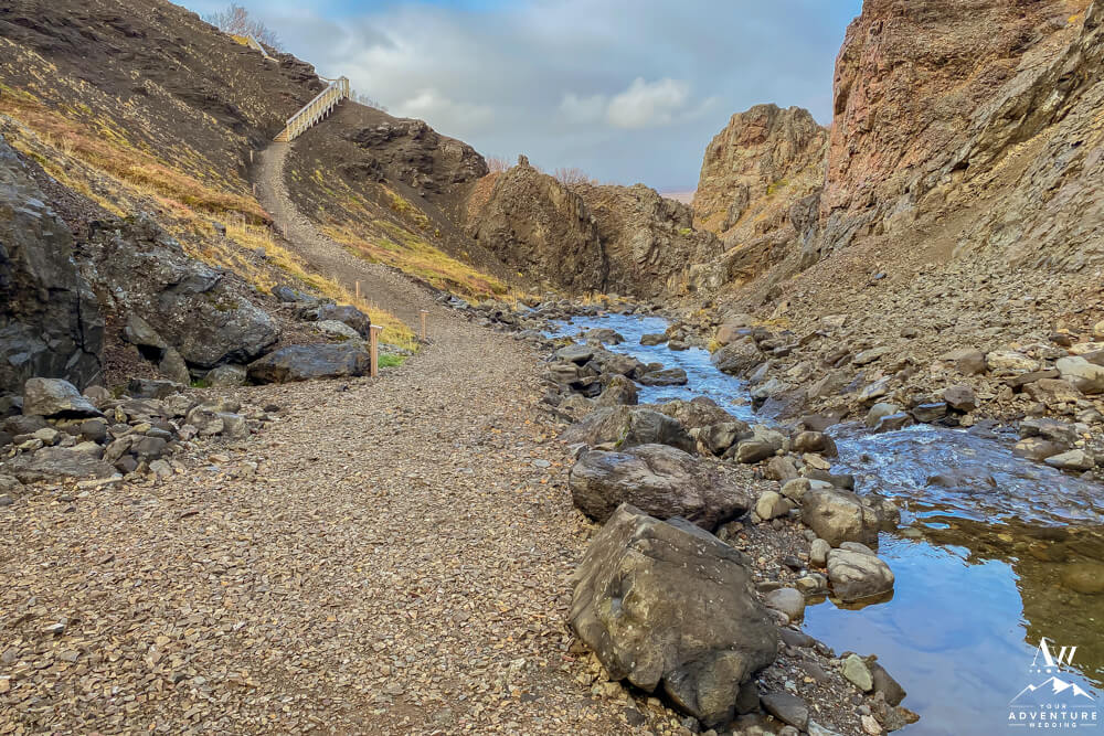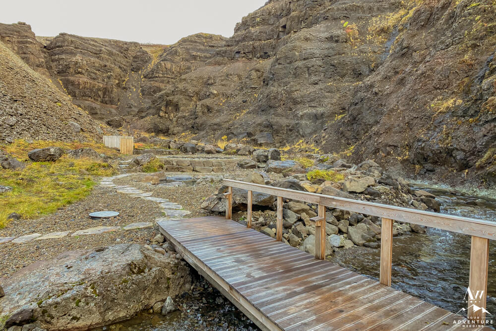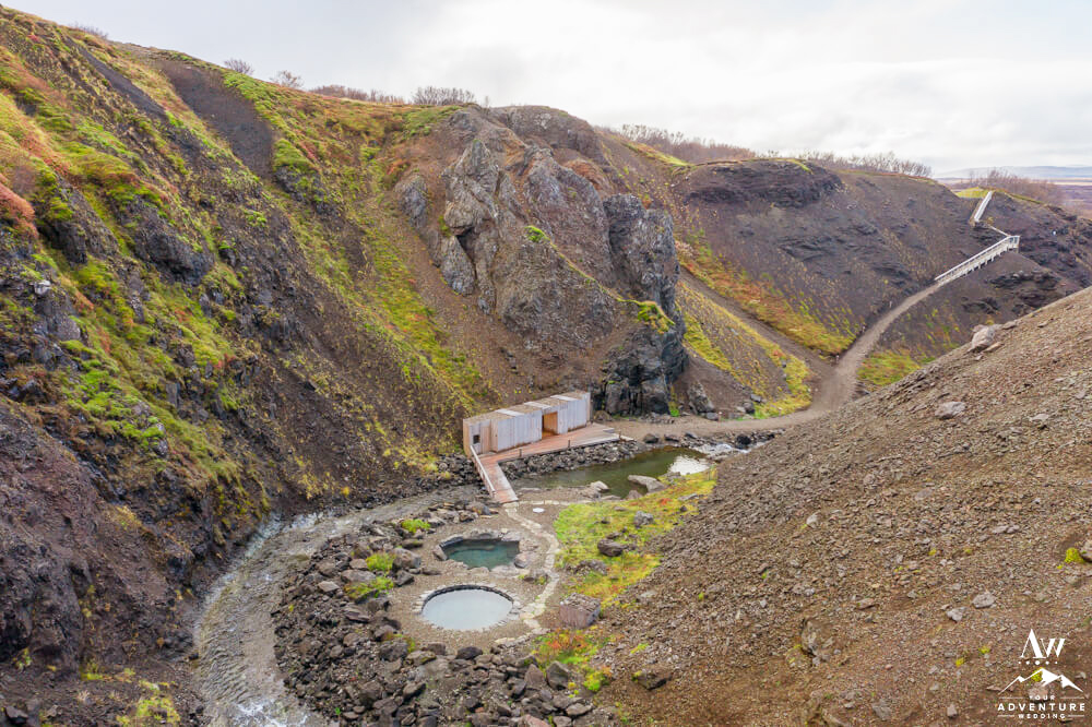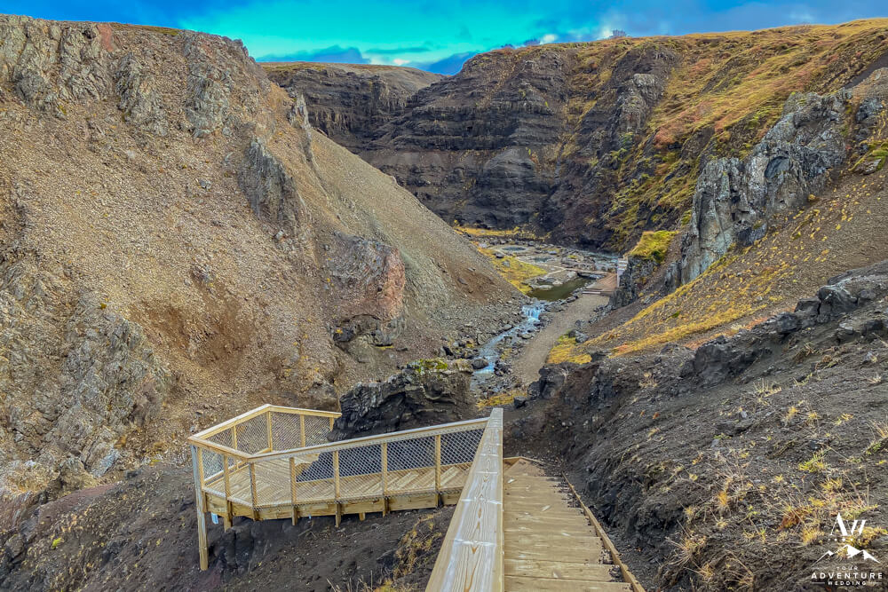 You’ll continue on through 5-10 more minutes through the the Icelandic “forest,” take a few turns and cross a chained gate road. Then you’ll get the feeling you’re almost there as another canyon comes into view. Next, you’ll cross another fence and take the stairway down where the baths come into full view. Be excited your trek is rewarded with warm hot springs!