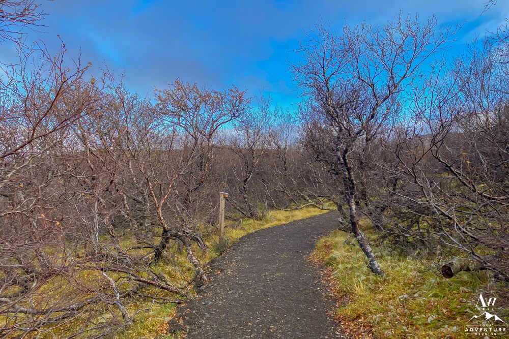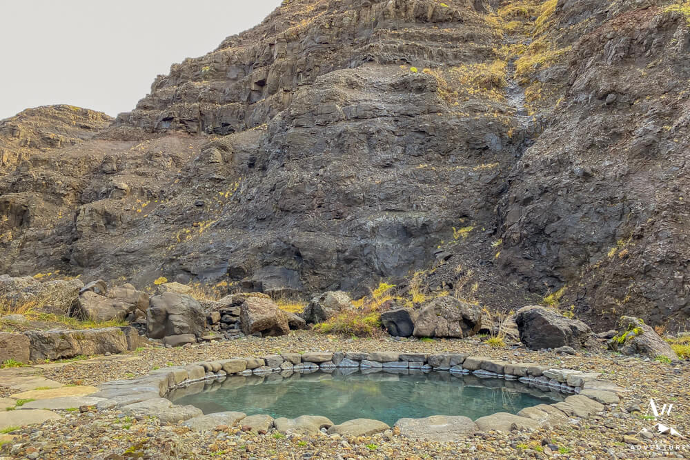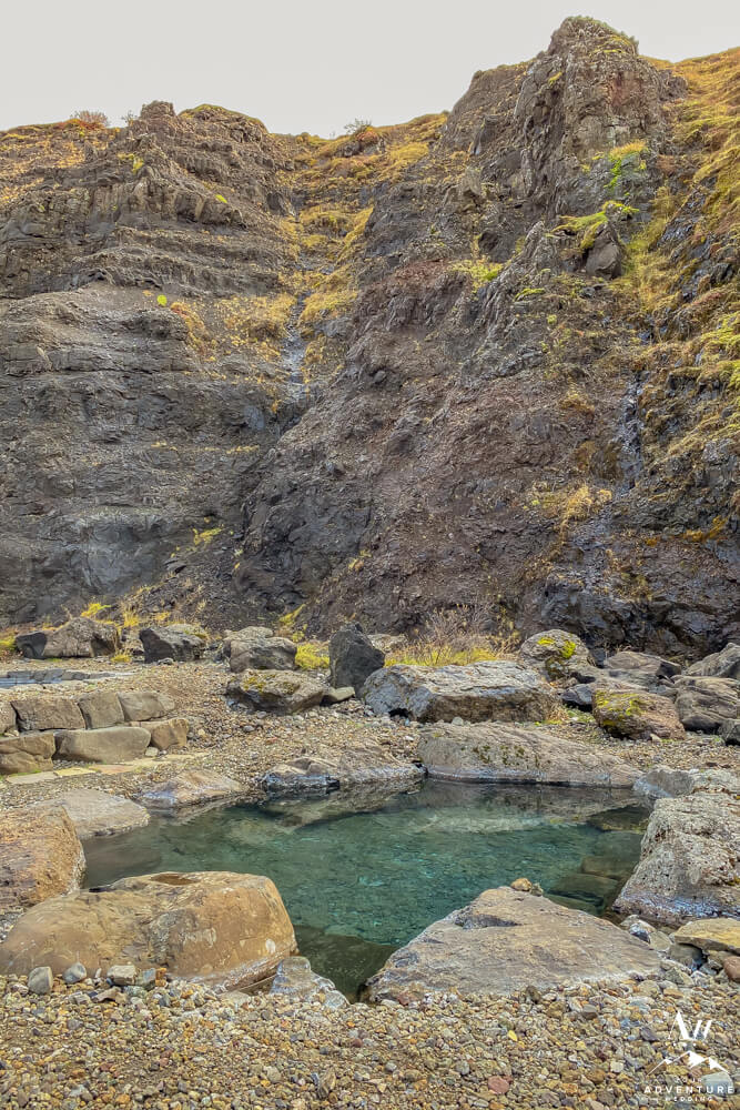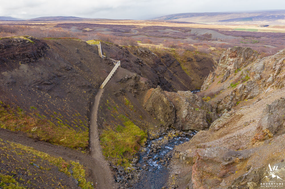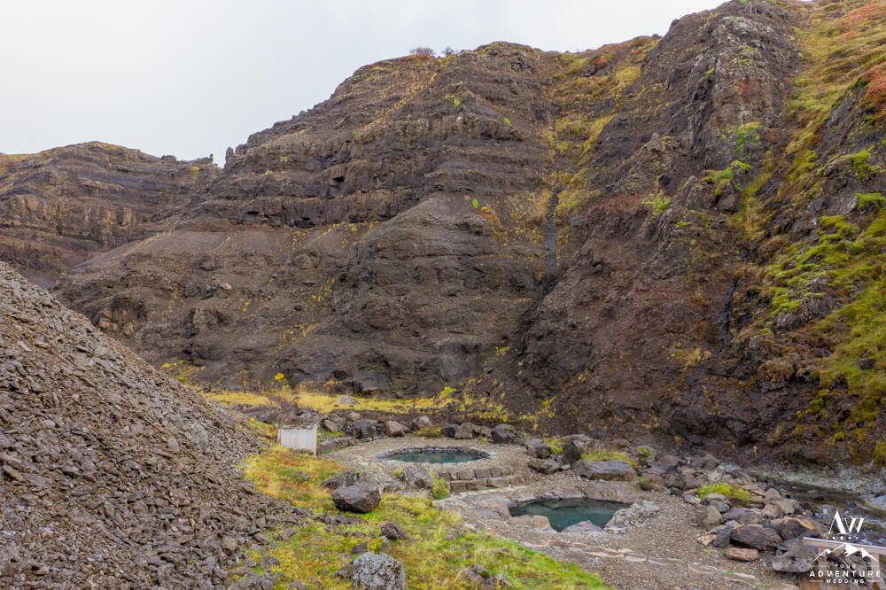 You’ll continue on through 5-10 more minutes through the the Icelandic “forest,” take a few turns and cross a chained gate road. Then you’ll get the feeling you’re almost there as another canyon comes into view. Next, you’ll cross another fence and take the stairway down where the baths come into full view. Be excited your trek is rewarded with warm hot springs!