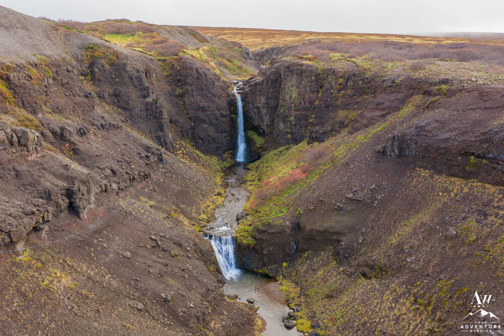 Within the first 10 minutes of the hike, you do most of the elevation.  And good news, you are rewarded with a stop at pretty waterfall!  Langifoss is a two-tiered waterfall that you view from the cliff top.  There is a viewing platform to see it from as well.