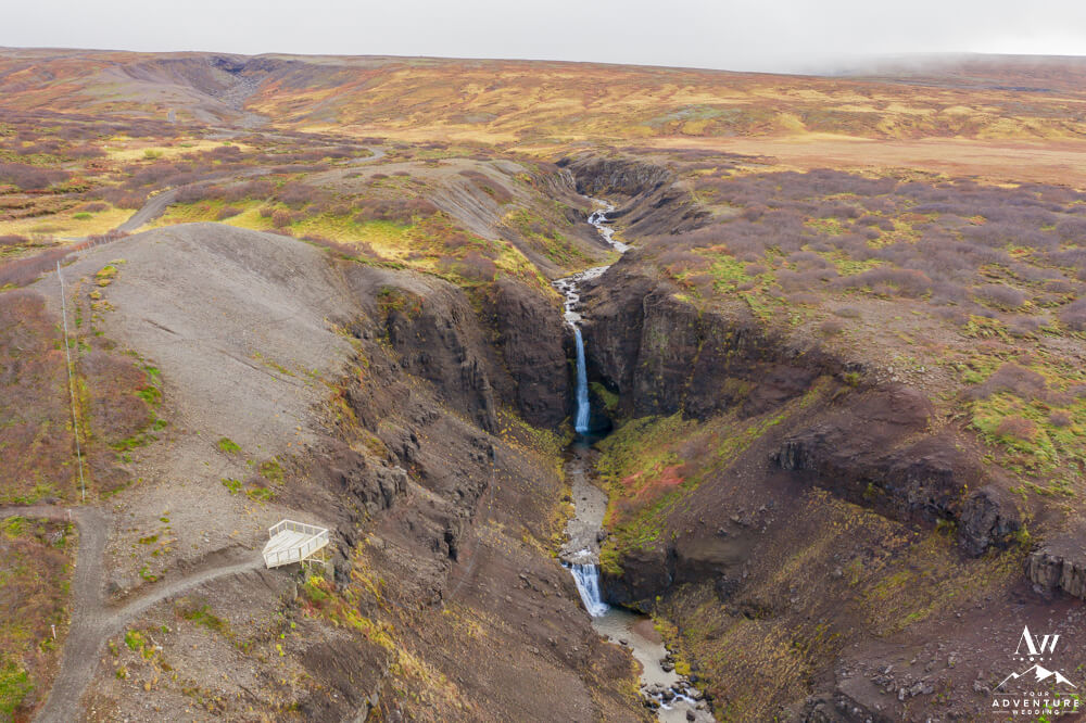Within the first 10 minutes of the hike, you do most of the elevation. And good news, you are rewarded with a stop at pretty waterfall! Langifoss is a two-tiered waterfall that you view from the cliff top. There is a viewing platform to see it from as well.