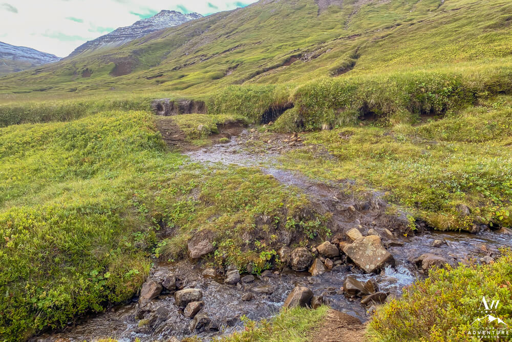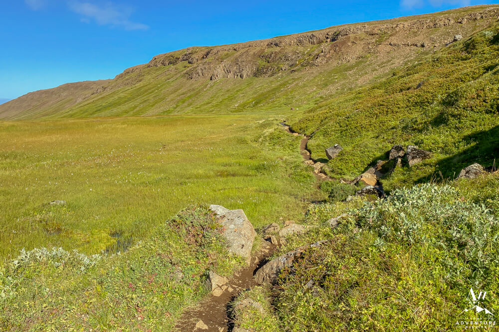 This route is the easiest if you are not an experienced hiker. To illustrate, it is pretty flat with only tiny inclines. You will hike alongside of Rjupnafell and not have any steep elevation to conquer. And just a small waterfall / river crossing here and there. But know if there is a lot of rain the week of your hike, the valley retains water and is swampy. So if the weather changes or your legs are burning from either of the two routes that you took in, it is a good idea to take this less stressful way out. << Note: This is our featured as our route out because of a weather change. >>