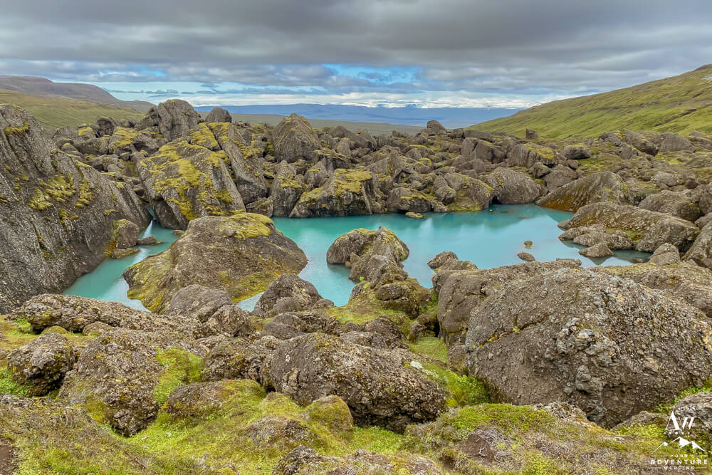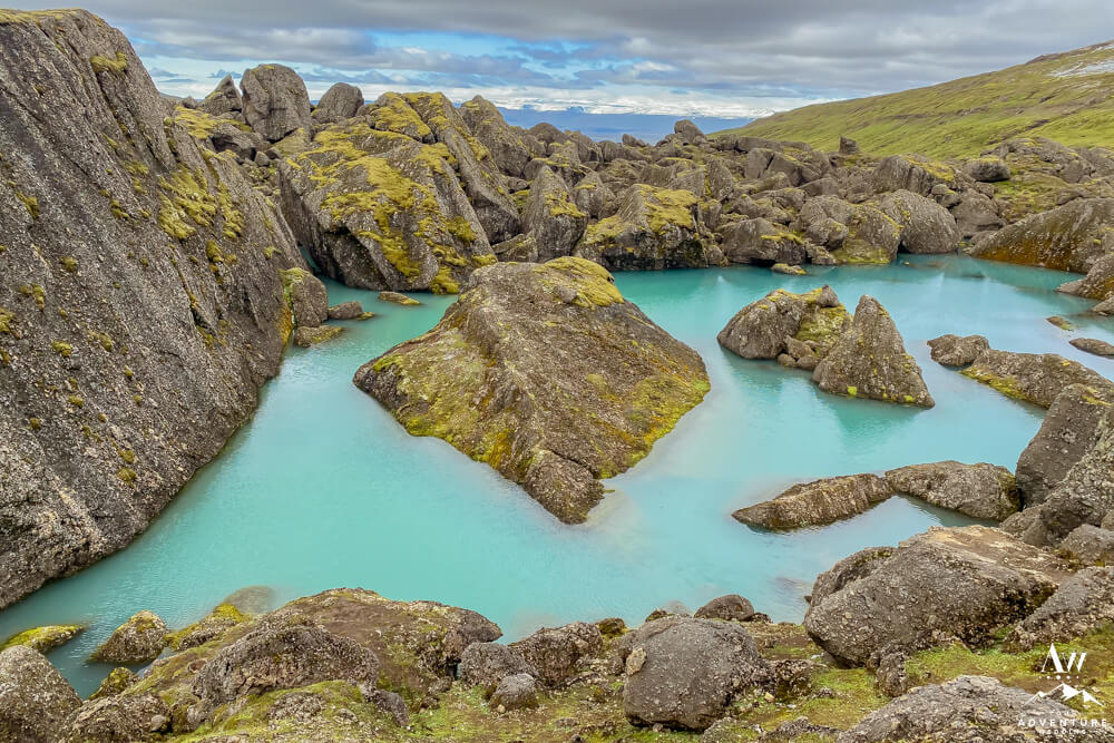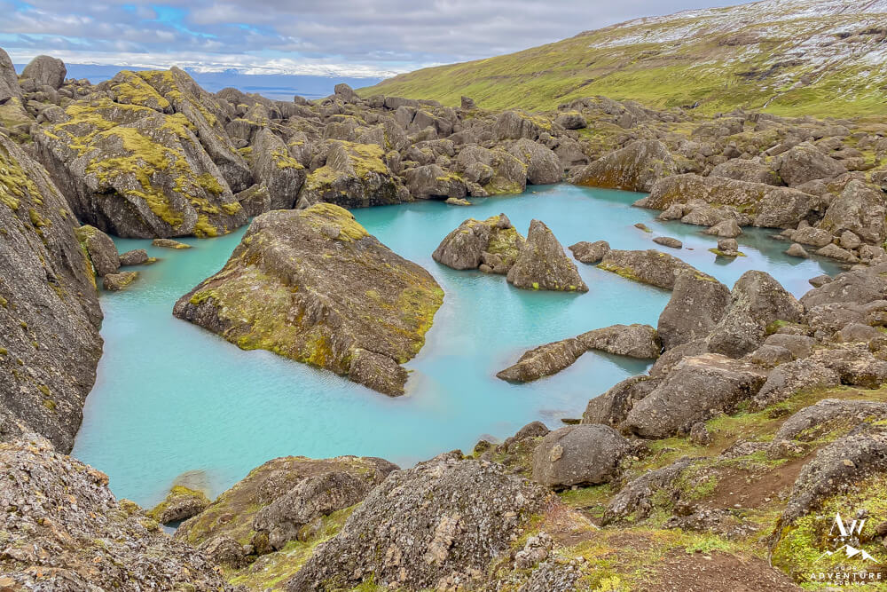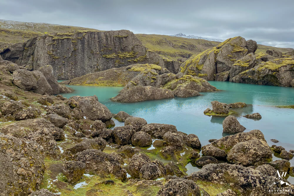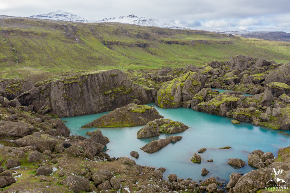 The word Stórurð (Storurd) directly translates from Icelandic to English as “large rubble.” Likewise, as we alluded to above this magical area was crafted by an Ice Age landslide. How freaking cool is that? Nature and the weather in Iceland always creates the most amazing features! The colors and textures are so nuts! To illustrate, the deep turquoise pools surrounded by giant boulders and steep mountains just sets a very otherworldly scene.