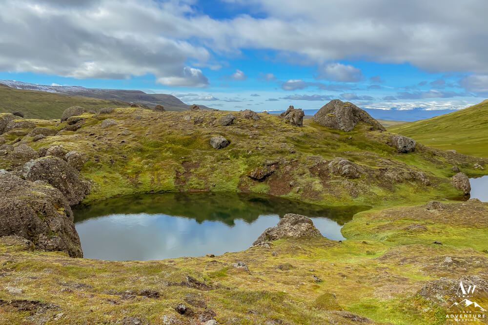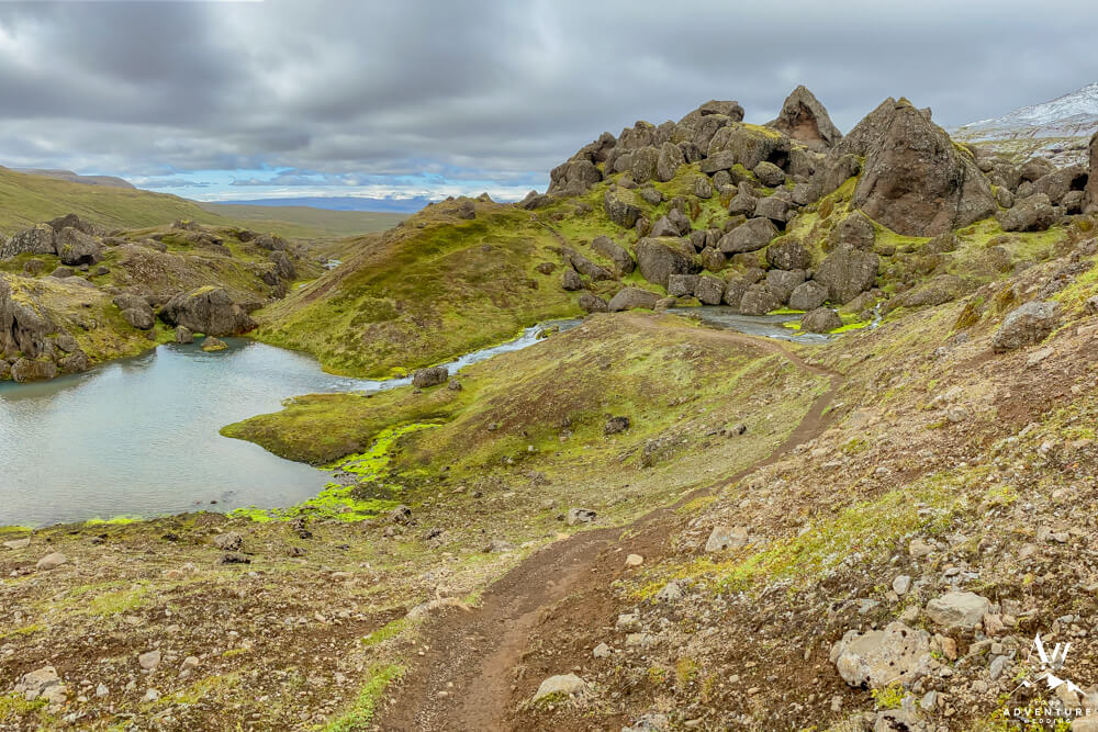 Heading to Stórurð from the parking lot at Vatnsskarð will begin and end with steep slopes and gorgeous views over the surrounding inlets. But if a extremely windy day, you may not want to take this peaked route. However, if hiking this route outside of mid-July to August you need to be prepared for the steep slopes by having proper hiking boots, crampons, hiking poles, and hiking GPS.