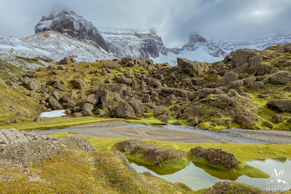 Within minutes of hiking you’ll come across your first river crossing on your way to Stórurð. Know, there are countless (I lost count after 25). Nothing of concern and most times you just skip over them by walking on rocks. But having good waterproof hiking boots are ideal. The path can be super muddy, but stay on it to make sure you protect the landscape.