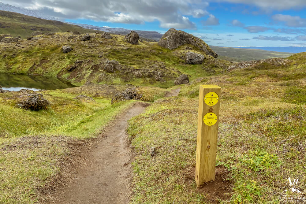 Going the Njarðvík hiking route to Stórurð there is not a large formal parking lot. On that same note, you’ll find several signs showing where you begin along with a map. You’ll follow the small yellow markers back into the valley overlooking gorgeous mountains. We began our hike at 8:30am.