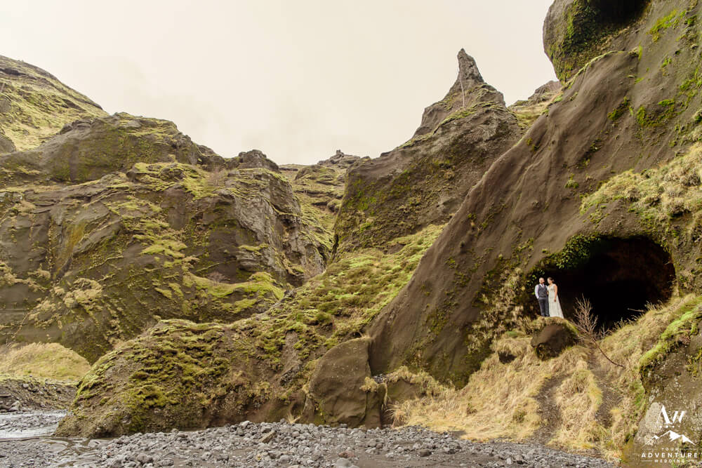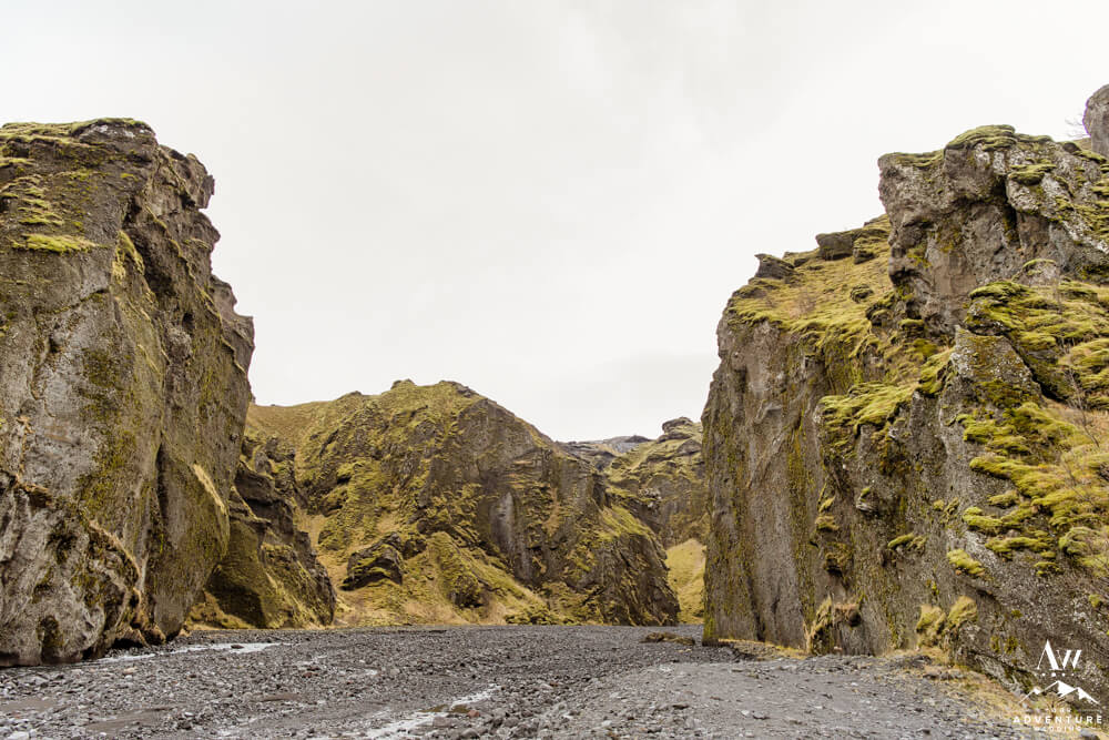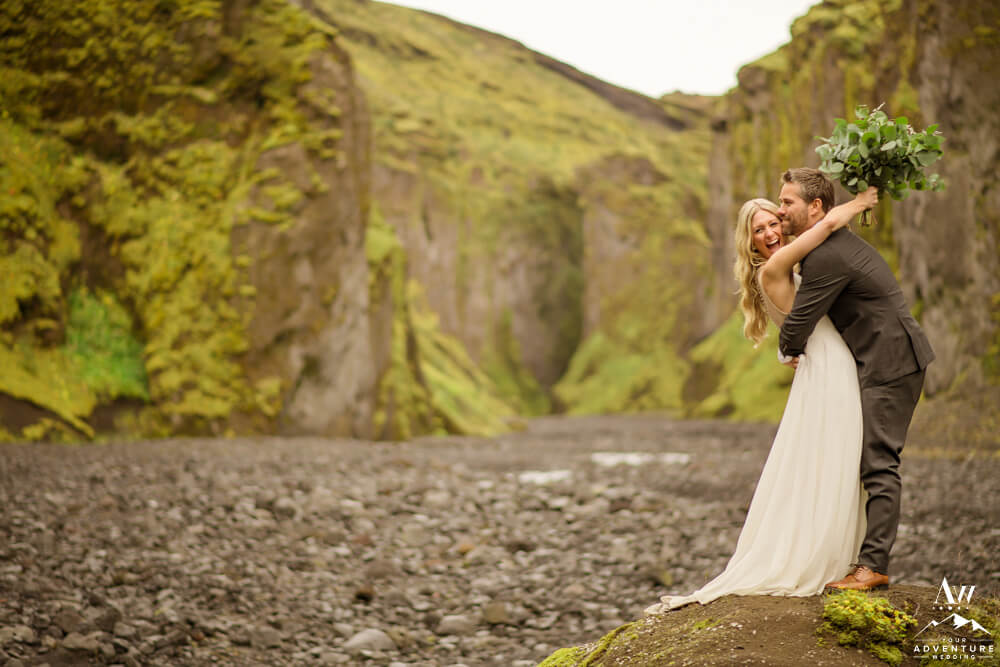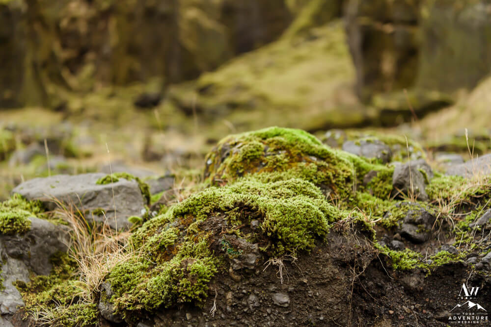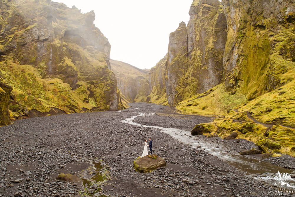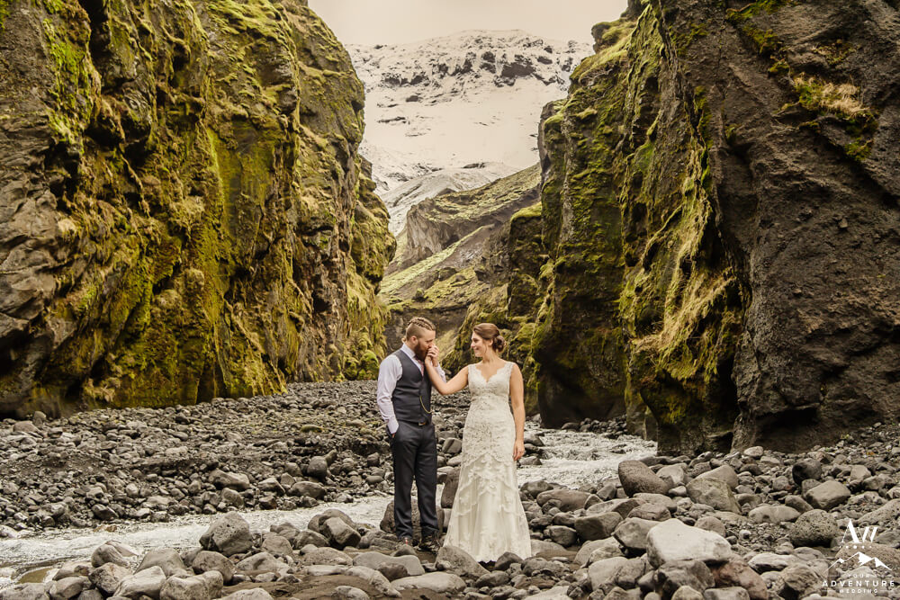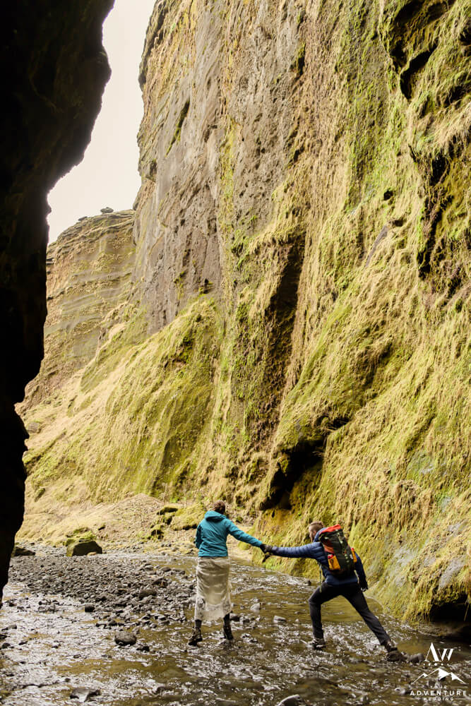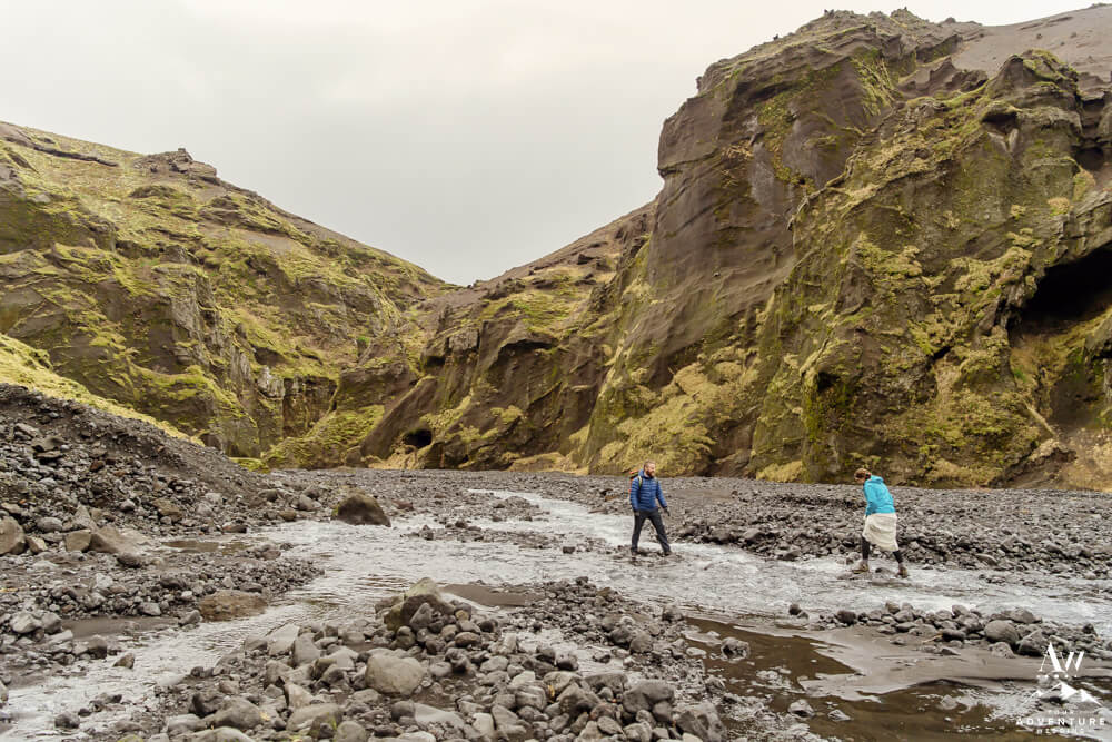 After you park your 4×4 truck and grab what you need it’s time to embark on the Stakkholtsgjá hike! Be aware there are no signs, ropes, barriers, or trail markers at all as of when we wrote this Iceland Wedding Planner blog post. However, it is a pretty darn straight forward trek. For example, you’ll follow the river bed back into the canyon after you pass the picnic table. Towards the right hand side, you’ll see a narrow trail that will look very worn by people / sheep and you can follow that back if you find the river bed rocks to intense of terrain for you. Overall, you can expect to be hiking for about 30 minutes one way depending on your pace.