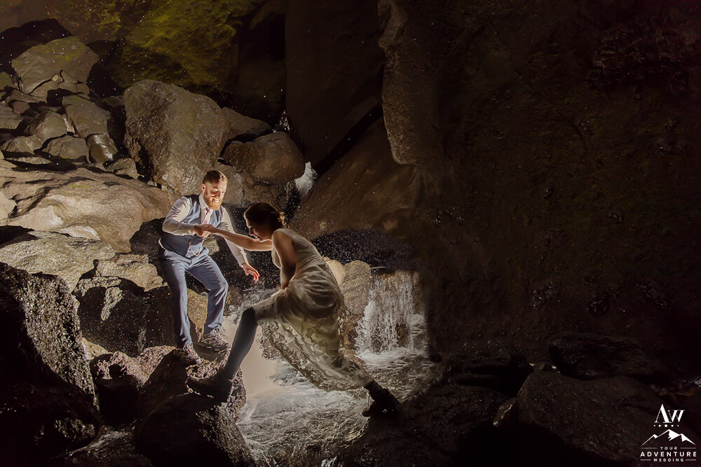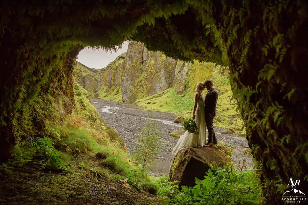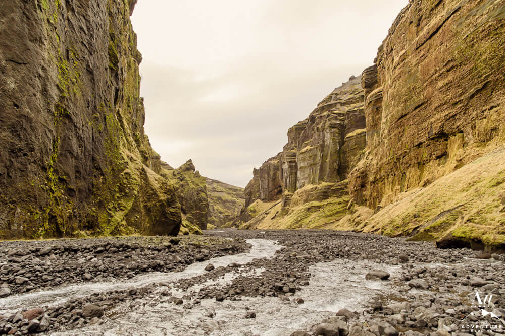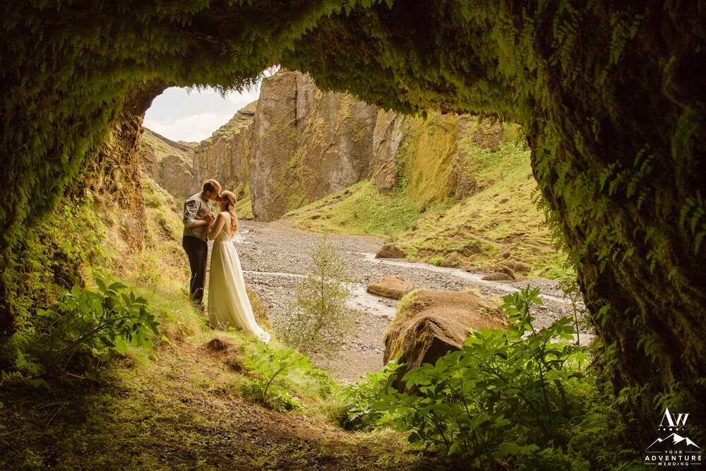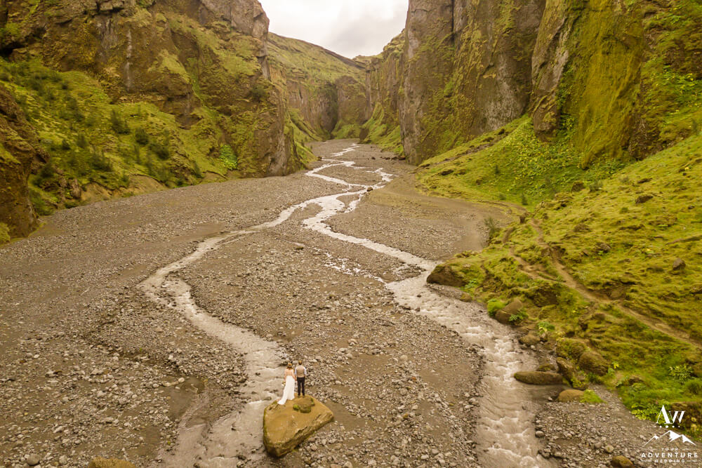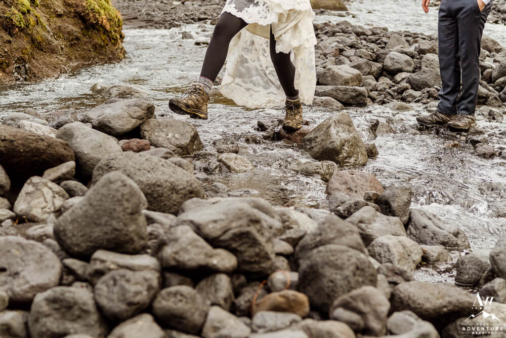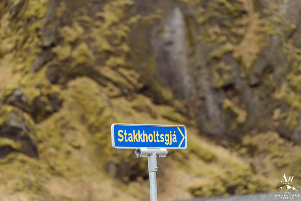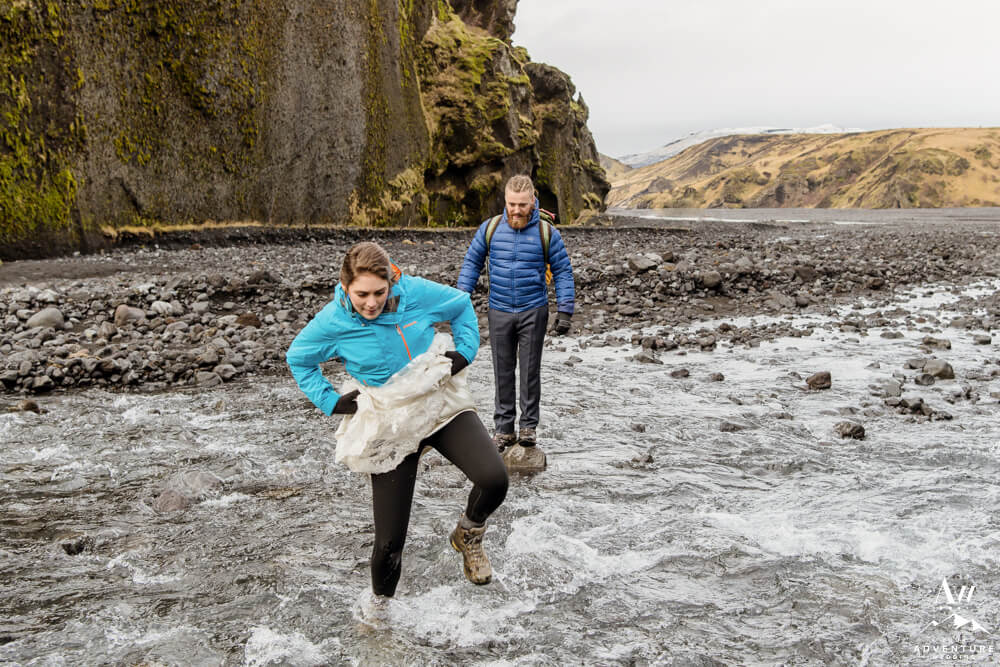 After you park your 4×4 truck and grab what you need it’s time to embark on the Stakkholtsgjá hike! Be aware there are no signs, ropes, barriers, or trail markers at all as of when we wrote this Iceland Wedding Planner blog post. However, it is a pretty darn straight forward trek. For example, you’ll follow the river bed back into the canyon after you pass the picnic table. Towards the right hand side, you’ll see a narrow trail that will look very worn by people / sheep and you can follow that back if you find the river bed rocks to intense of terrain for you. Overall, you can expect to be hiking for about 30 minutes one way depending on your pace.