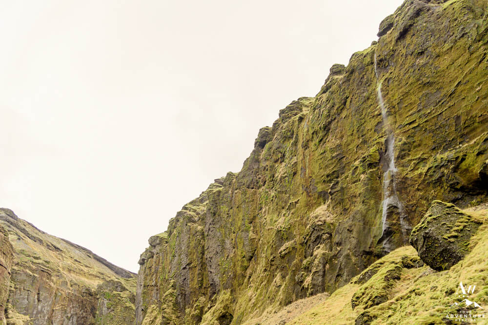 Heading further into the Stakkholtsgjá hike, you’ll continue to follow the river back until you see a cross road canyon emerge (about 20-25ish minutes in). That surprise canyon goes to the right but the waterfall you came for is to the left.