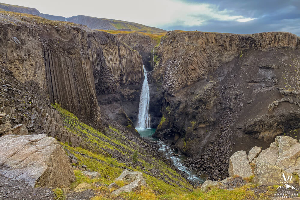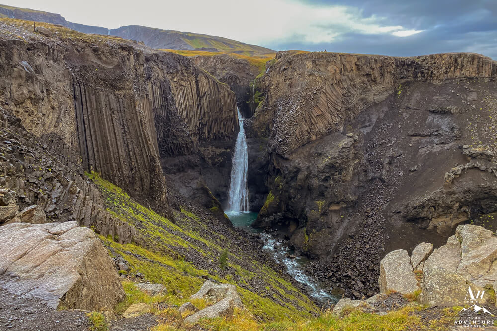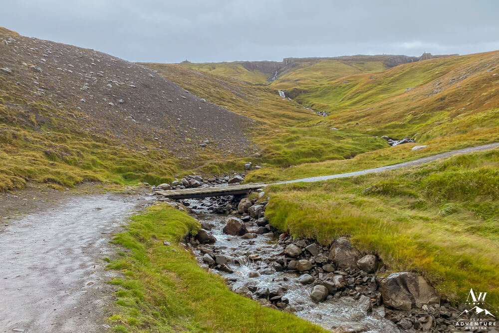Next, you’ll continue your track up the mountain. About 15-30 minutes into the hike you’ll cross a few foot bridges, see further into the canyon and stumble upon Litlanesfoss Waterfall. Marvel over it for a few minutes because it is lovely. For instance, if you’re a fan of basalt rock formations, this could be your favorite waterfall of this entire hike!