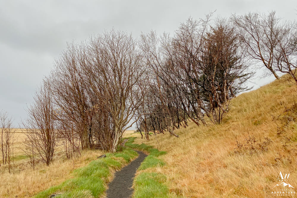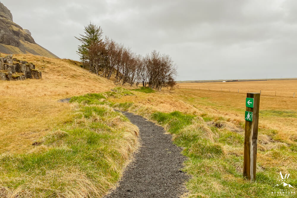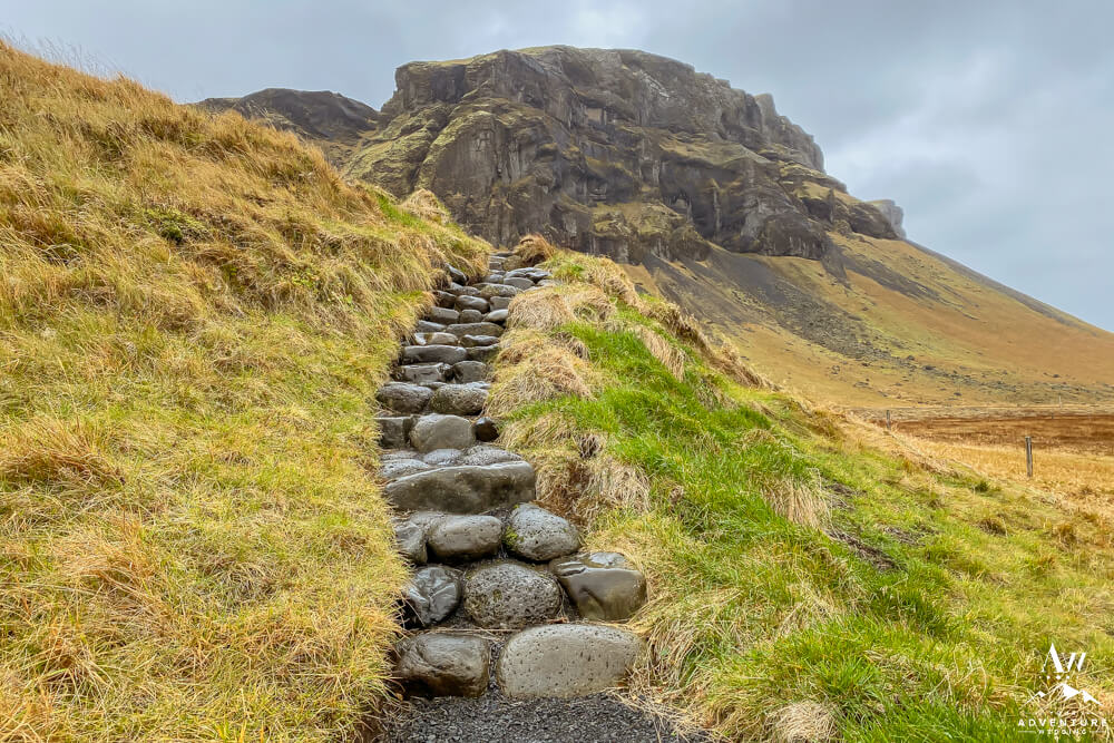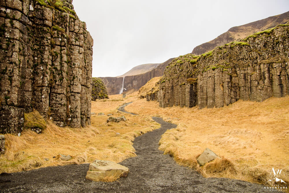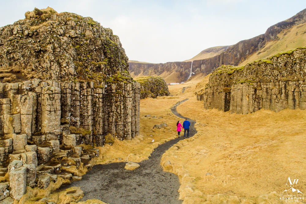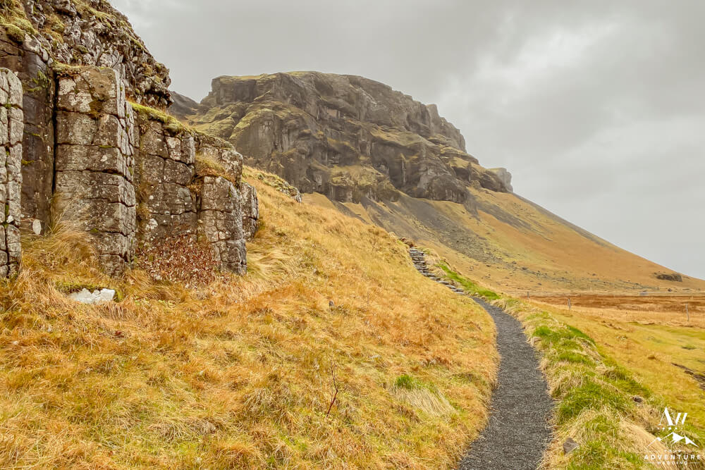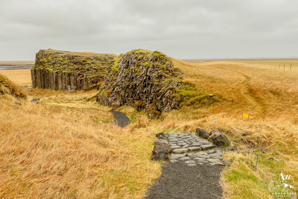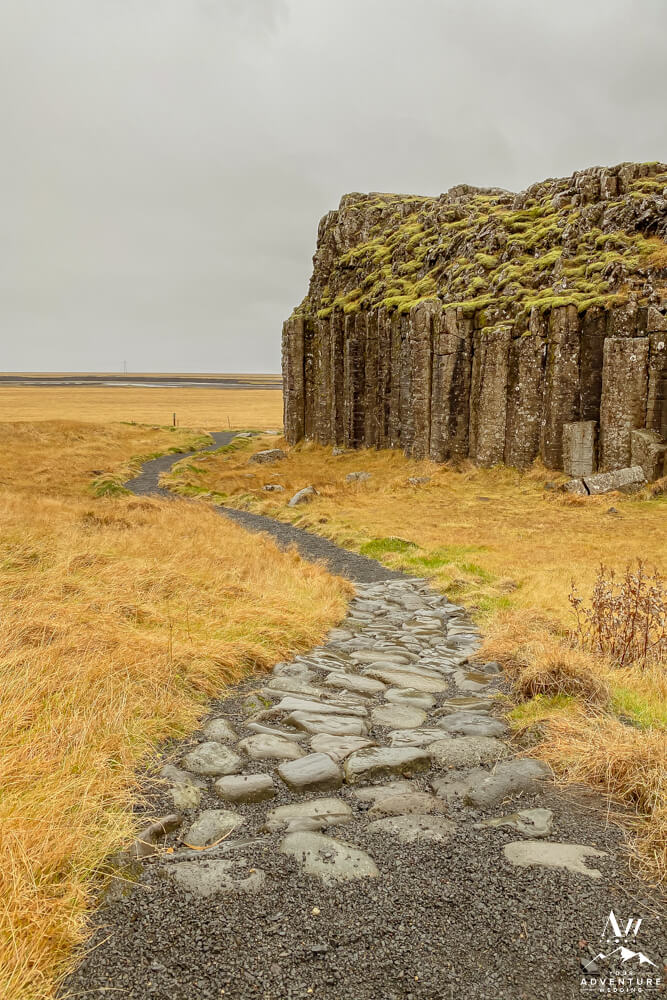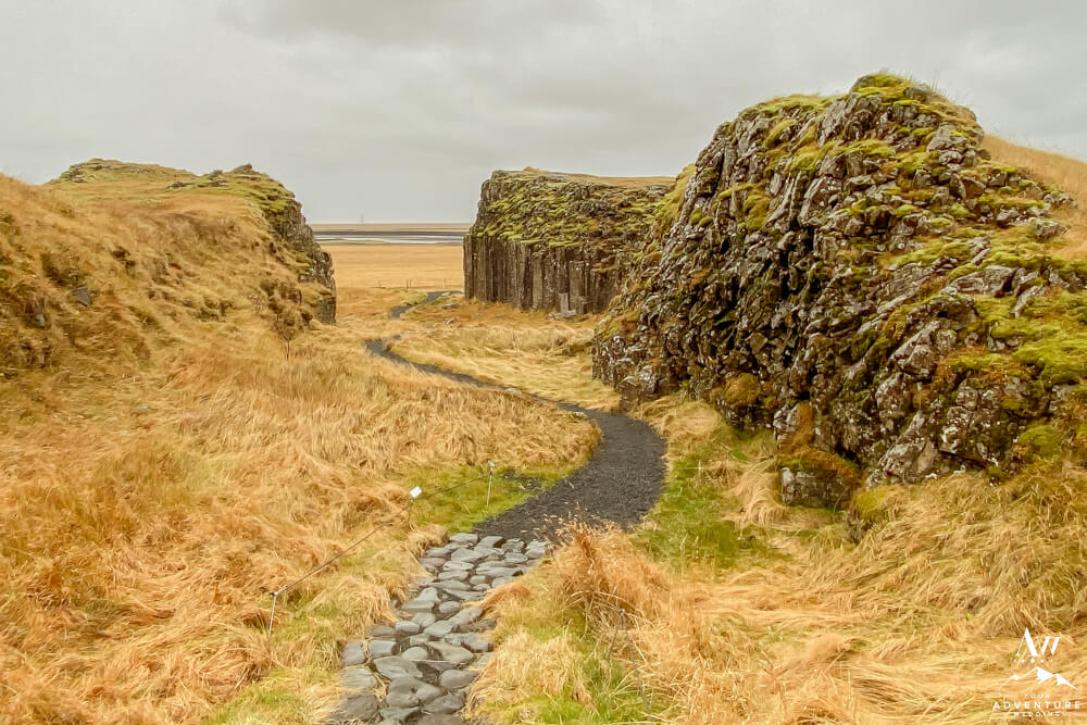 Although, we wouldn’t really call Dverghamrar a place to “hike.” But rather an offbeat place to have a quick easy pretty walk together while on your Iceland self-drive adventure. Anyhow, here are photo directions to guide you through experiencing this spot! After you park you’ll enter through the gate to the right side then follow the path up, down and to the left.