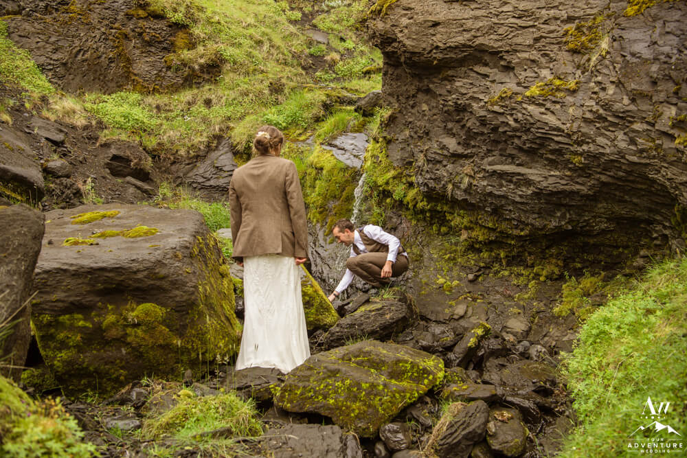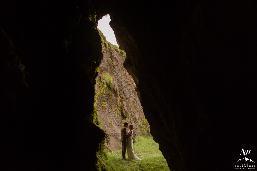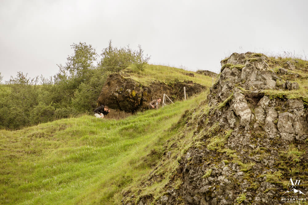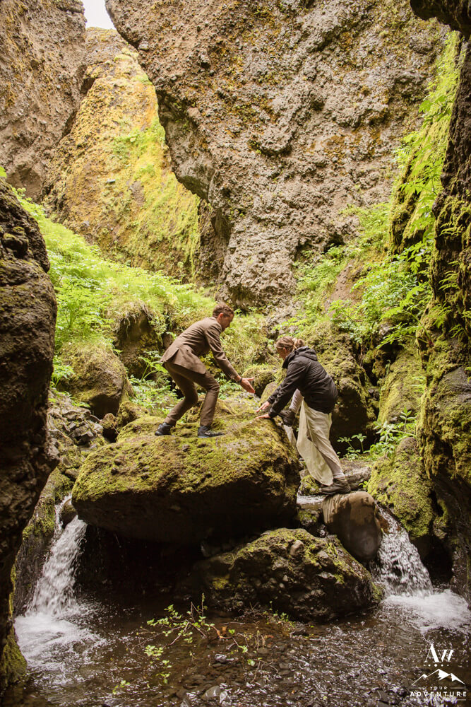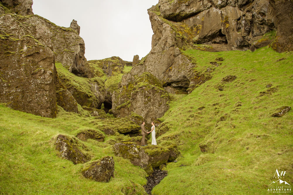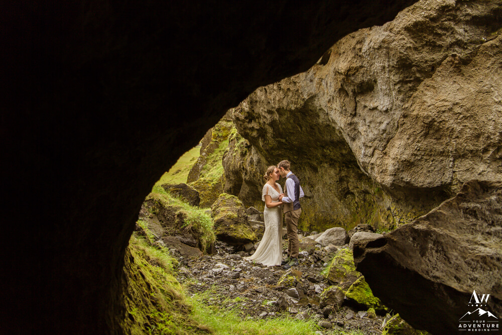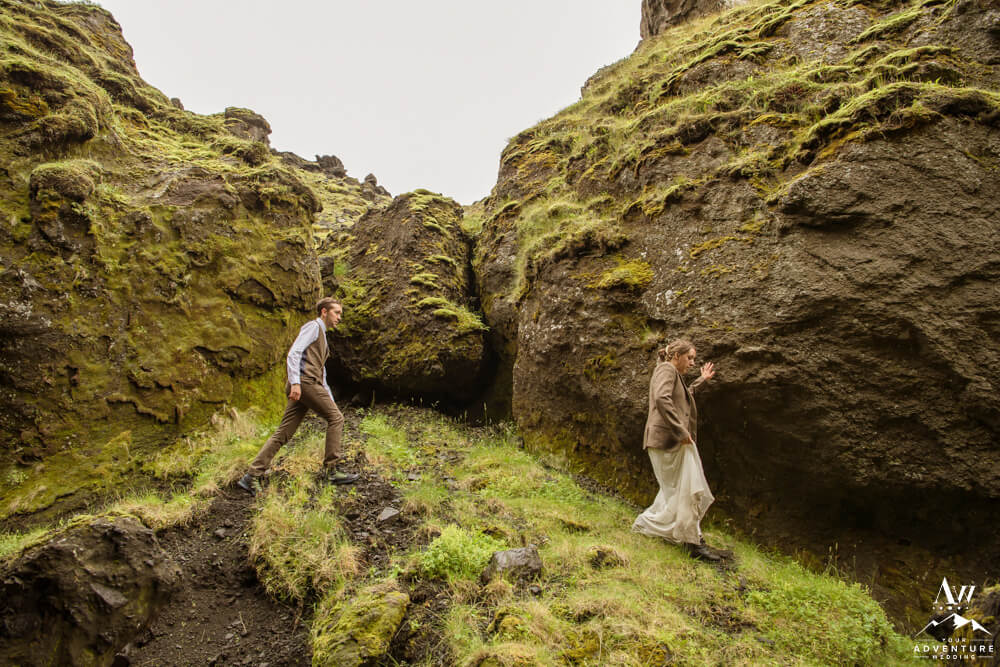 Countless areas around Iceland feel enchanted or alive. To illustrate, some locals would say those areas are inhabited by elves or the famed “hidden people.” More often then not, our team likes to refer to them as “Narnia” areas. You know, the kind of place that feels or looks like it should be a storybook or fantasy not real life. Laura and Mathias next location exploration during their romantic Iceland elopement was a sweet little green canyon which had a cave and a trickle waterfall within!