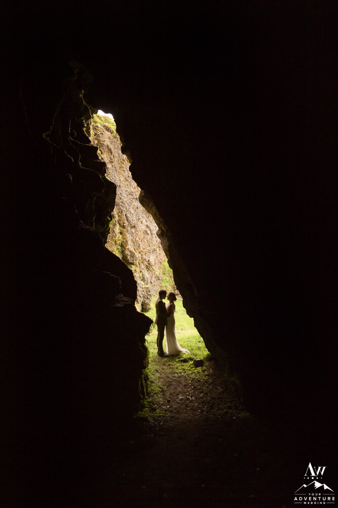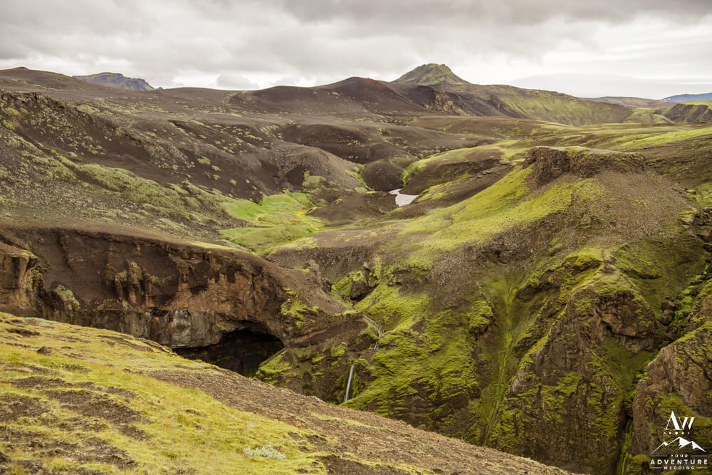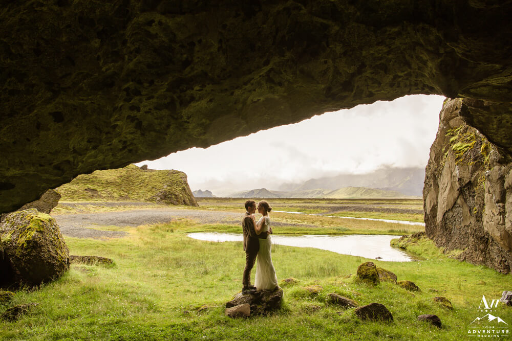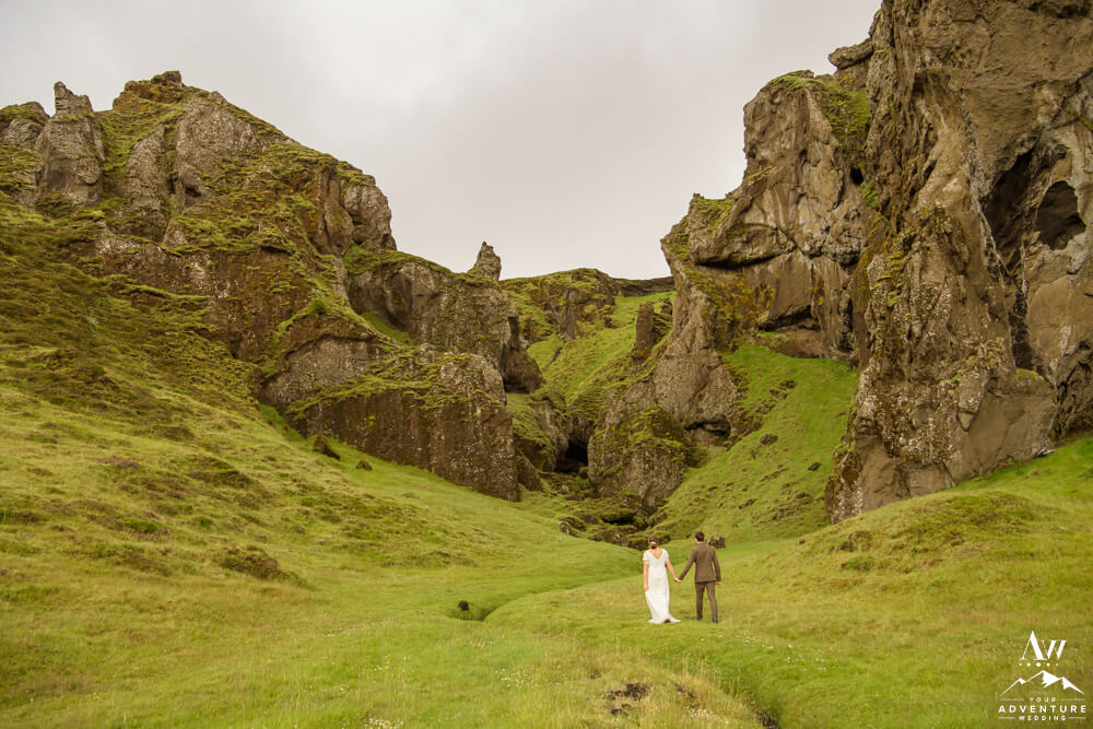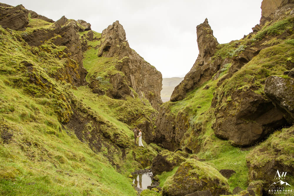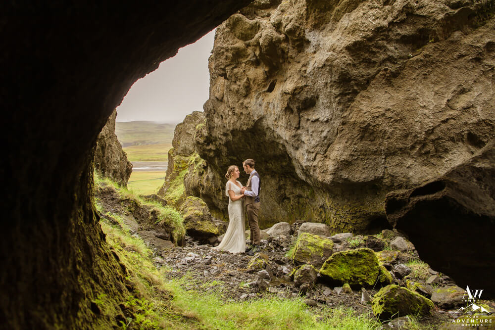 Countless areas around Iceland feel enchanted or alive. To illustrate, some locals would say those areas are inhabited by elves or the famed “hidden people.” More often then not, our team likes to refer to them as “Narnia” areas. You know, the kind of place that feels or looks like it should be a storybook or fantasy not real life. Laura and Mathias next location exploration during their romantic Iceland elopement was a sweet little green canyon which had a cave and a trickle waterfall within!