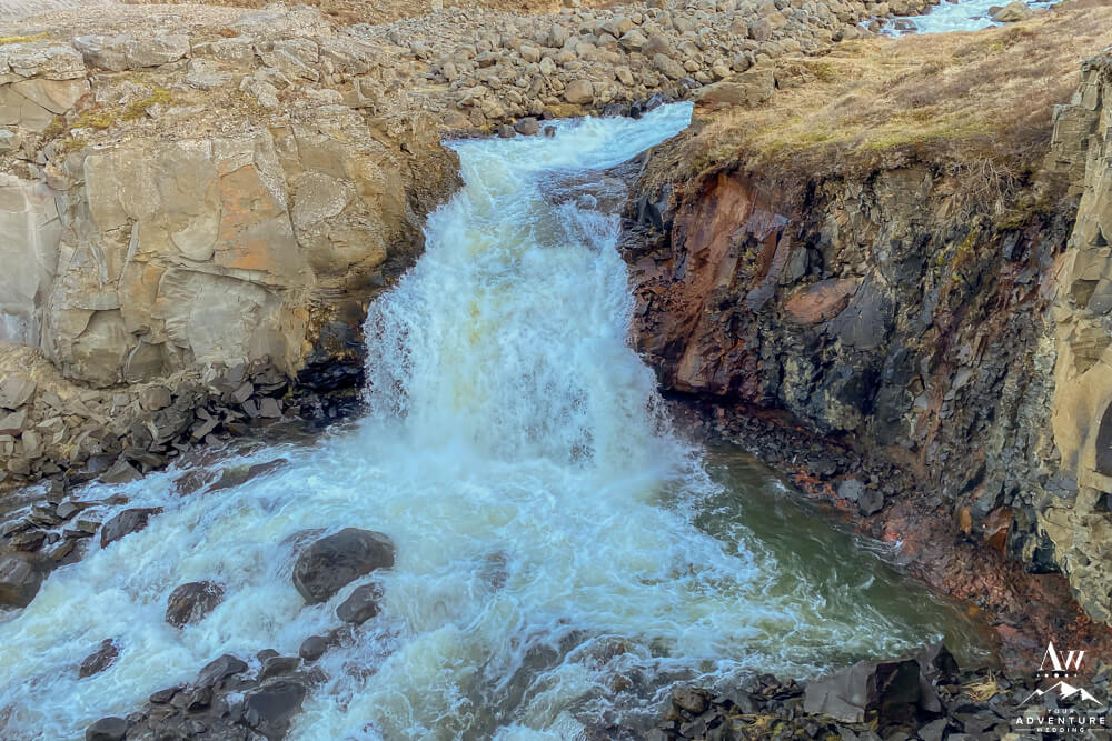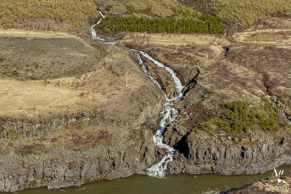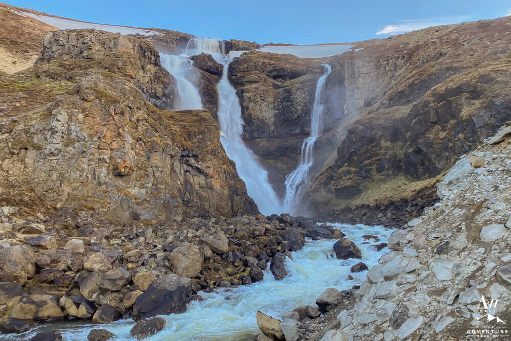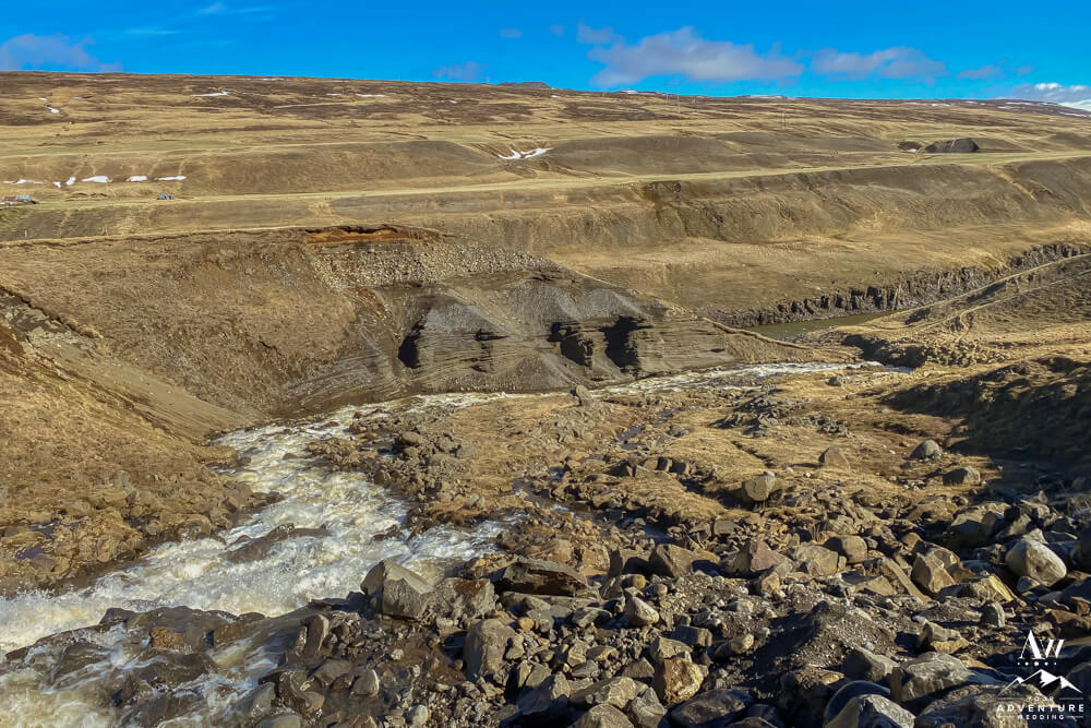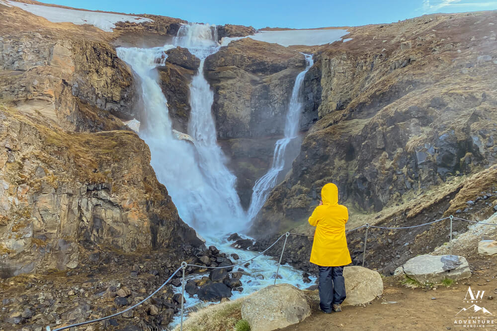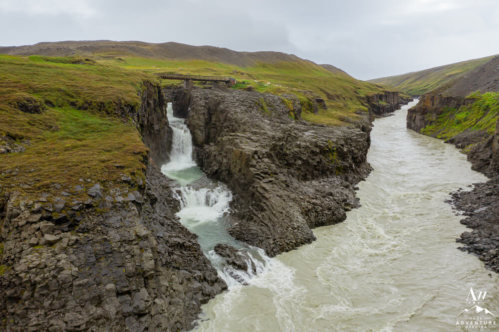Note, this is the first turnoff for Stuðlagil. You’ll follow the gravel drive down until you see 2 parking lots and 2 bridges. Hence you park here, DO NOT CROSS THE BRIDGE with your car (as of July 2021). Furthermore, if you were to go about 3 miles further (on Road#923) you’ll find the lookout point from the west side. Iceland Waterfall Tip: Right before the turnoff for Route #923 you’ll pass by several gorgeous waterfalls you can walk to. Specifically Rjúkandafoss is worth a stop!