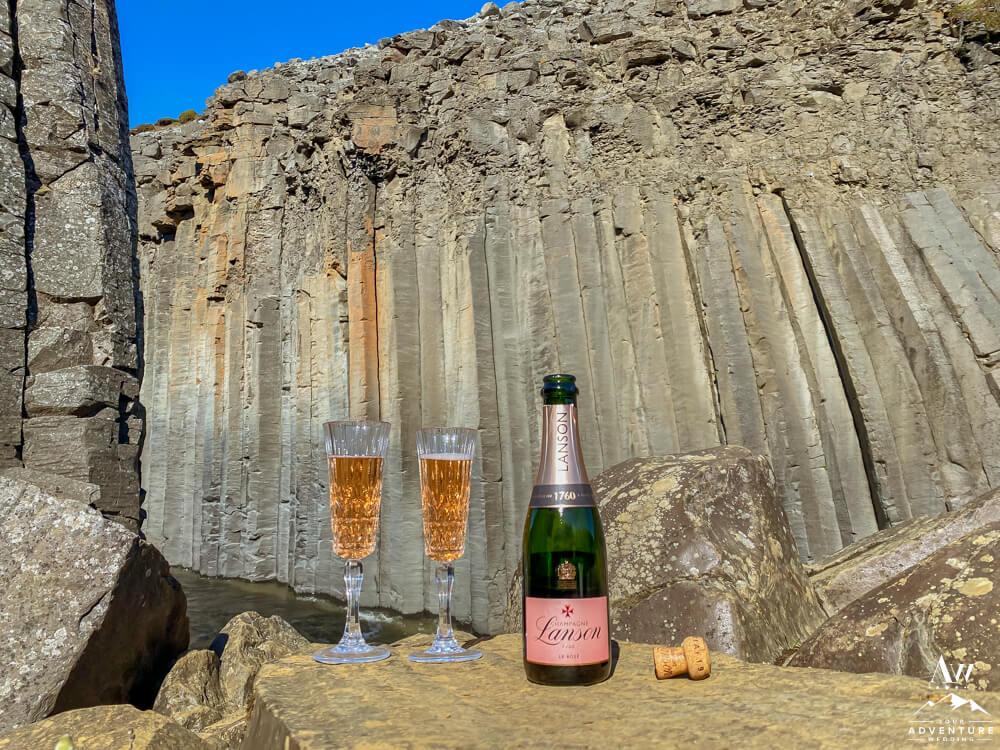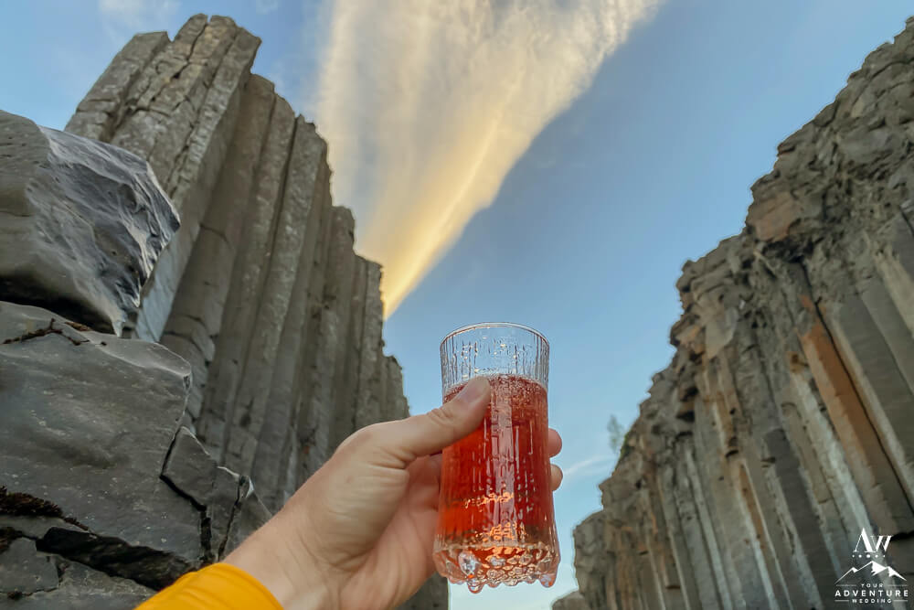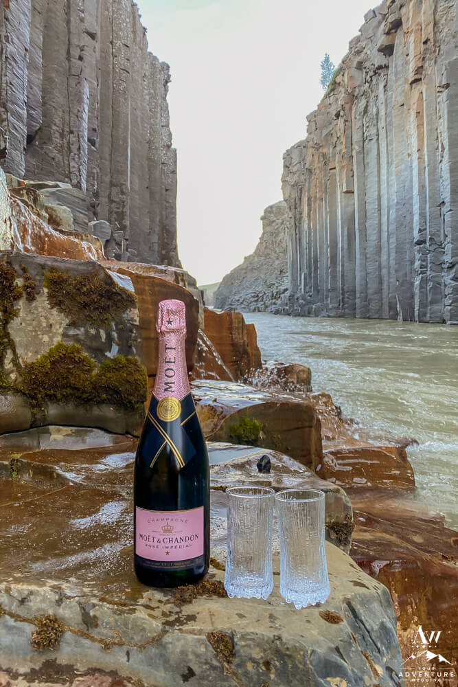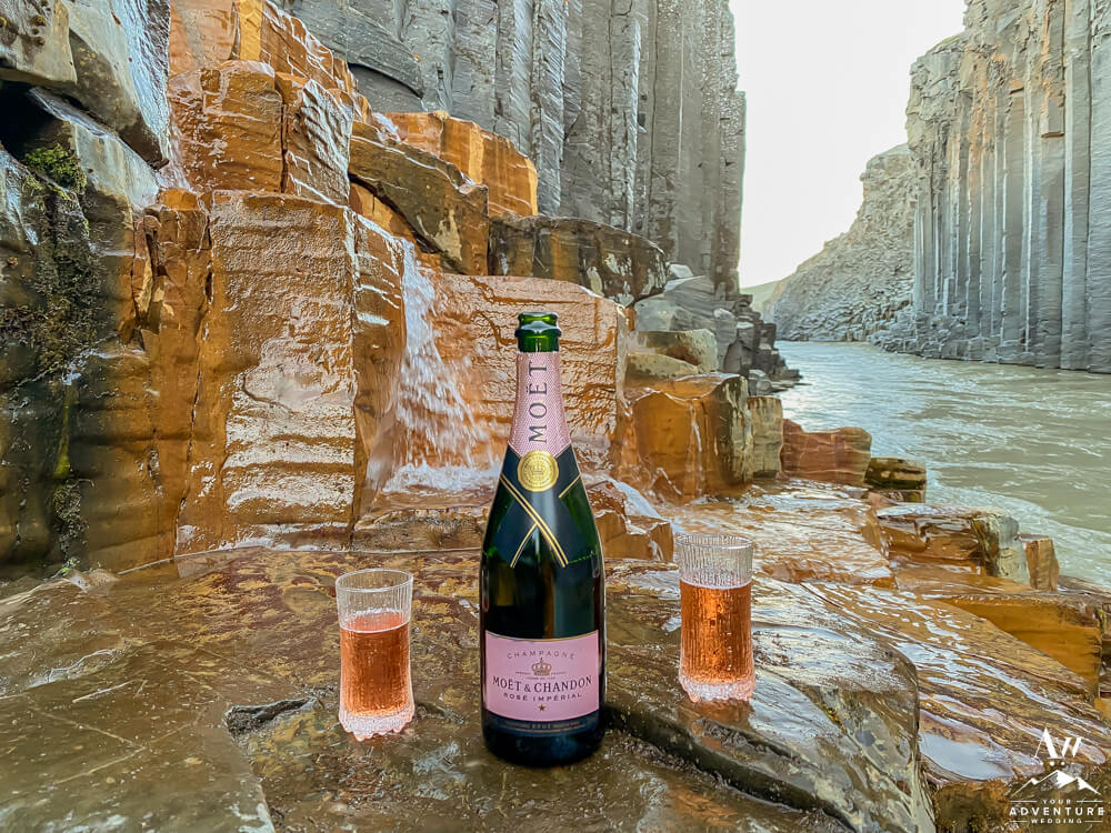So there you are at Stuðlagil Canyon, woot woot!! The images below are a mix from this past June and July’s hike in there. The water level was high in both visits. But the area is still so enjoyable!! In fact, during both visits we delighted in a champagne picnic! However, please be safe if you intend on heading down to the famous Instagram spot where the orange stacks reside. Why? For example, you could slip and go right into that raging river! As of July 2021, the landowners added a black rope that is safely anchored you can use to help you get down there.