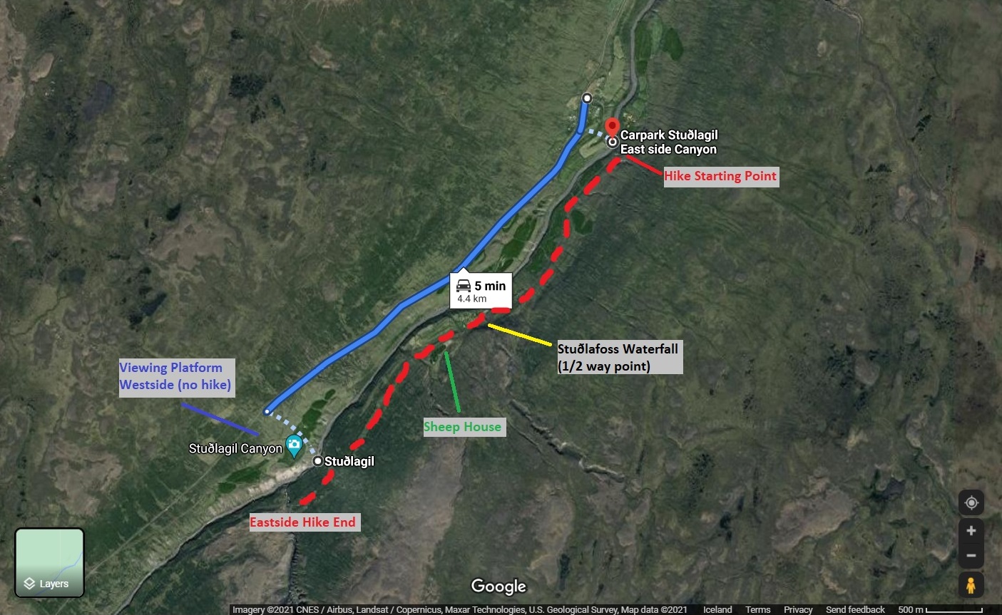 Thus if you want the best chance to catch the crystal color, plan your trip there in late June to early August. Why? Less chances of rain and the river rising and mixing up to be murky. Our team has visited this Studlagil in June (2021), July (2021), August (2019) and early September (2020) in both early morning and evenings and only 1 time was it the famed green-blue. Iceland Hiking Tip: If having the water be a vivid color is a deal breaker for you to take on the hike, then drive to the west side parking lot and have a look first.