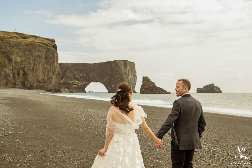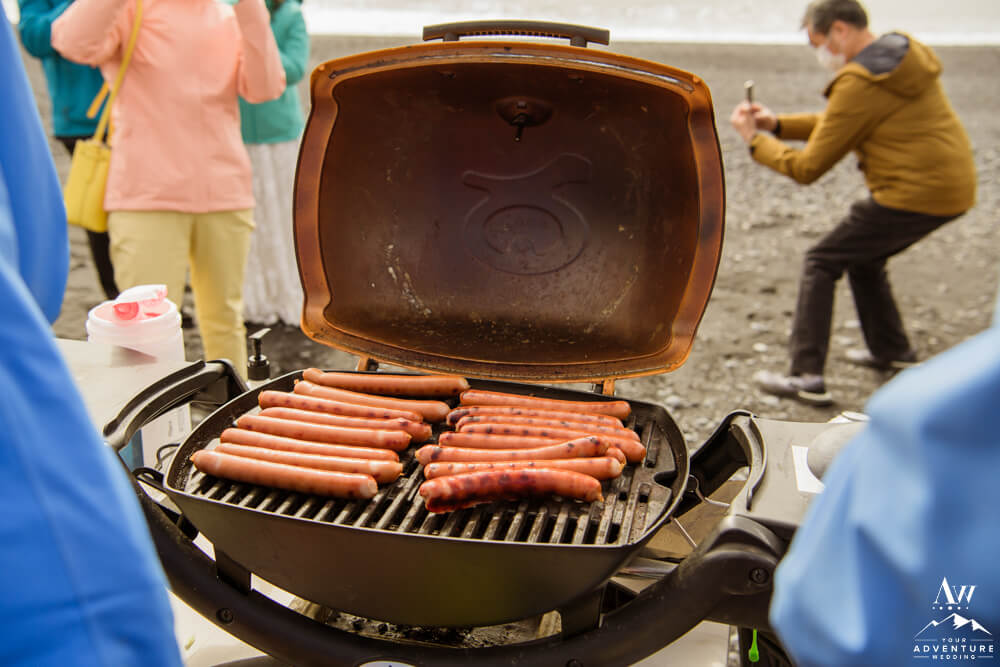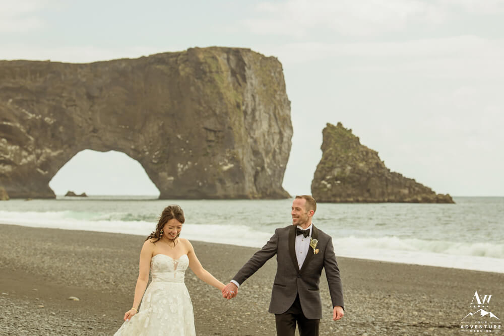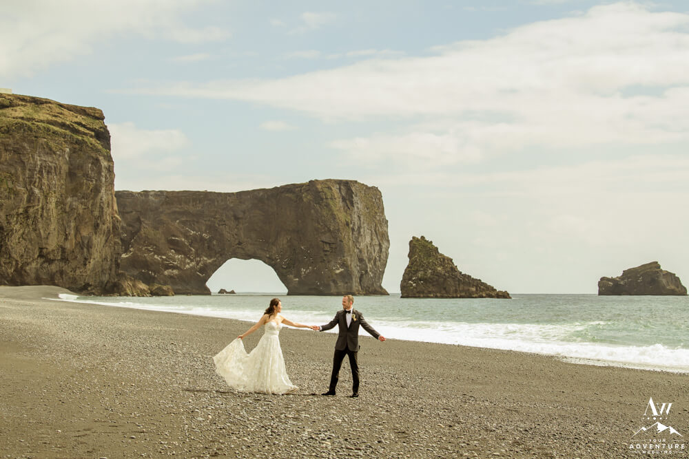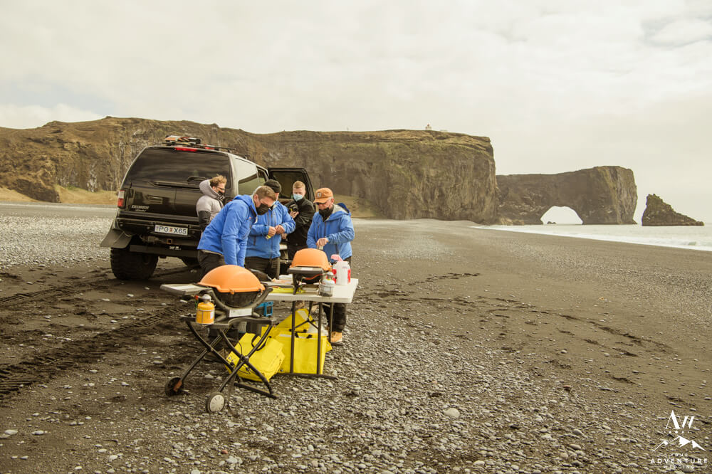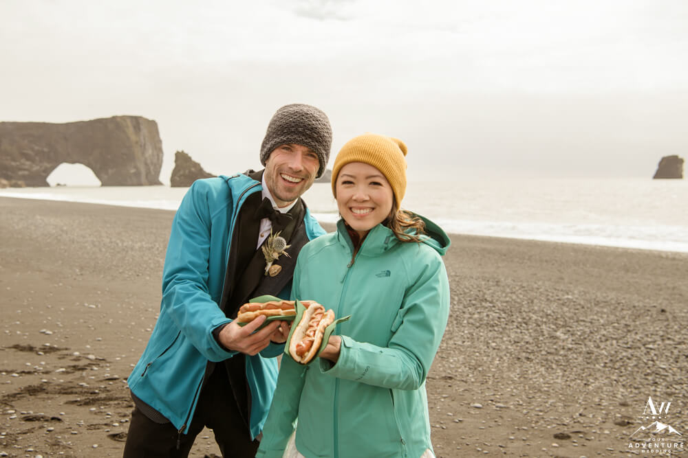 These two decided to surprise their guests with a traditional Icelandic hot dog BBQ. That way, they could experience a cultural tradition and get something warm in their hands! Yum!! Meanwhile, what better place to have a BBQ than the private side of Dyrhólaey Sea Arch Beach! Next, following their lunch experience these two were able to discover the rocky beach together hand in hand…