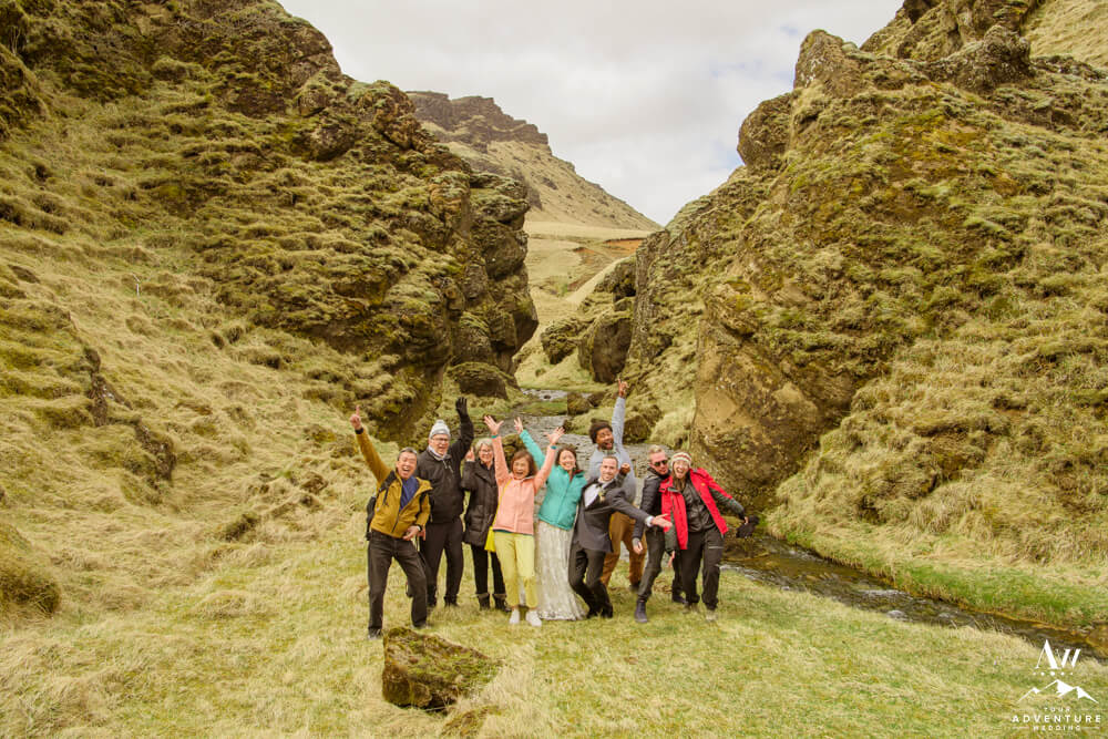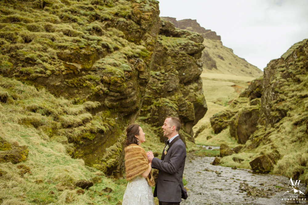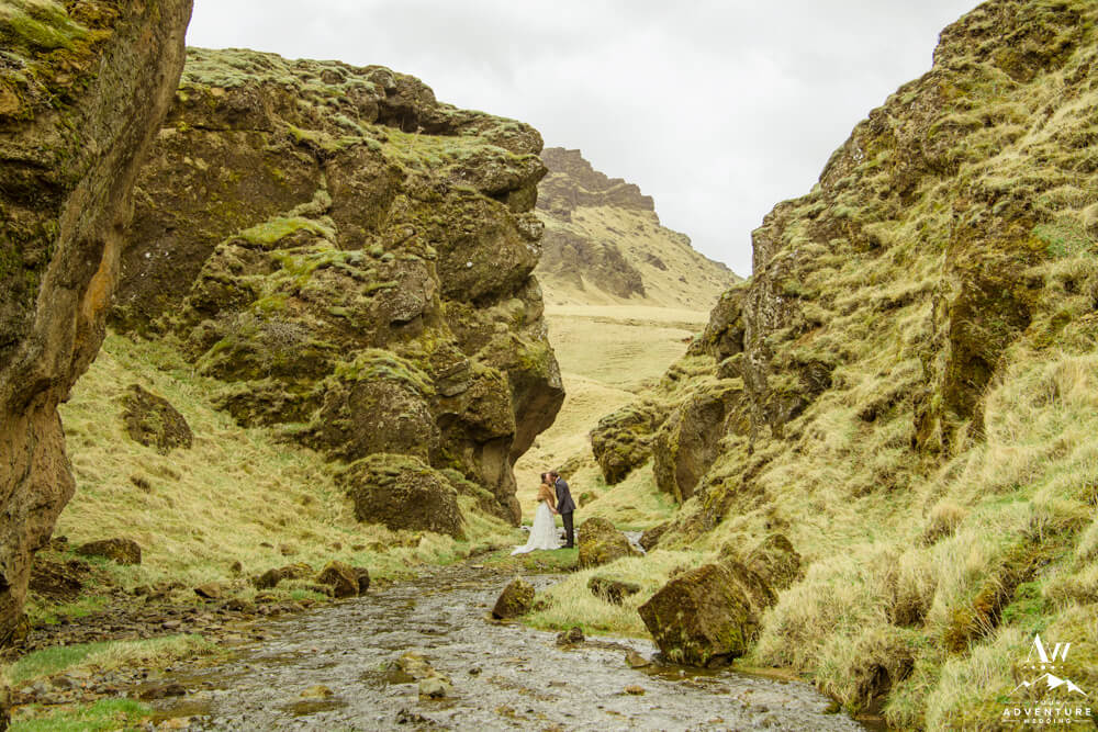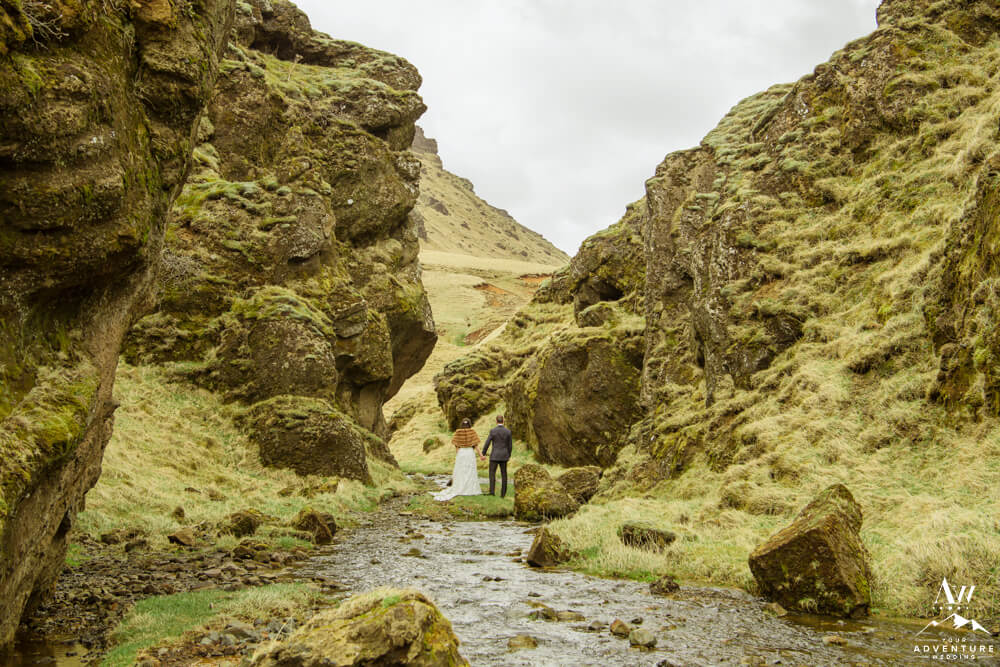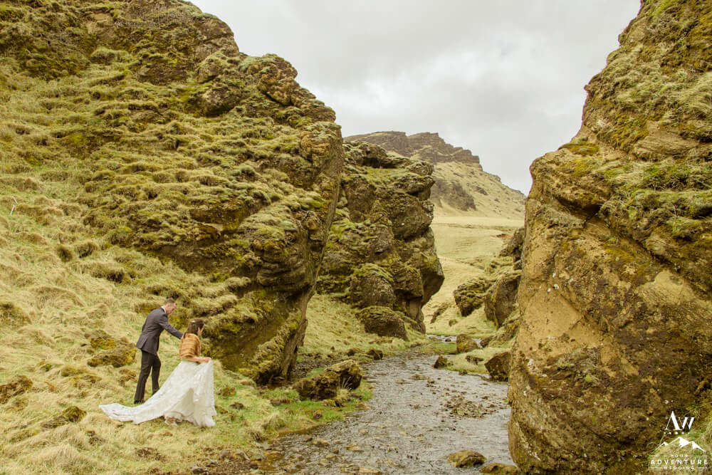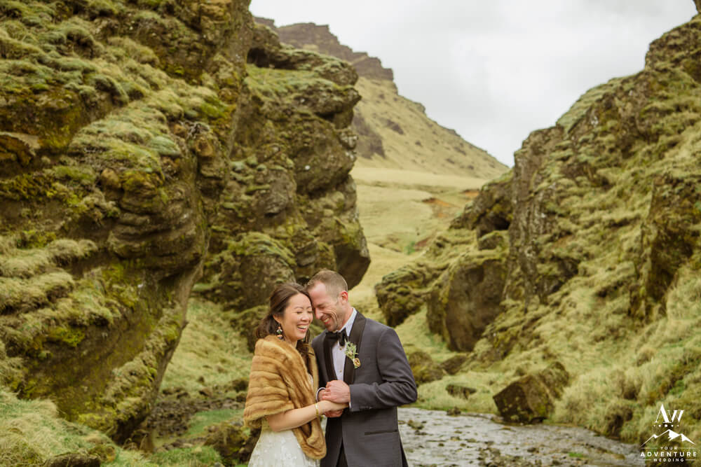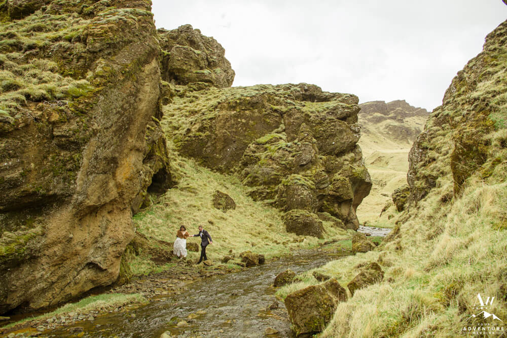 Our 5th experience during Kathy and Jake’s Iceland May wedding was heading into an extremely narrow canyon area. You could hear Kathy and Jake giggles as they crossed the river and marveled over the canyon walls!