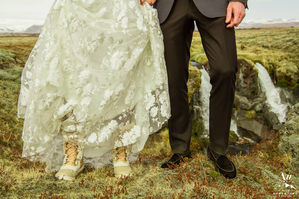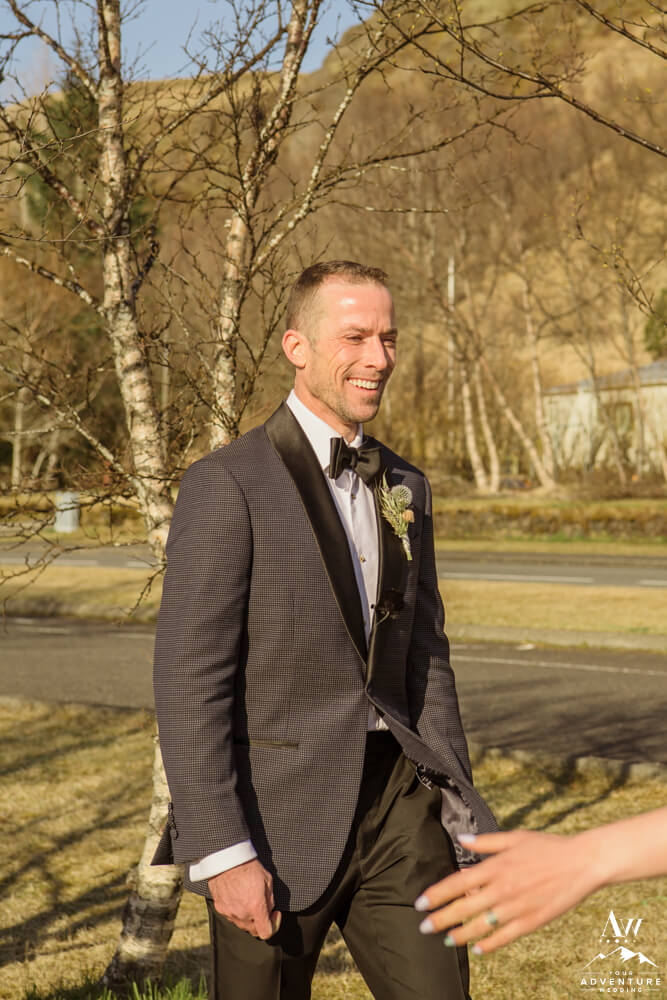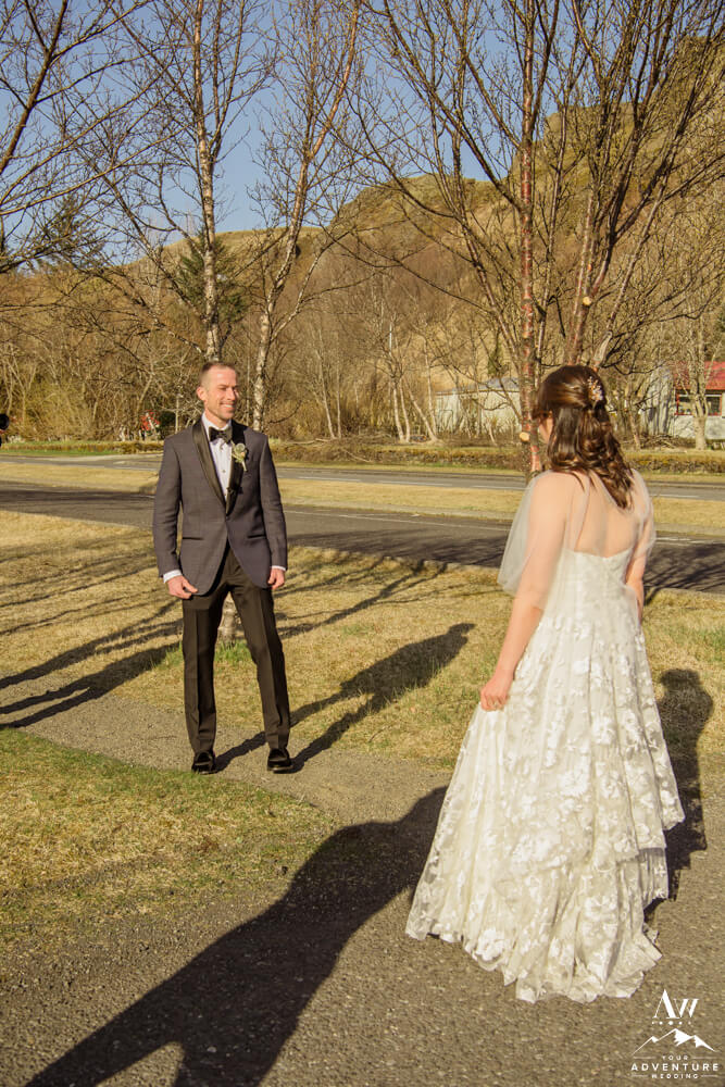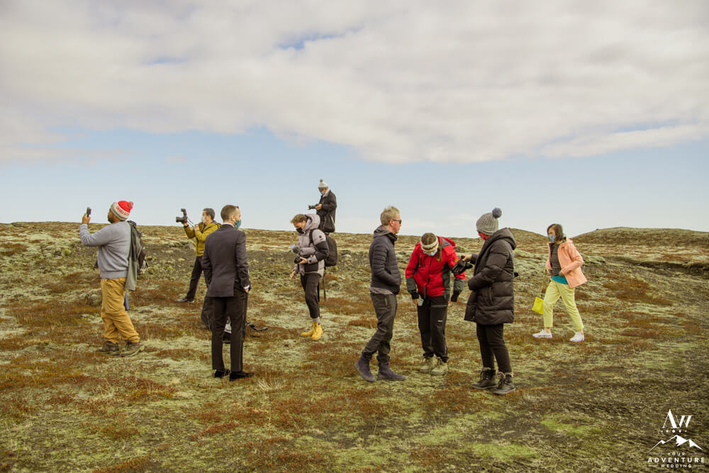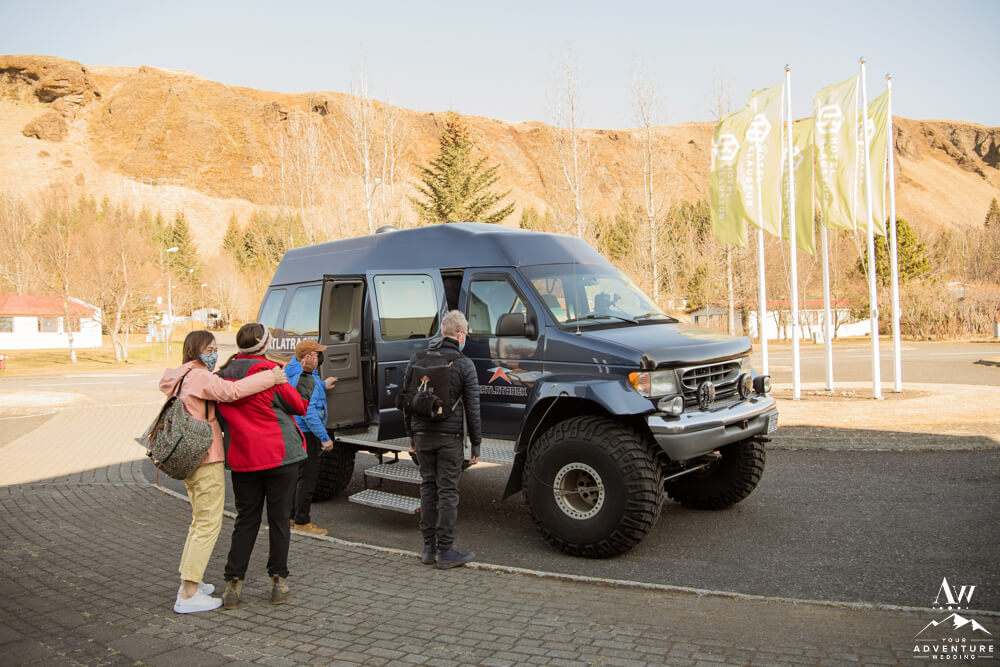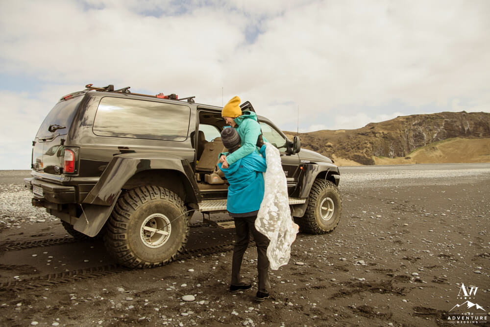 Maybe you remember Kathy and Jake from their volcano eruption photos? Days after their journey to the volcano, they embarked on their Iceland May wedding adventure with their guests! The morning began shortly after the sun rose over the mountains. Our Iceland wedding photographer documented all of their beautiful details and organized a first look too! Taking a few minutes to yourselves can be very centering before you load into the super jeeps for the day.