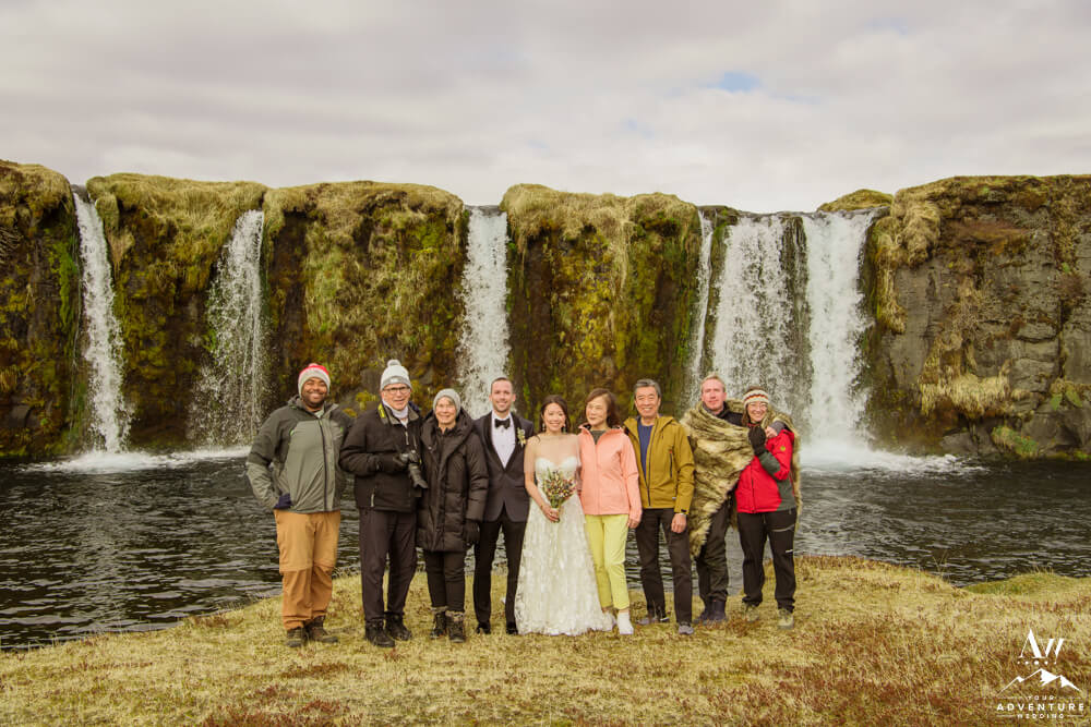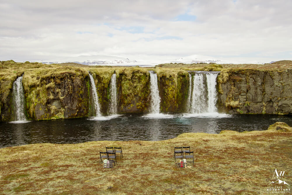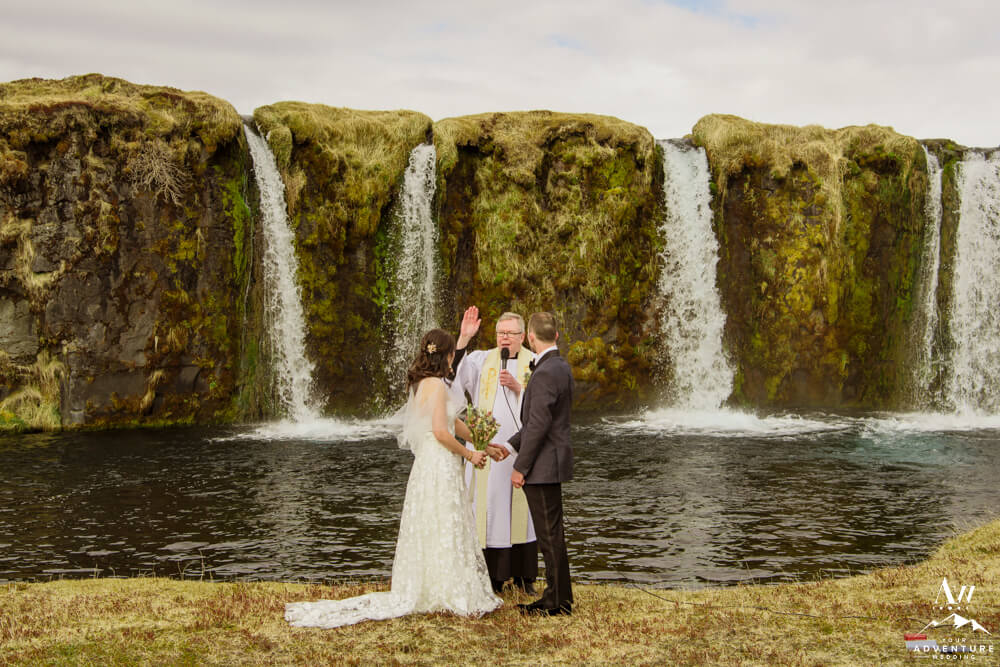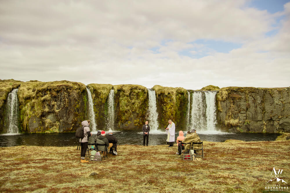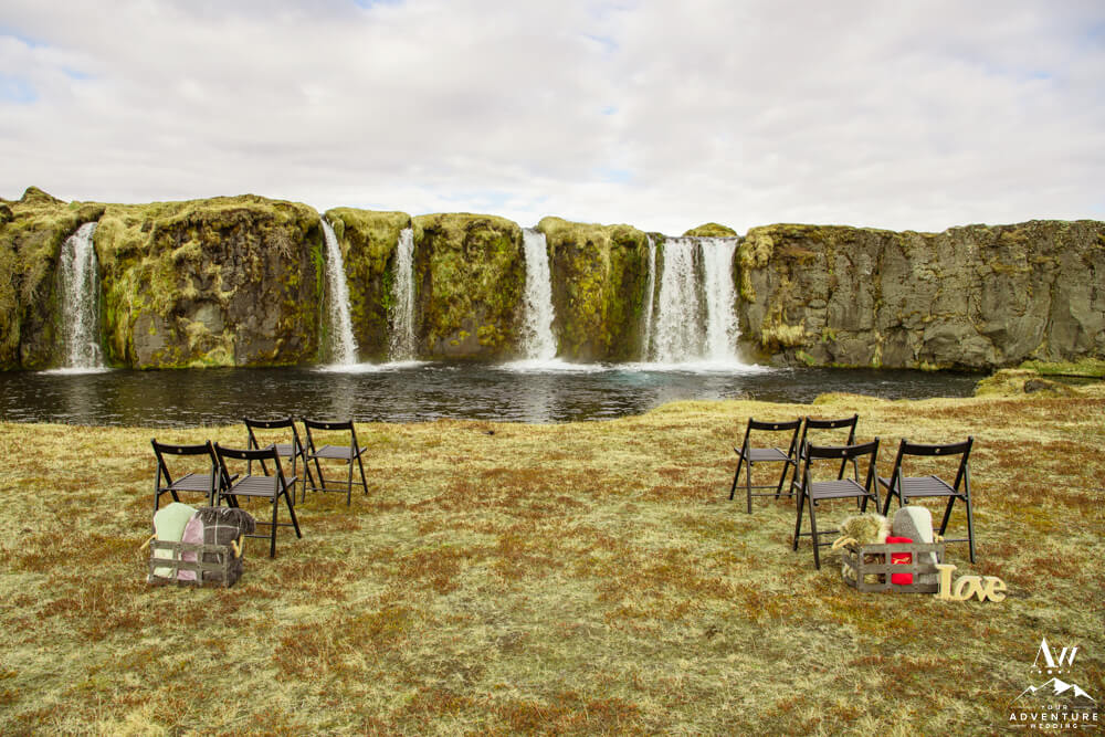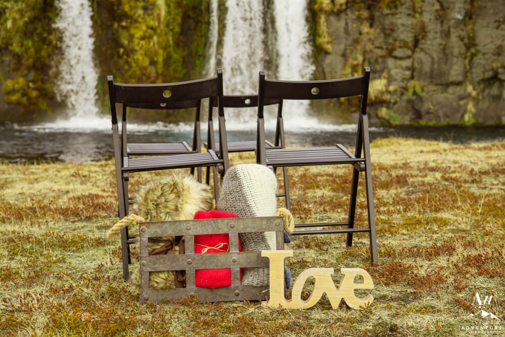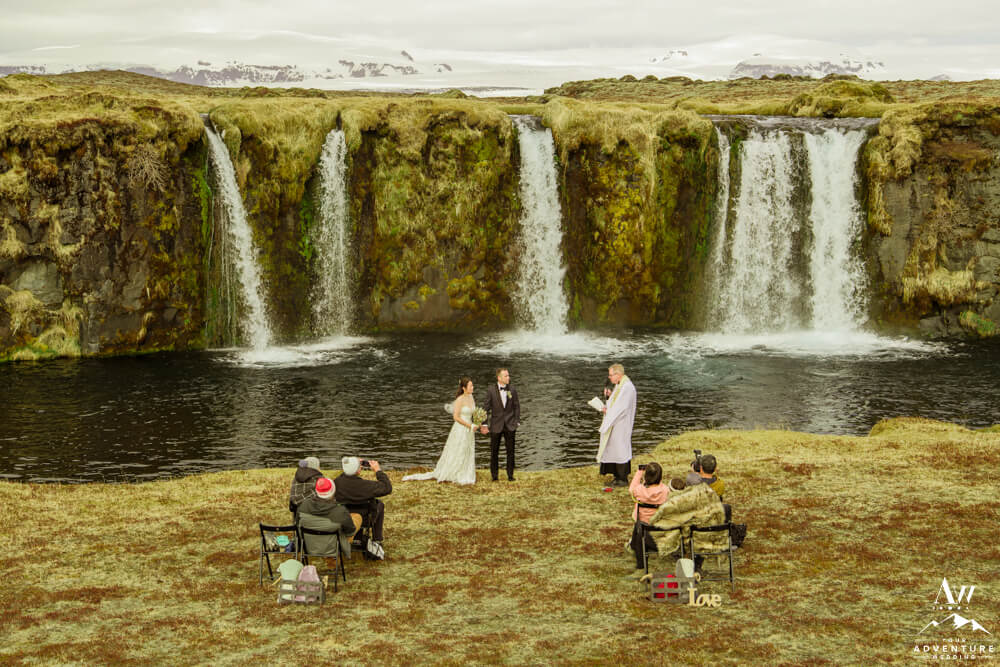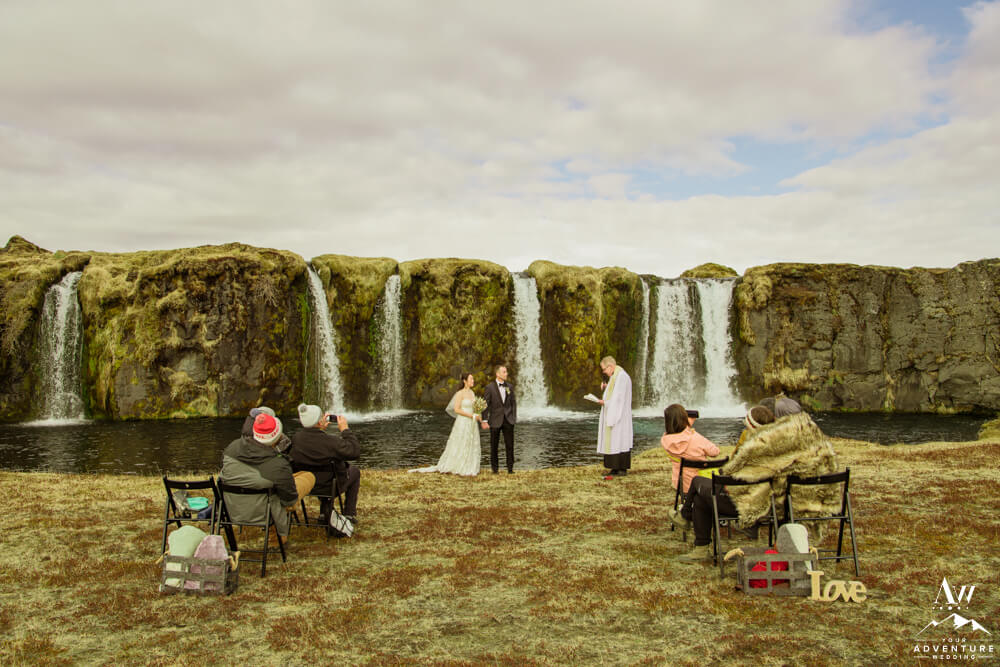 Every couple has a vision or a list of “must haves” in regards to their ceremony, especially planning a waterfall wedding! Firstly, will you have a seated one? For Jake and Kathy having their guests comfortable was important. Plus the aesthetic of our black wooden chairs at their Iceland May wedding at waterfall was beautiful. Secondly, getting married at a powerful waterfall also requires a sound system so your fabulous guests can hear it! Kathy and Jake opted in for that as well.