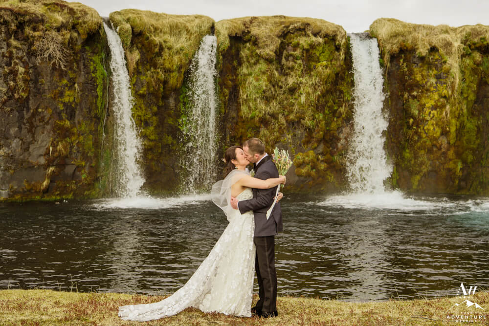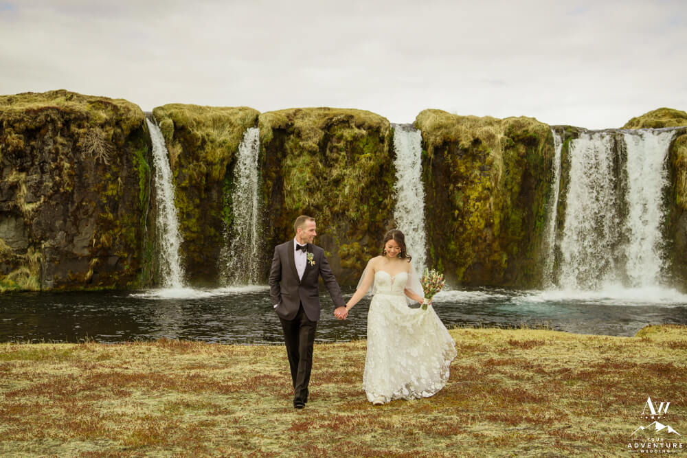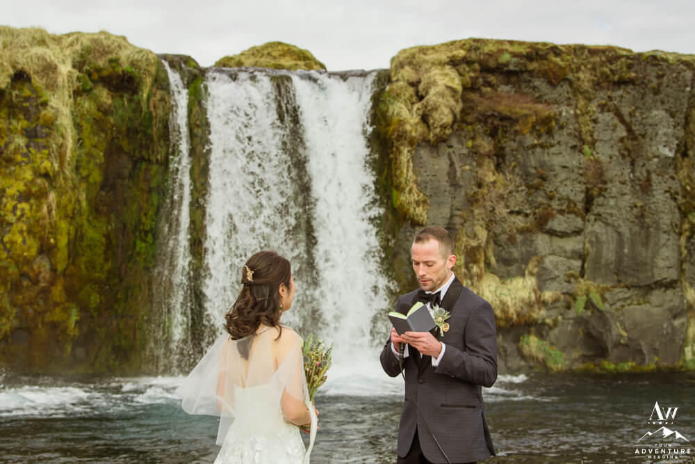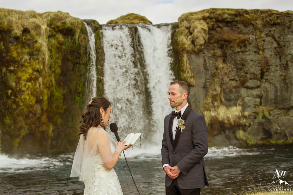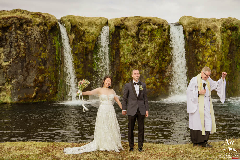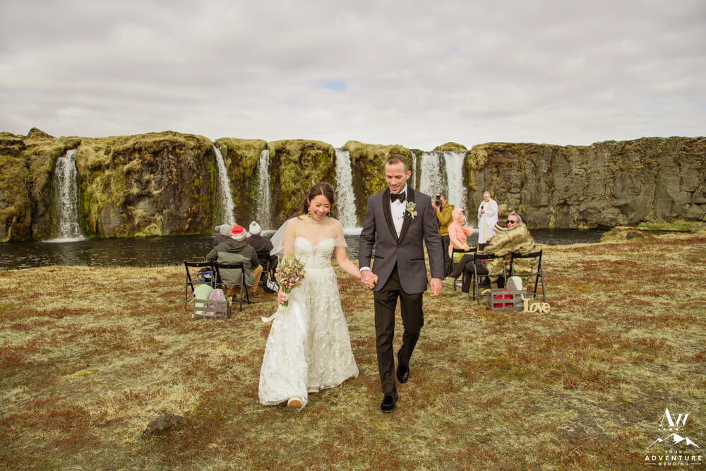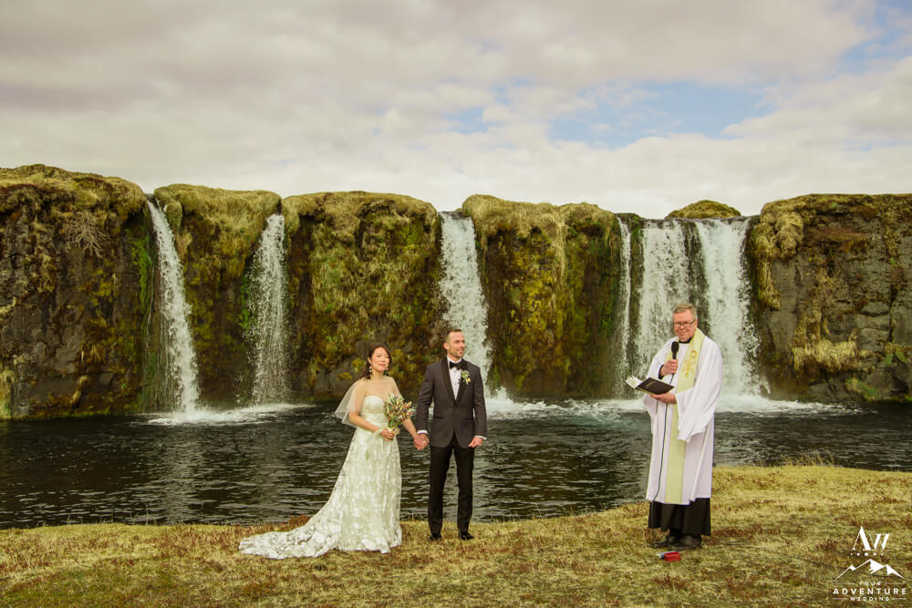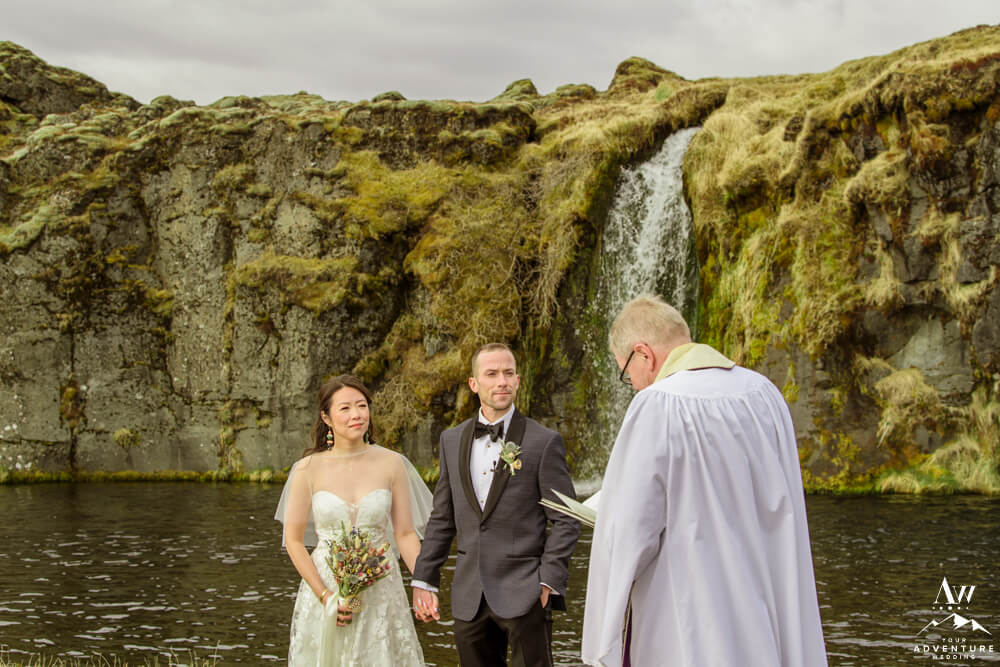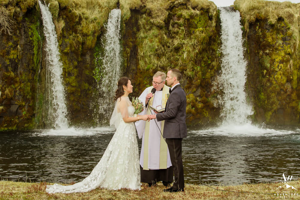 Every couple has a vision or a list of “must haves” in regards to their ceremony, especially planning a waterfall wedding! Firstly, will you have a seated one? For Jake and Kathy having their guests comfortable was important. Plus the aesthetic of our black wooden chairs at their Iceland May wedding at waterfall was beautiful. Secondly, getting married at a powerful waterfall also requires a sound system so your fabulous guests can hear it! Kathy and Jake opted in for that as well.