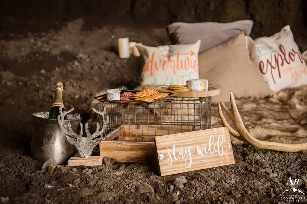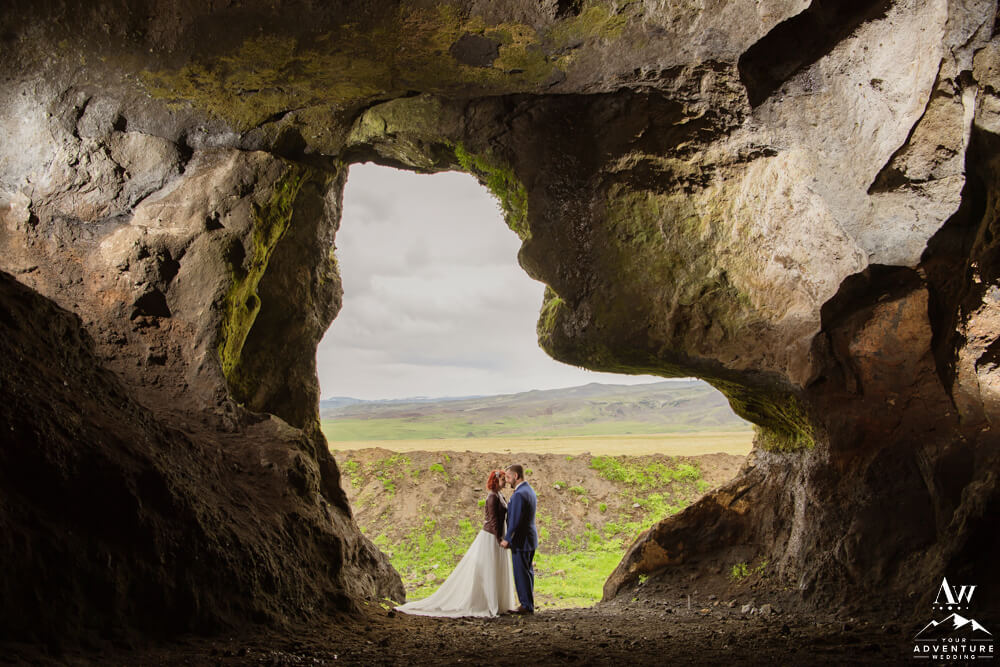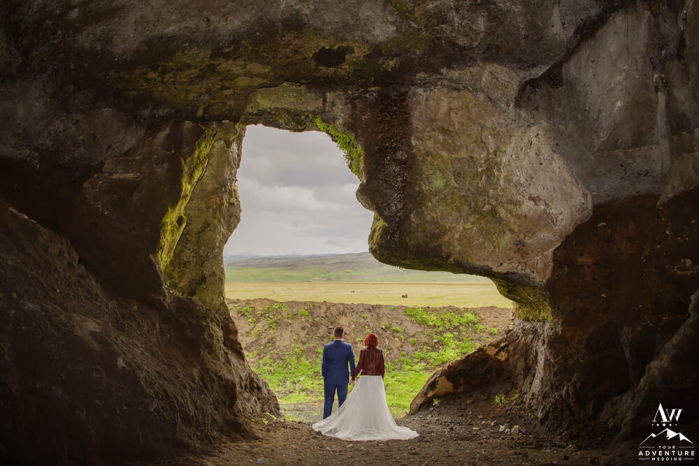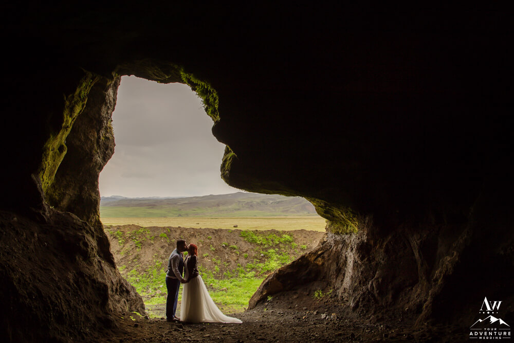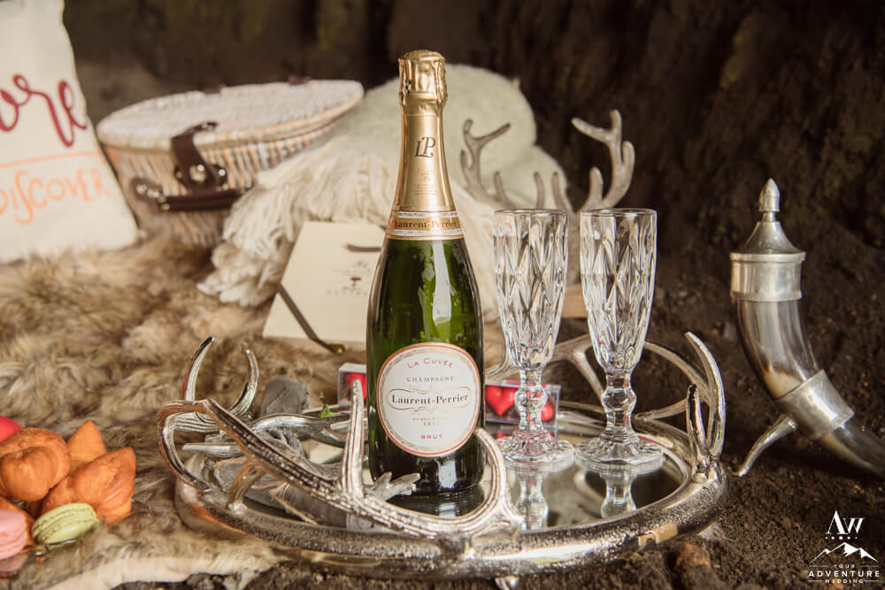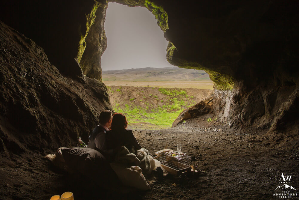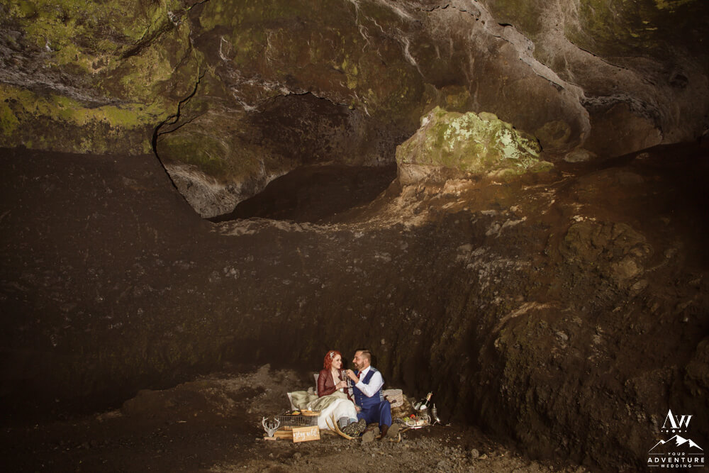 No matter the season or weather, experiencing the inside of a natural cave in Iceland is pretty spectacular. Meanwhile, opting in for a luxury picnic while there seriously takes any experience driven elopement up a notch! To illustrate, the newlyweds added on a luxury champagne picnic complete with cozy blankets, pillows, Laurent-Perrier champagne, Icelandic cheeseboard, fruit, and other delicious pastries. Afterwards, they explored the cave both inside and out… In fact, they were the FIRST EVER to get wedding photos inside of this newly dug out cave!!