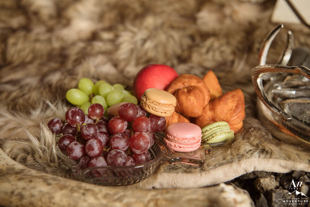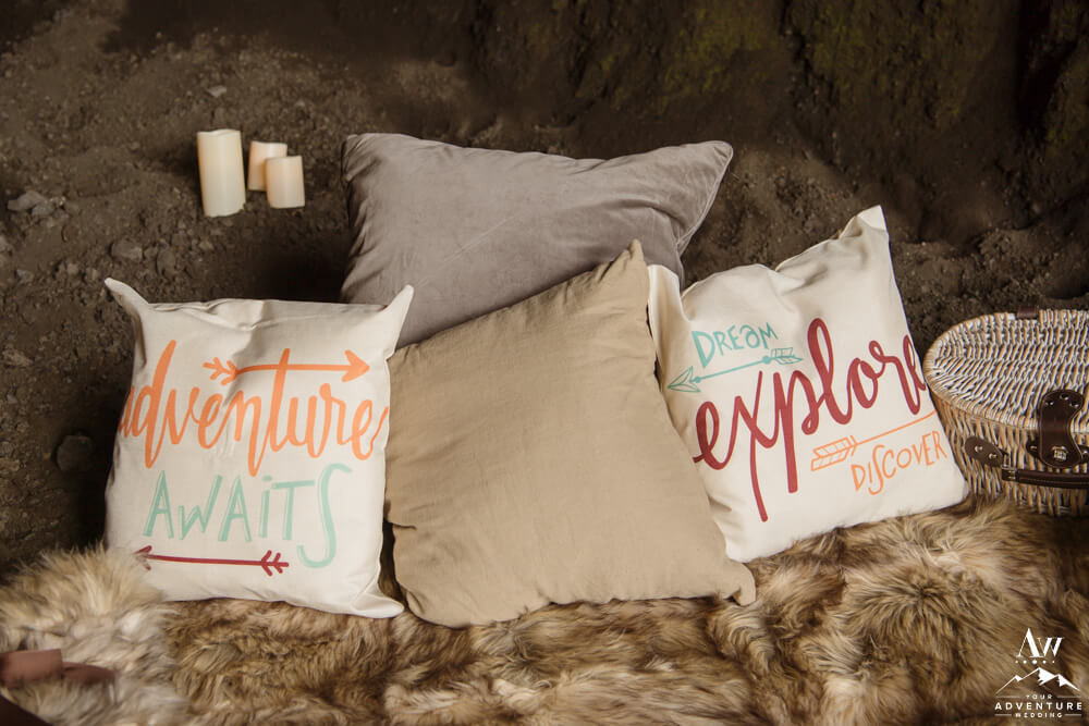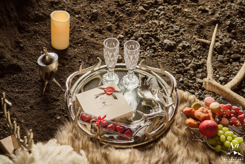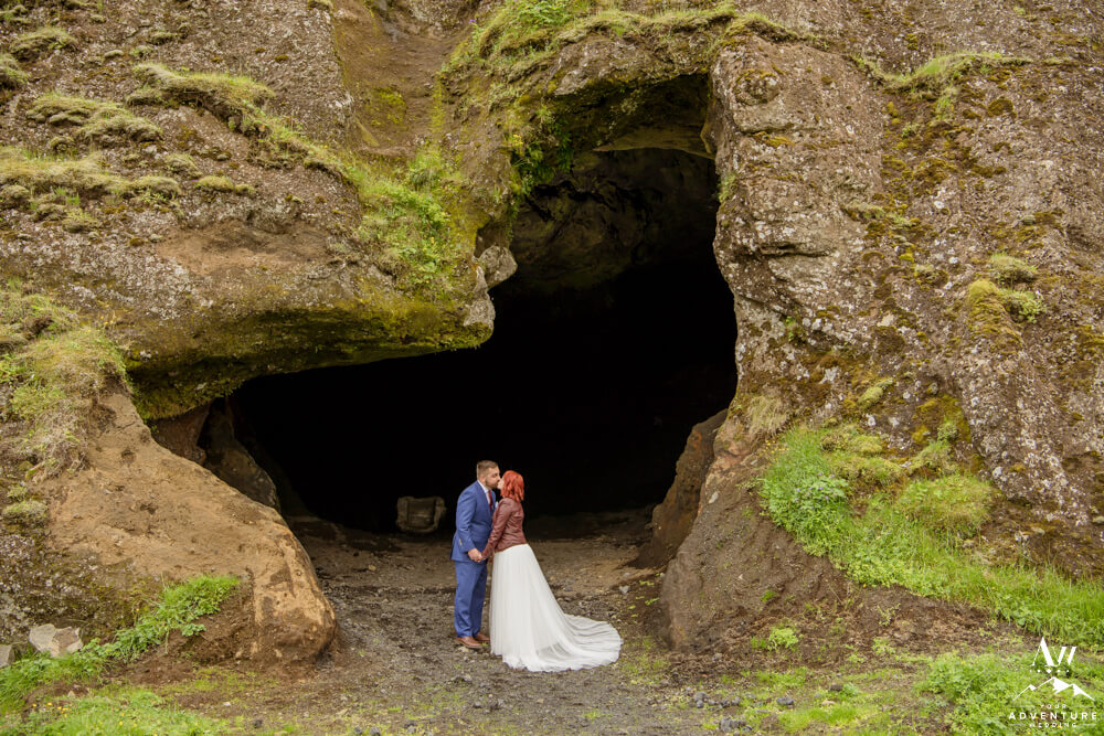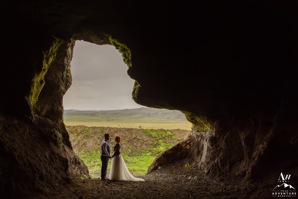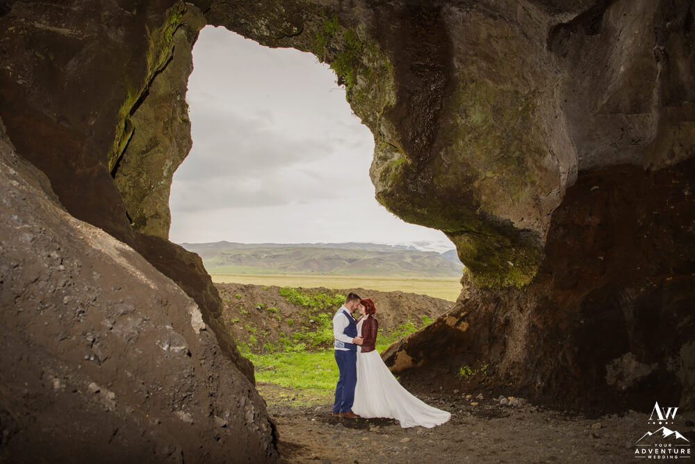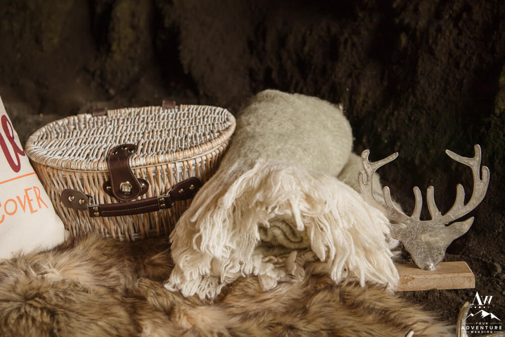 No matter the season or weather, experiencing the inside of a natural cave in Iceland is pretty spectacular. Meanwhile, opting in for a luxury picnic while there seriously takes any experience driven elopement up a notch! To illustrate, the newlyweds added on a luxury champagne picnic complete with cozy blankets, pillows, Laurent-Perrier champagne, Icelandic cheeseboard, fruit, and other delicious pastries. Afterwards, they explored the cave both inside and out… In fact, they were the FIRST EVER to get wedding photos inside of this newly dug out cave!!