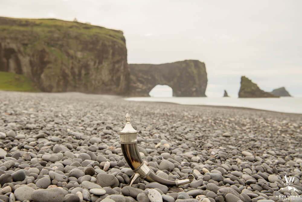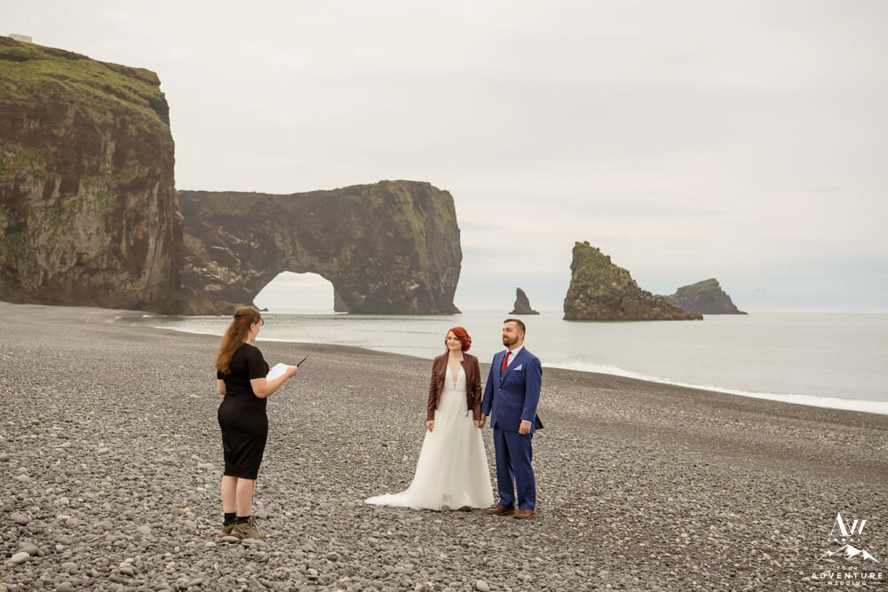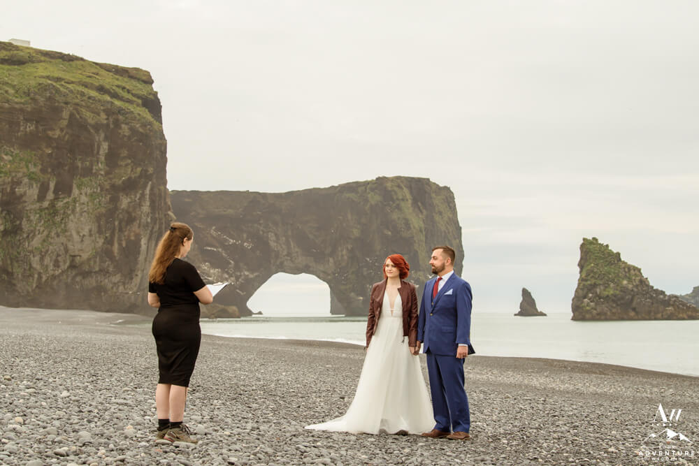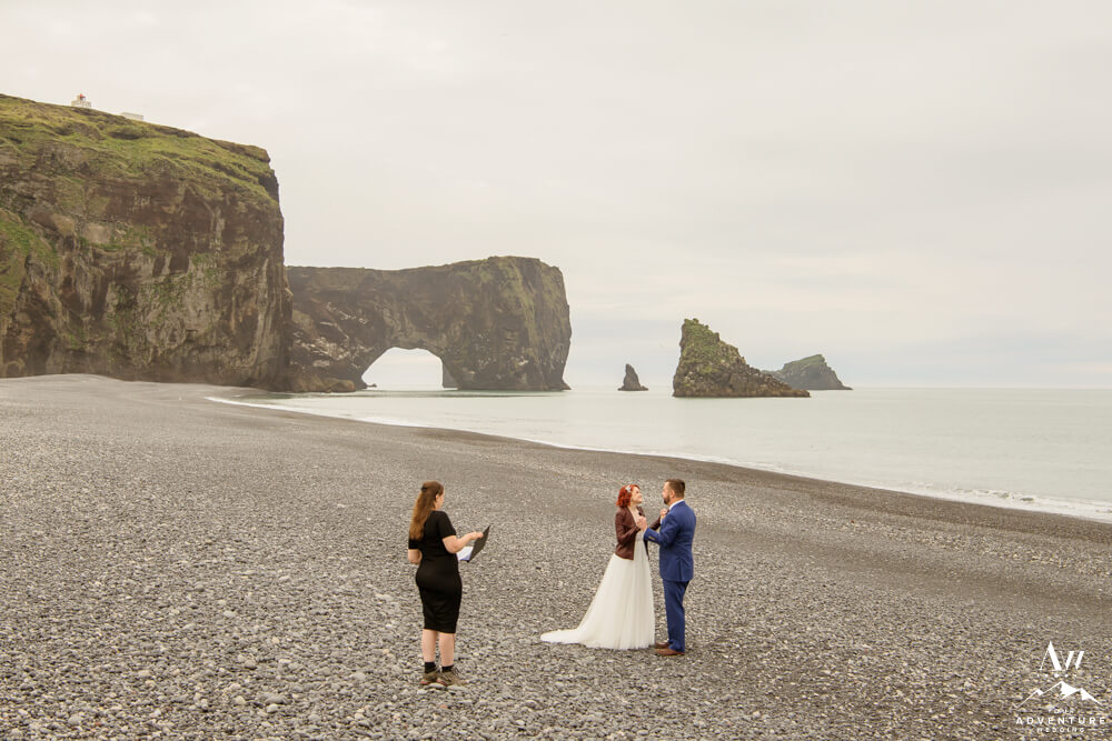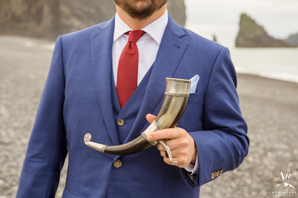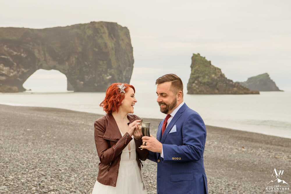 Next, our team member, Vanessa led a lovely wedding ceremony in front of Dyrhólaey Sea Arch. Each sentence was centering and allowed Warren and Stacie to truly be present. Such special moments they shared! Immediately following their private property wedding ceremony, they toasted with a gin and tonic from a Viking Horn!