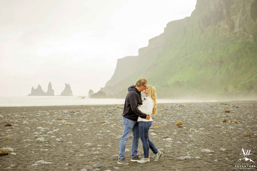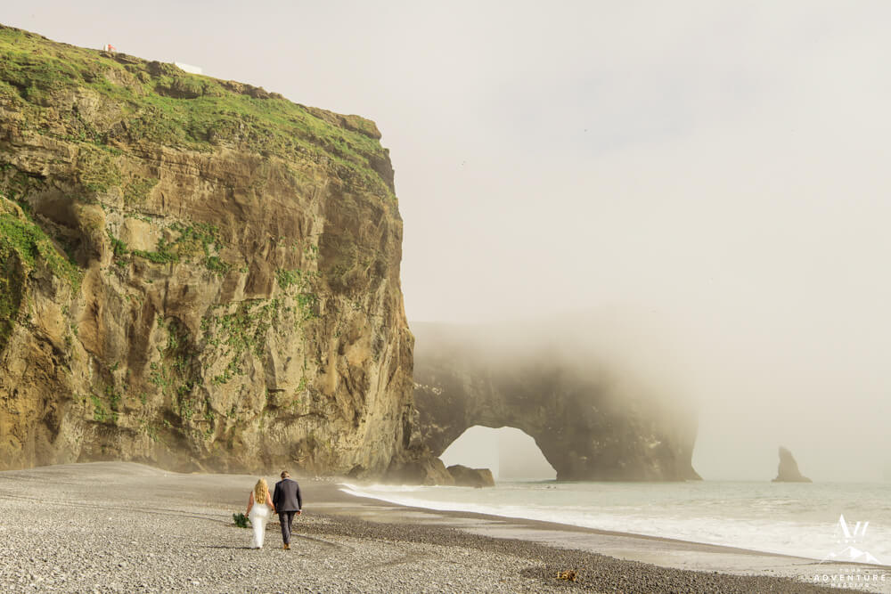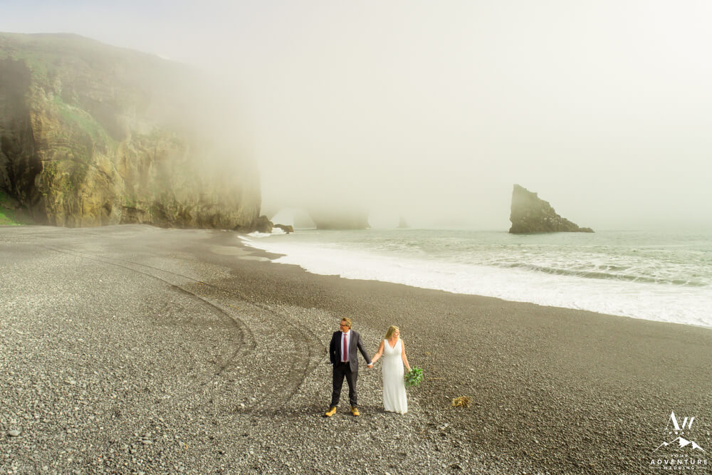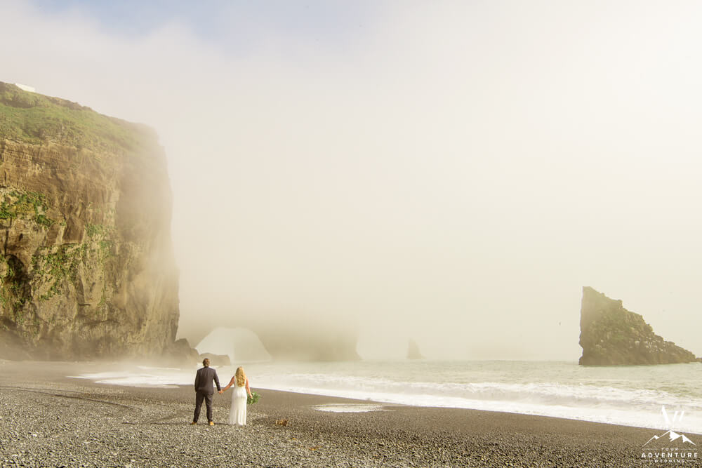 During our experience driven adventure weddings, it is always interesting to see how the weather can impact our locations from day to day. For example, when Kelly and Greg found their way to the private side of Dyrhólaey black sand beach for exploration and wedding photos, they were greeted with thick fog. But wow-wee was it crazy beautiful to witness and photograph!