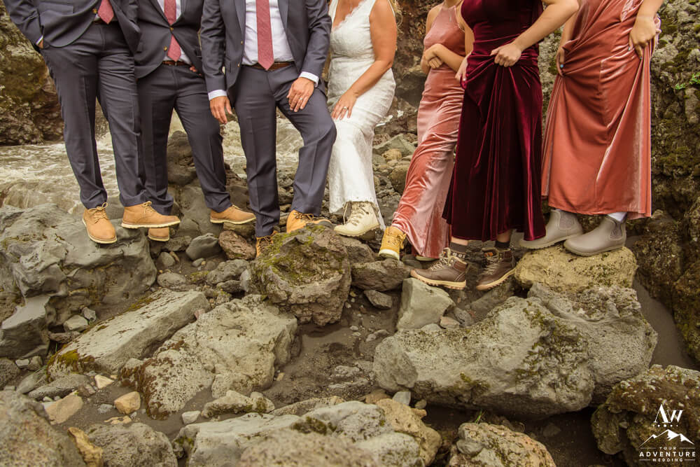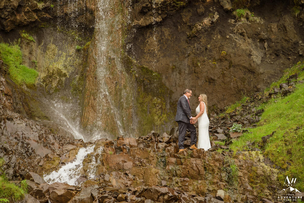 Next, on the blended family destination wedding agenda was discovering a unique glacier lava rock waterfall. What a super unique sight to see! The textures, colors, and combination of the beautiful mountain behind really set the scene for epic Iceland wedding photos.