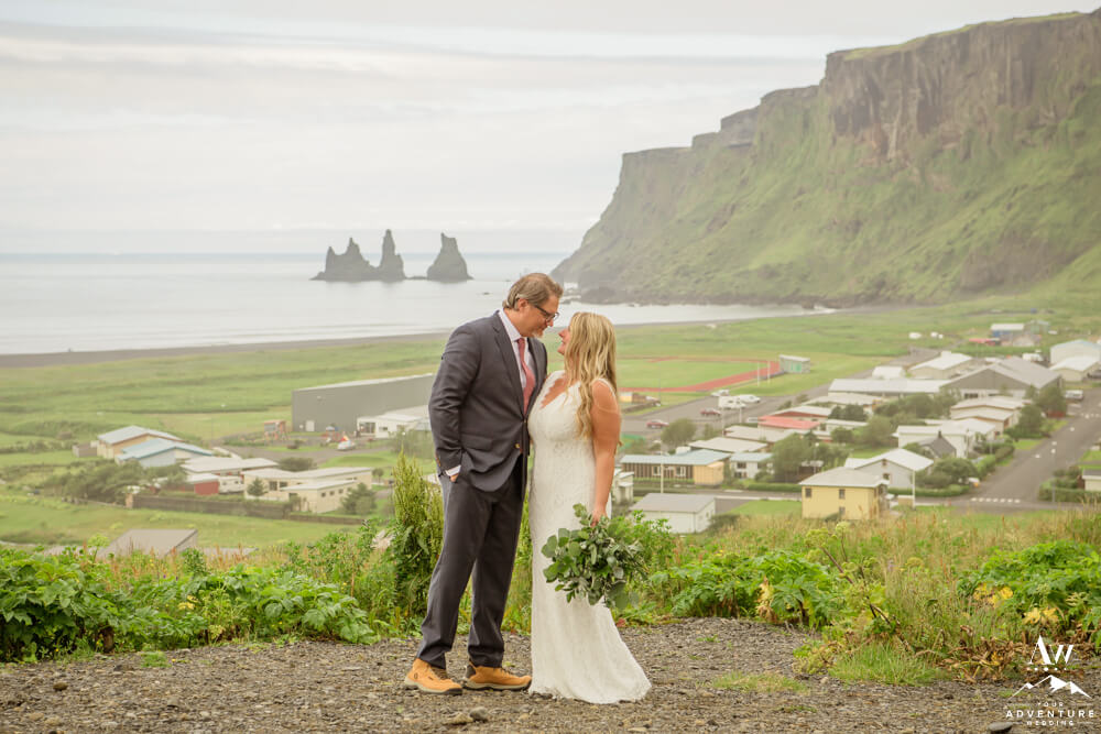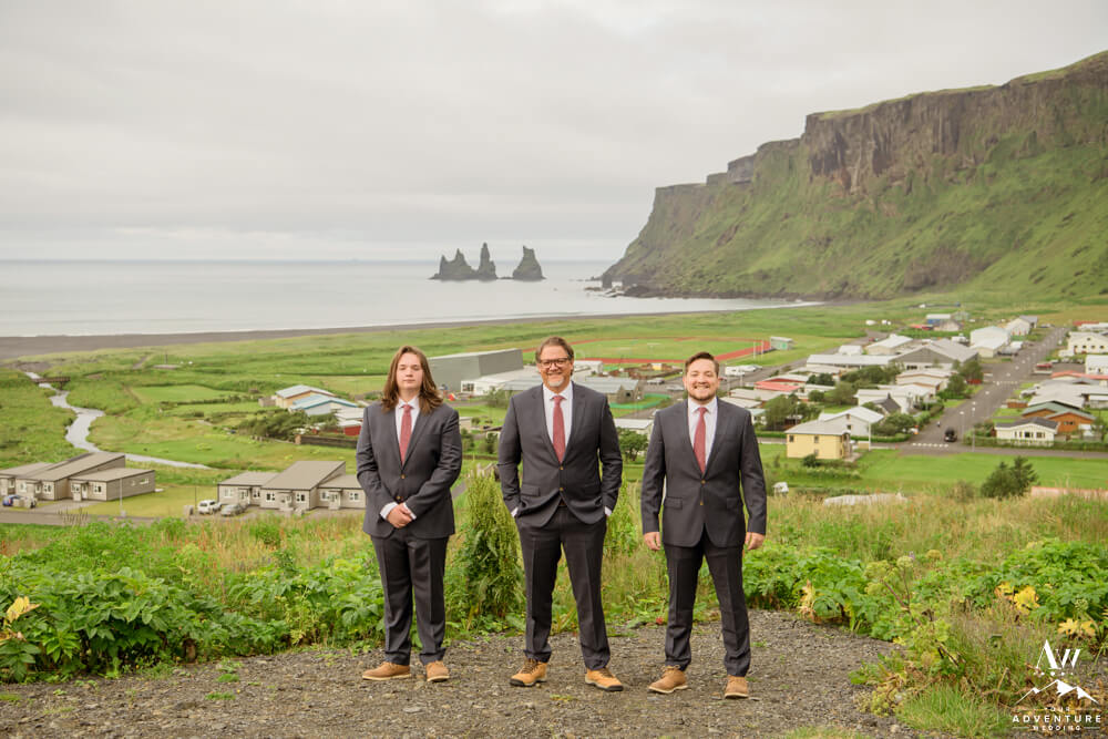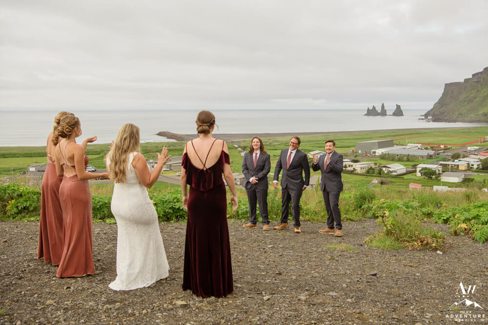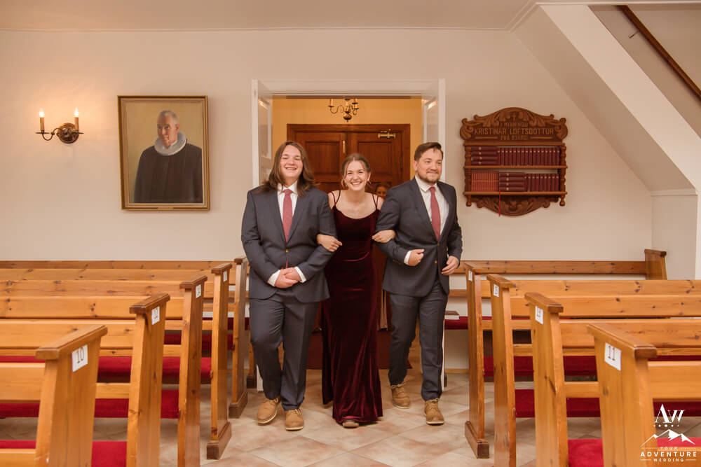 Upon arriving to Víkurkirkja, the gentlemen waited outside. Because the family thought it would be fun to stage a first look overlooking the beautiful town of Vik! After all, could a sweet countryside church have a better view? Fun Fact: Did you know Ann and Davíð are building a cantilevered home practically next to this historic yet picturesque place? Follow their journey at Vik Dream House.
