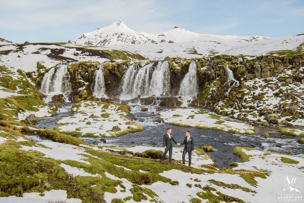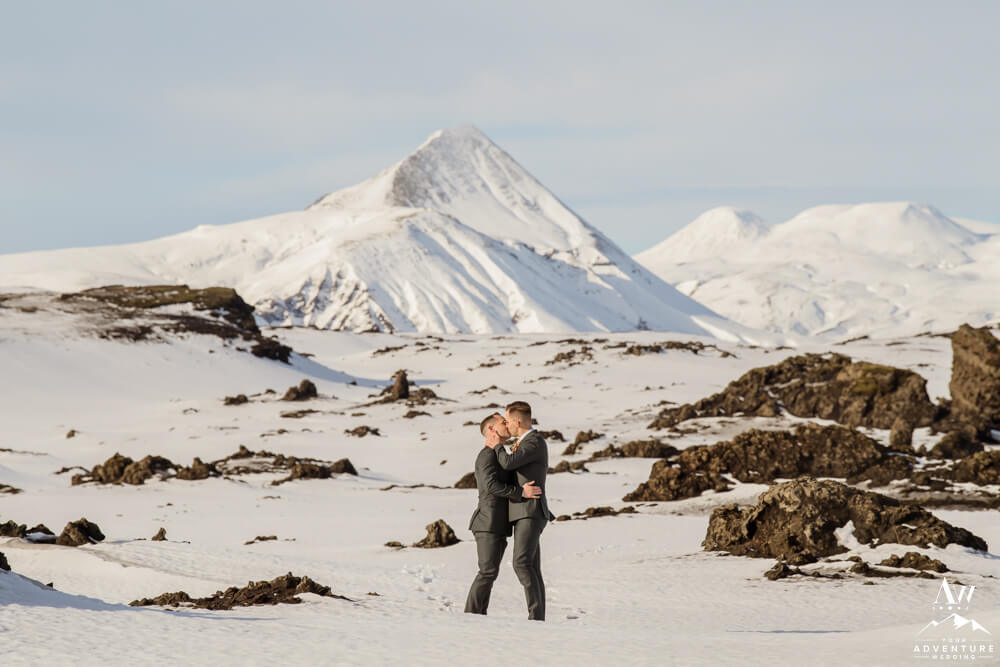 Next, further on into the highlands the gents go! When snow has already begun to fall in these uninhabited areas, it really becomes a well earned journey to get to certain places. For example, it could take longer, other unique challenges could pop up, and weather changes quickly. However, after their glacier elopement ceremony, the sun was abundant! Also the landscapes somehow became more beautiful with the mix of lunar-like plus snow and the greens popping through as the snow melted in some spots.