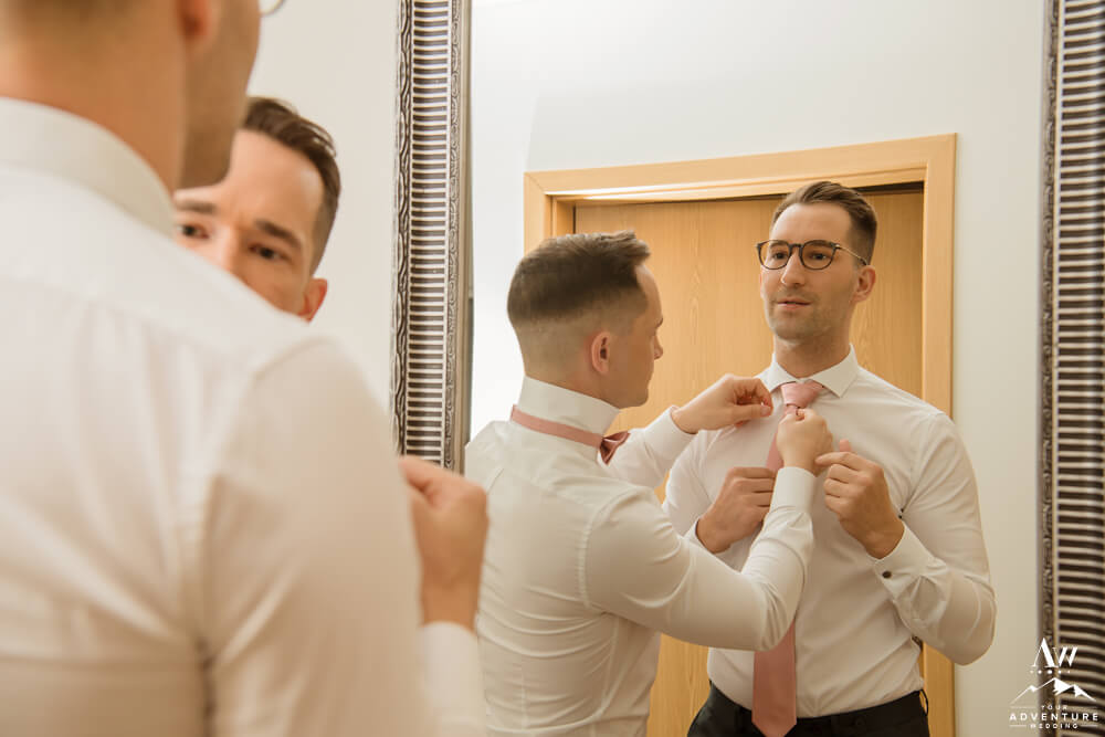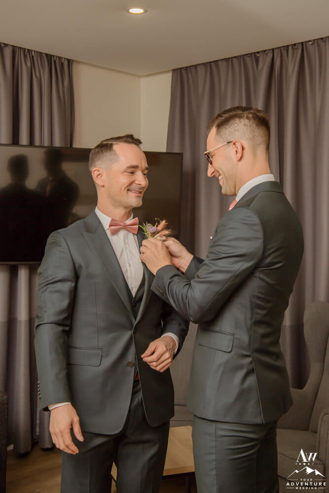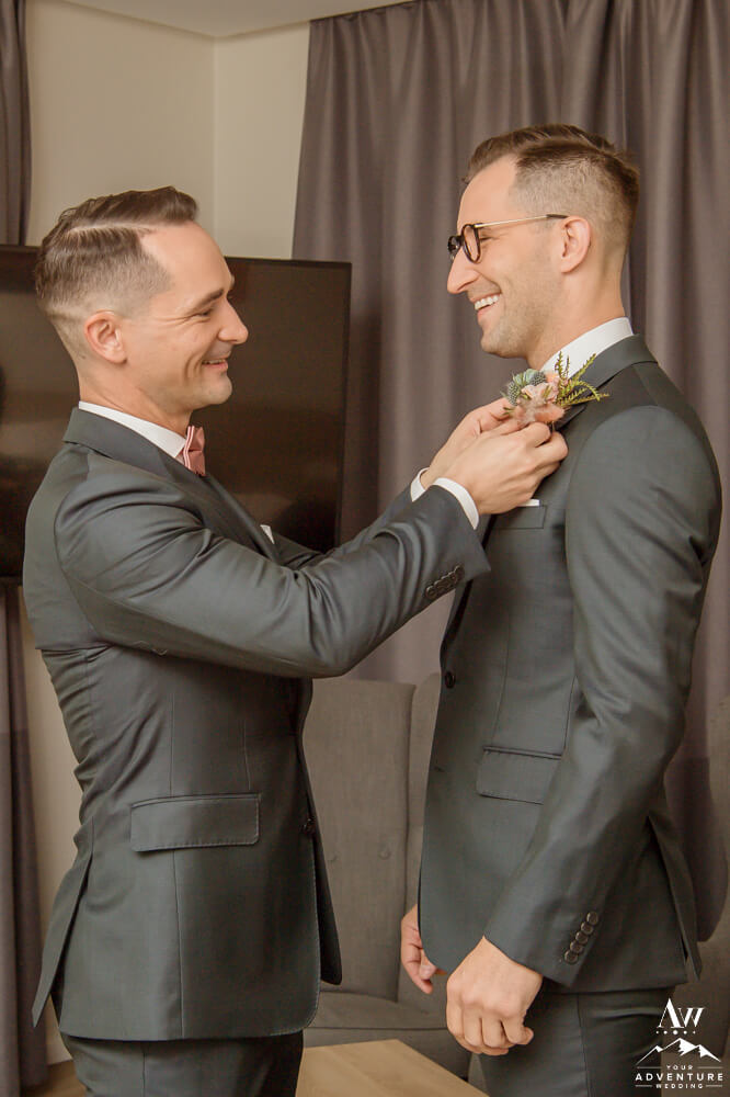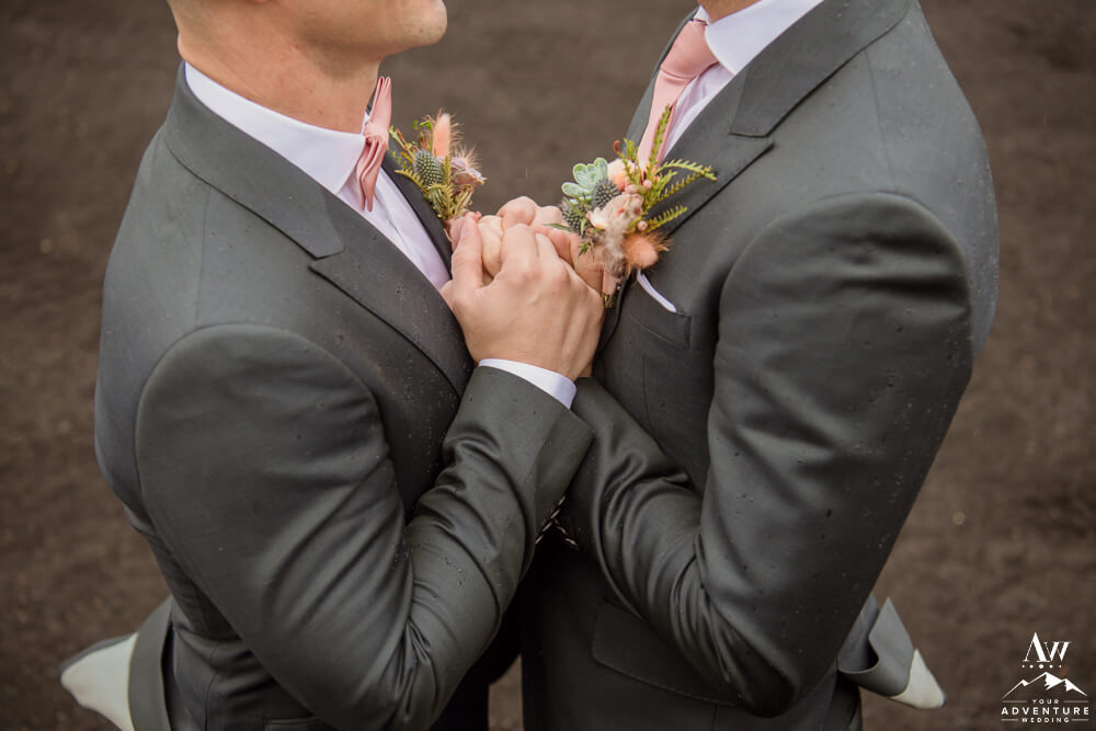 The morning of October 1st 2021 was chockful of all the feels, as the grooms video chatted with their loved ones back home as they got ready. Add in an endless supply of laughs, smiles, champagne, and they were off to a perfect start to their highland wedding! Meanwhile, our Iceland elopement photographer captured all of their fabulous details as the sun began to rise. After it was time for breakfast, get dressed, load into their ride for the day, which was a super jeep on 46” tires to embark on their highland wedding journey!