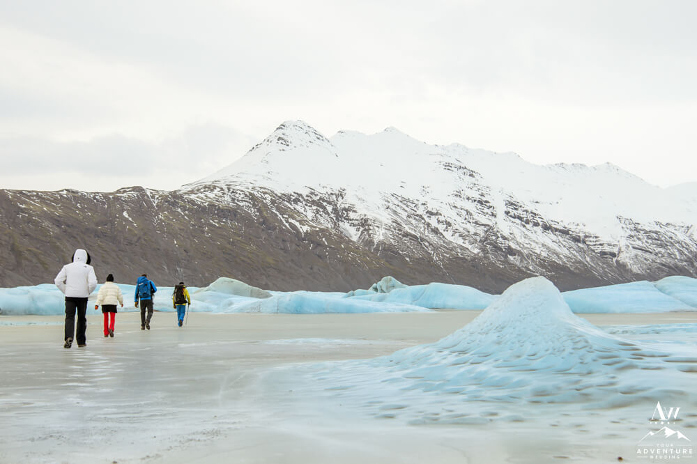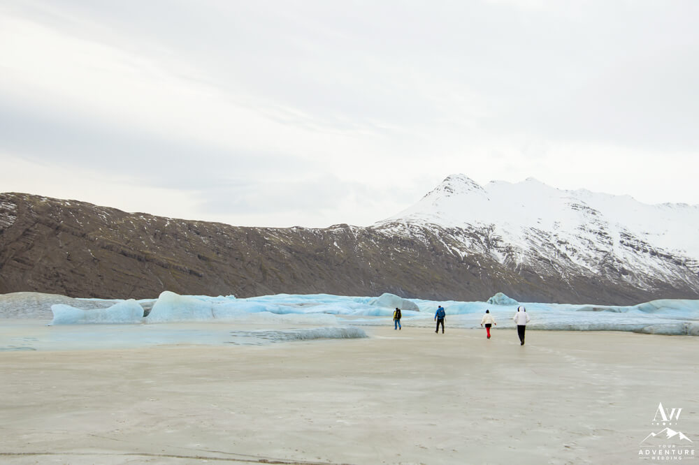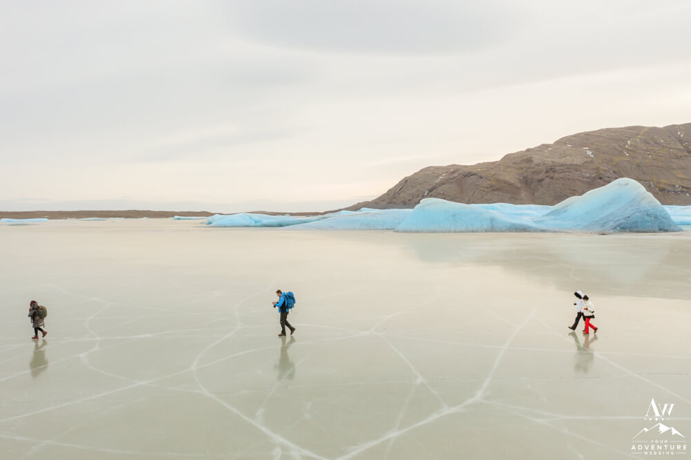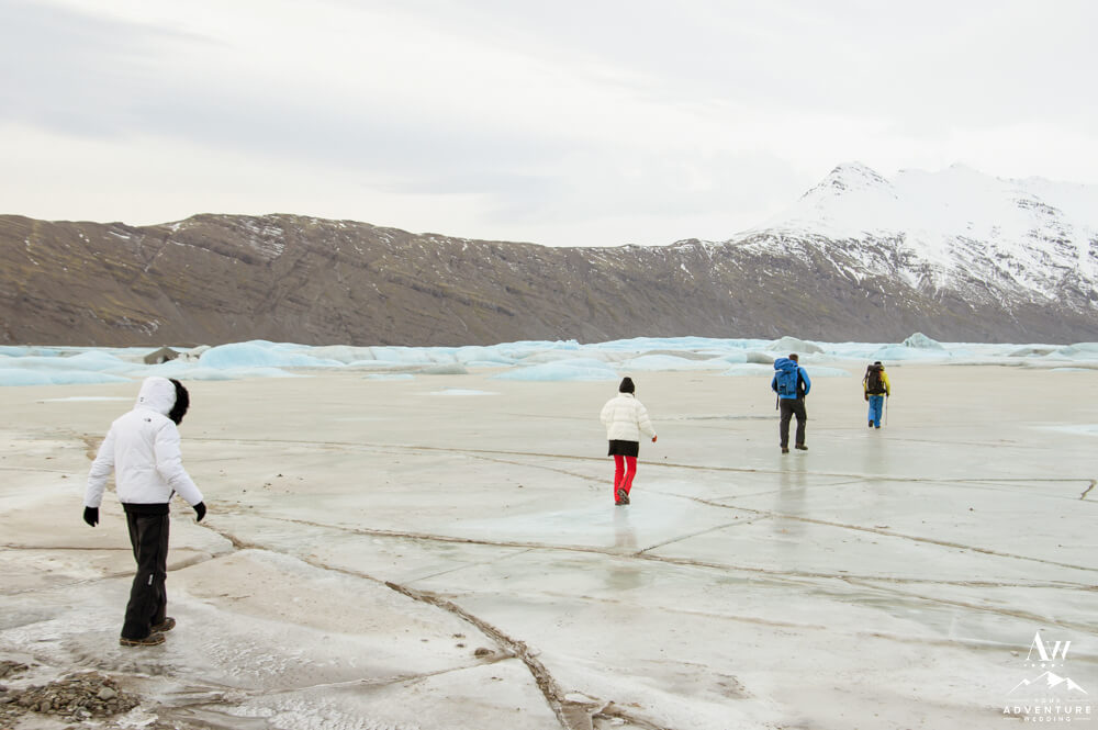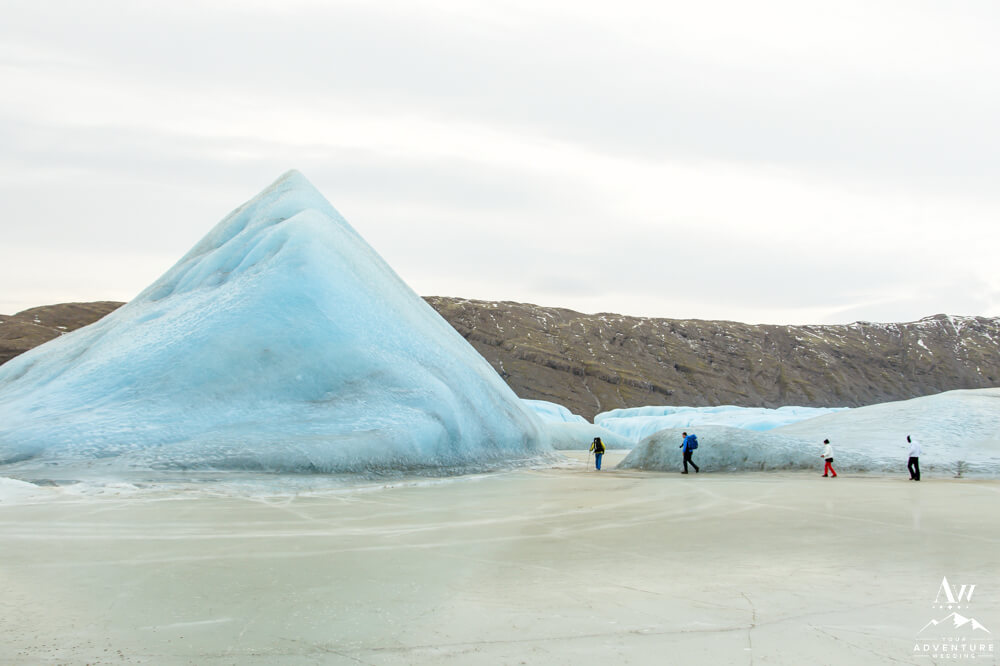 This day Michael got lucky and all of the stars and conditions aligned for this magical ice cave proposal to happen!  Furthermore, the journey took around 2-2.5 hours one way flying in the helicopter across the South Coast of Iceland.  And upon landing, our seasoned glacier guide was ready for us!  The hike across the frozen lake was about one mile so the helicopter left us to fuel for the return flight.