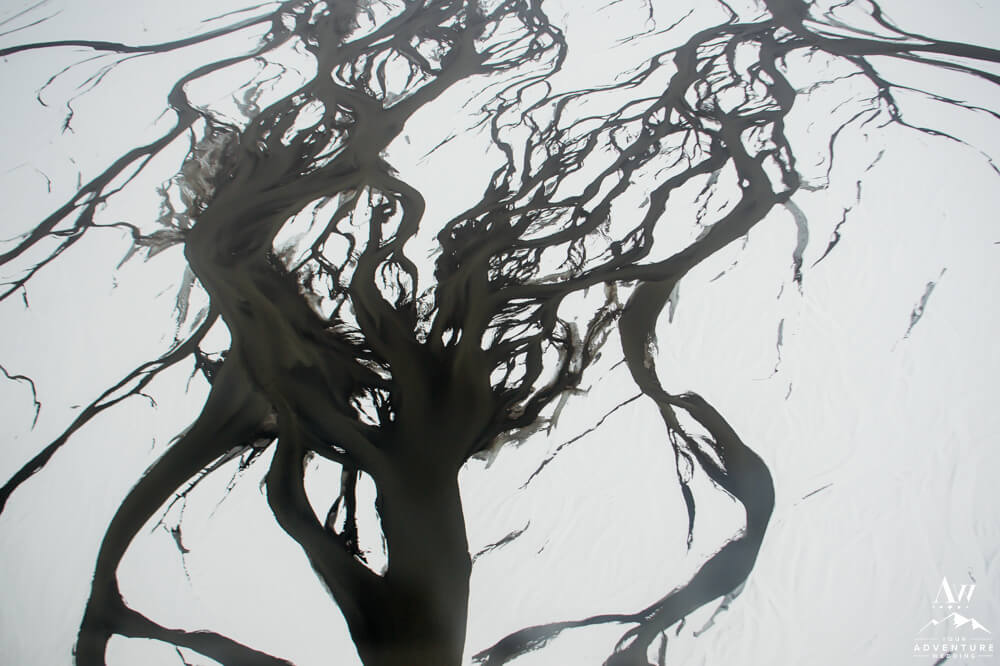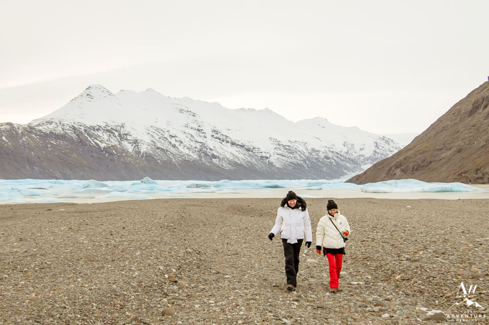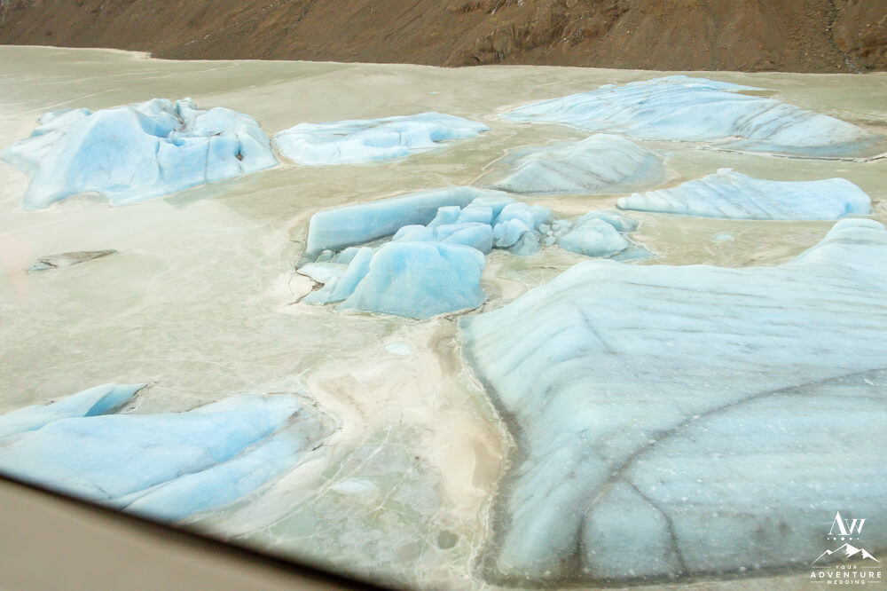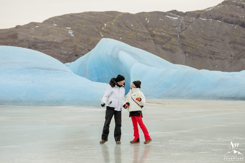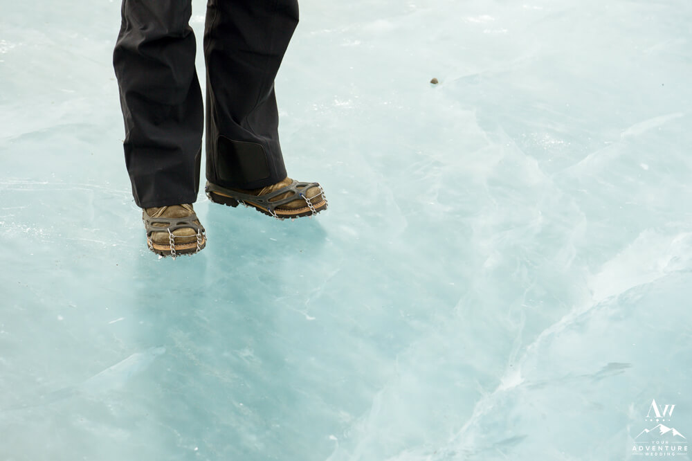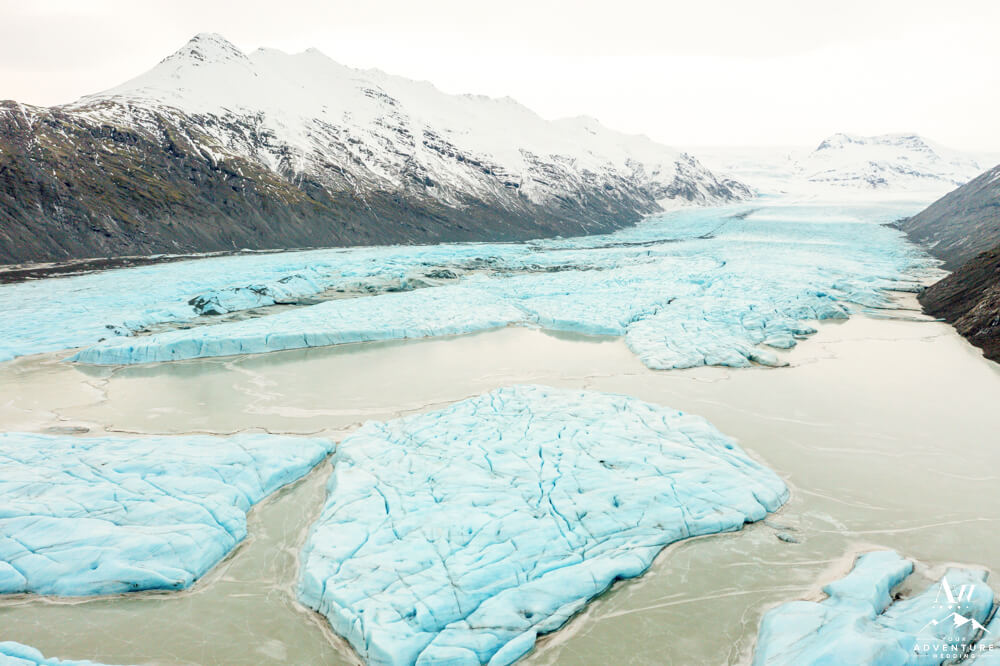 This day Michael got lucky and all of the stars and conditions aligned for this magical ice cave proposal to happen!  Furthermore, the journey took around 2-2.5 hours one way flying in the helicopter across the South Coast of Iceland.  And upon landing, our seasoned glacier guide was ready for us!  The hike across the frozen lake was about one mile so the helicopter left us to fuel for the return flight.