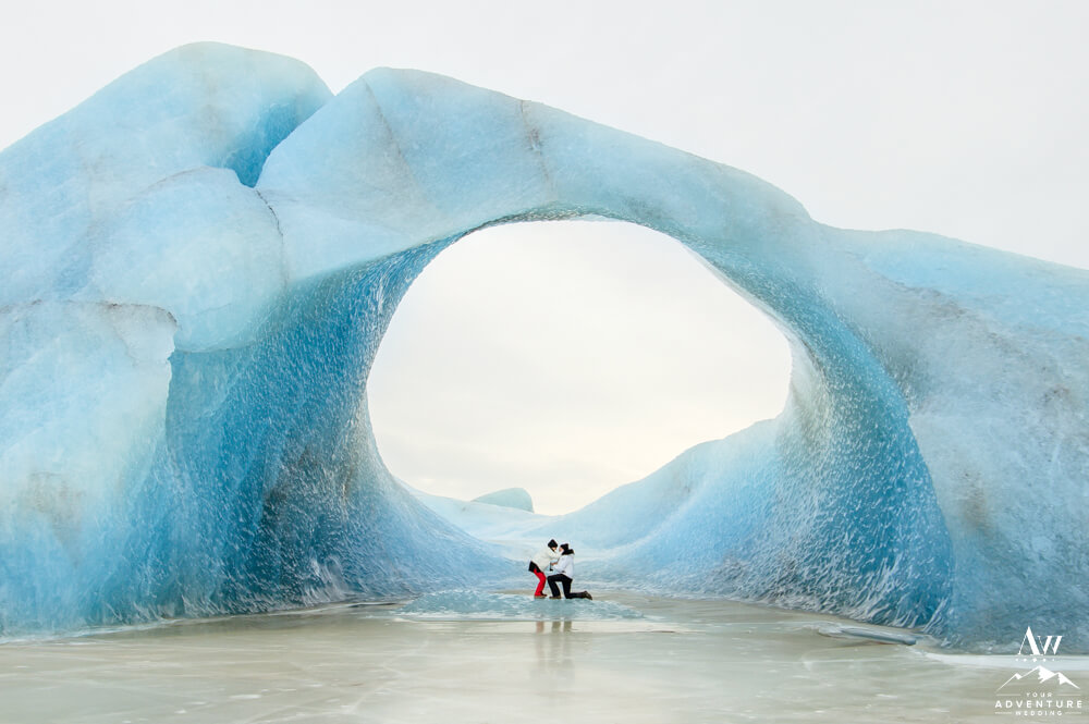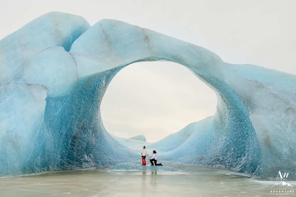 Firstly, you need a Iceland proposal team that scouts.  Second, there needs to be an iceberg in one of the glacier lagoons that has an ice cave inside of it.  Third, the weather in Iceland needs to be cold enough to freeze the lake weeks before (and keep it frozen!).  Forth, you need a local guide to meet you and take you out there.  Why?  So that you will be safe and have someone professional there to react if any issues arise.