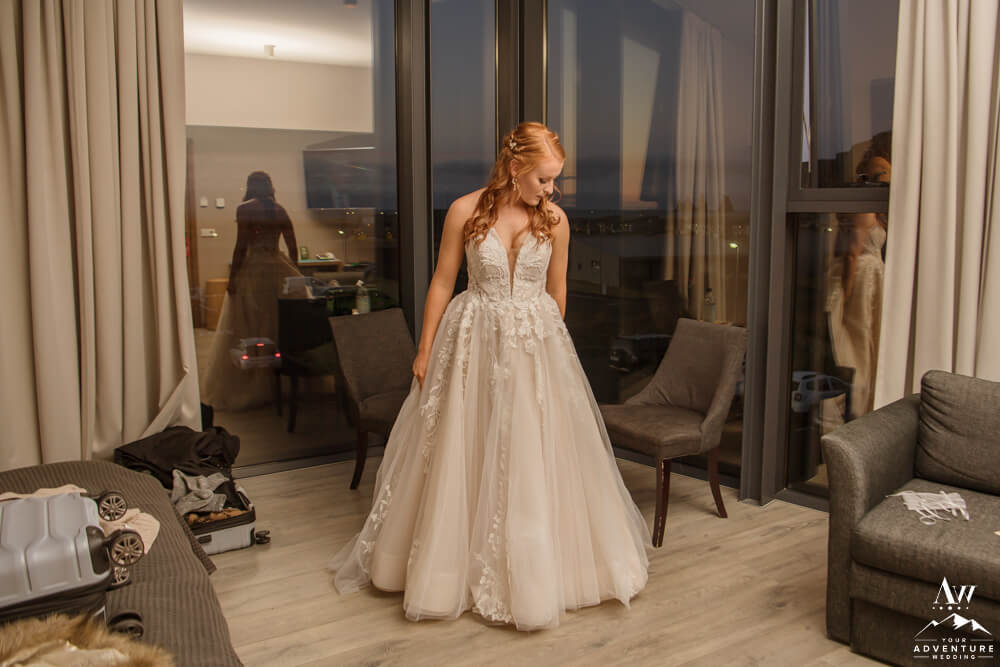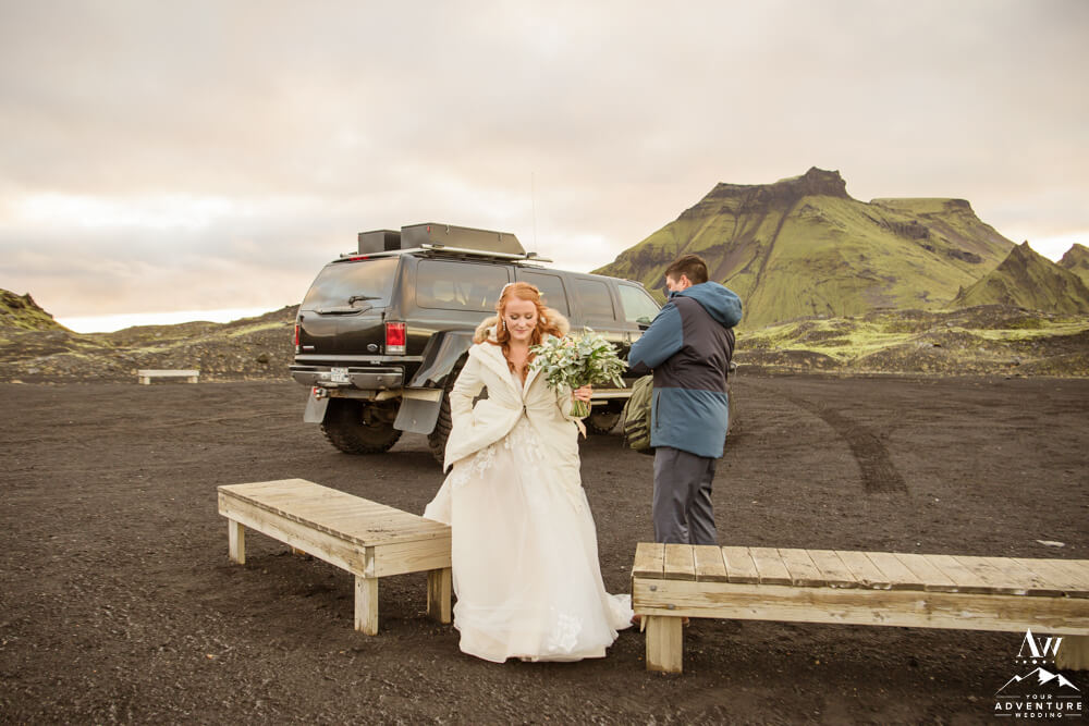 Furthermore, a strong element these two want from their elopement is for it to be experience driven. Versus playing dress up and taking pretty pictures. Likely why at the end of the day, they chose our Iceland Wedding Planner team to craft their unforgettable day! Therefore, their October 11th 2021 elopement journey began in Vik shortly before sunrise. After hair, makeup, and getting into their wedding attire these two did a “first look” before jumping into the super jeep for the day.