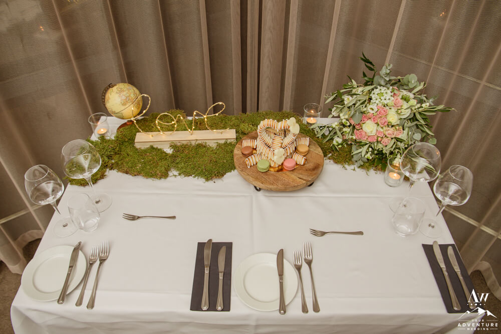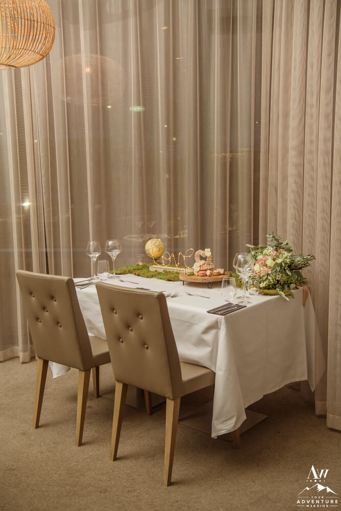 Lastly the end of the day came quick after adventuring together for 8+ hours. After returning to their hotel these two had a bit of time to rest and refresh. What awaited them next, was a sweet little dinner together. Additionally, their table for two is decored with moss, elements of travel and love. All of which portrayed a simple yet lovely elegance factor.