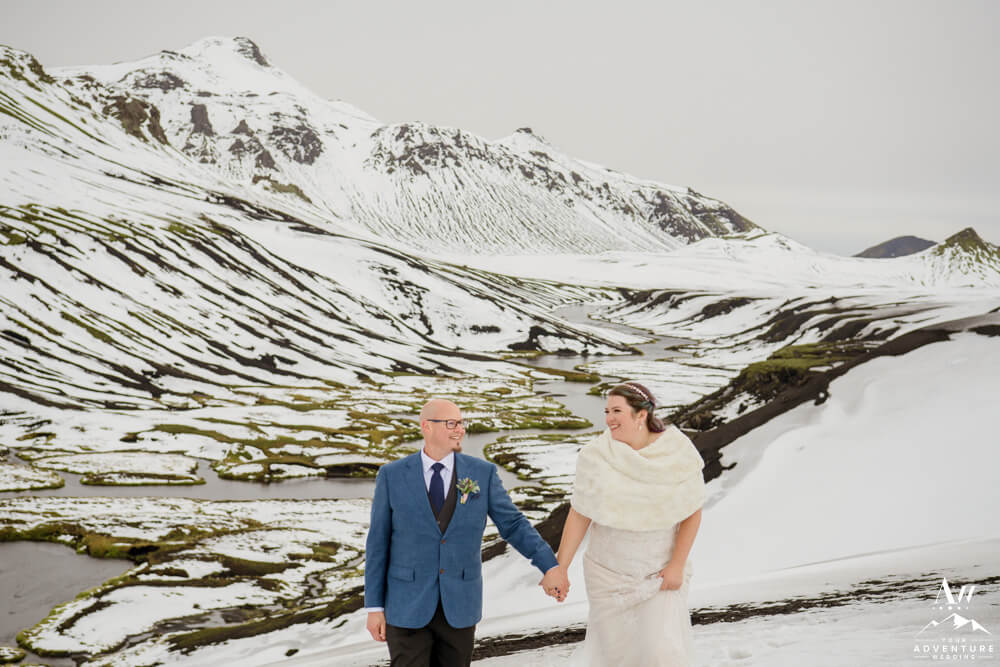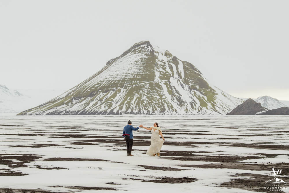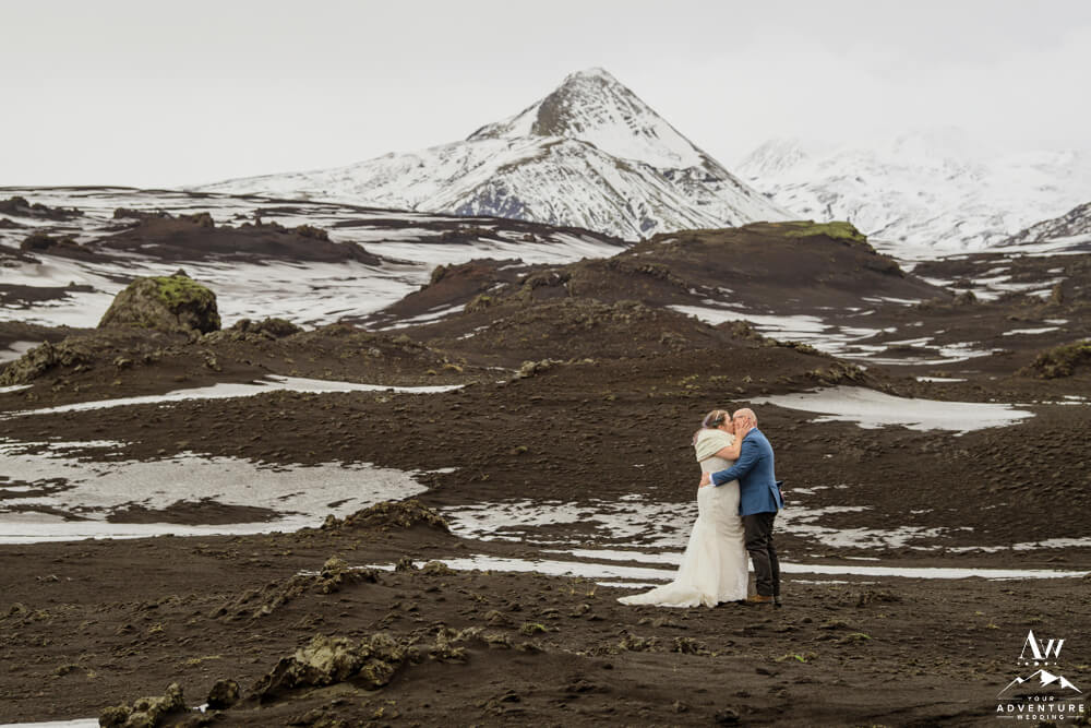 Snow in the highlands in early October is pretty normal, especially the deeper you go! But the group thoroughly enjoyed playing in it along with the bride and groom who did a twirl of two!! They may or may not have collected a few rocks along the way in the moon-like landscape. After all, half of the Katla Glacier wedding guest list works for NASA, so why not?!