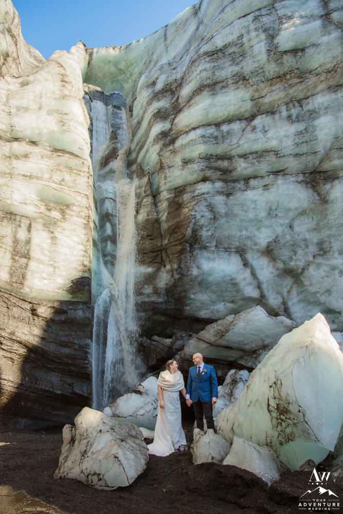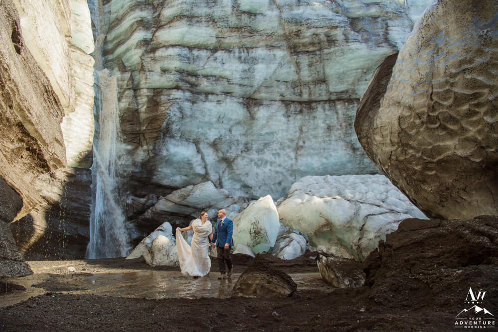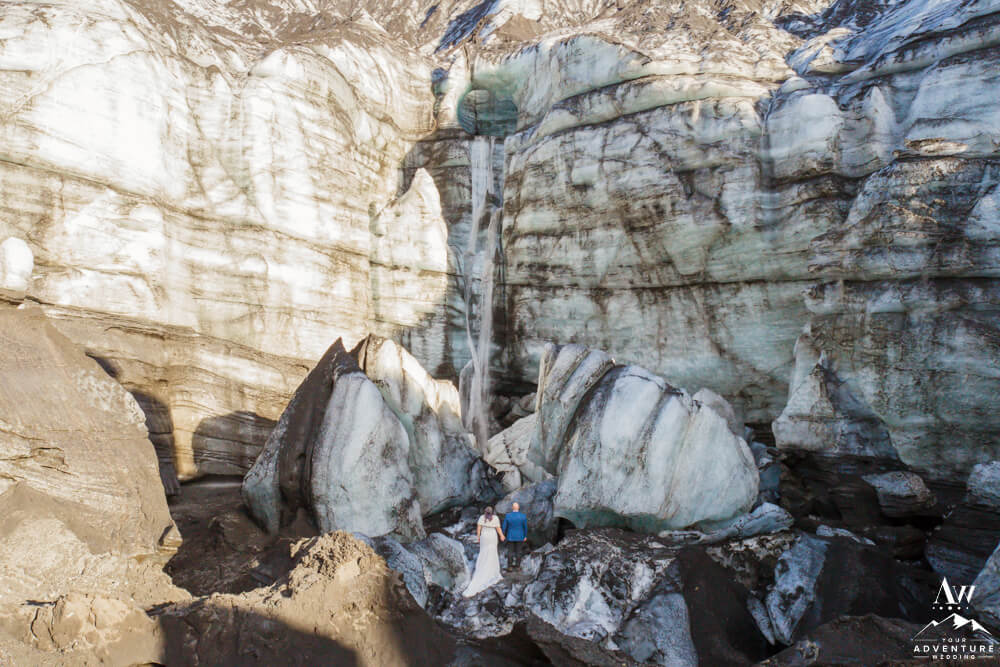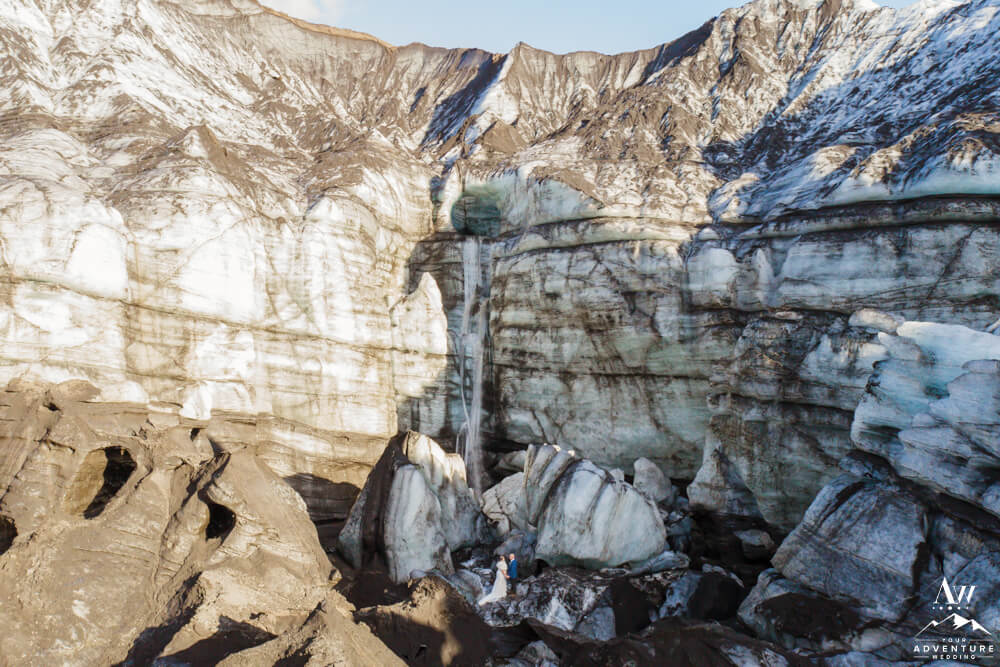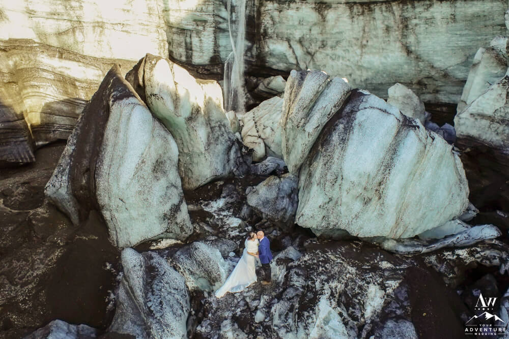 Without a doubt, it’s incredible to explore an ice valley. So many different types of features to experience during their Katla Glacier wedding adventure! To illustrate, there was the ice alter, the waterfall behind, ice boulders, an ice cave, and colorful textured walls. Plus the angle from a drone is quite beautiful too!