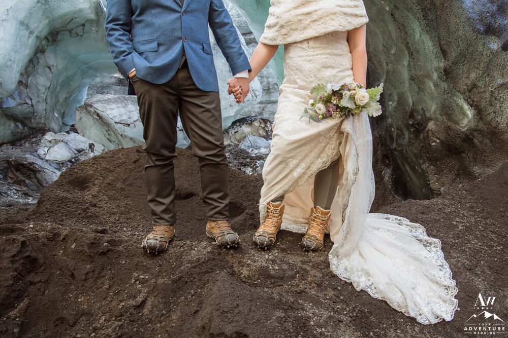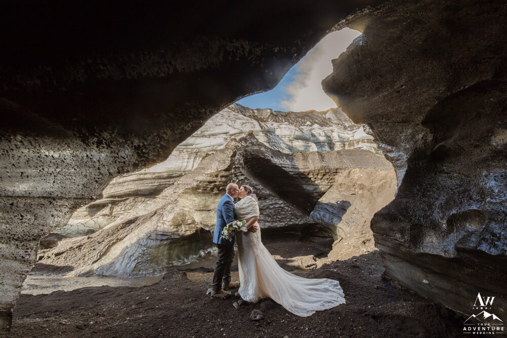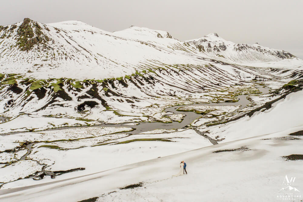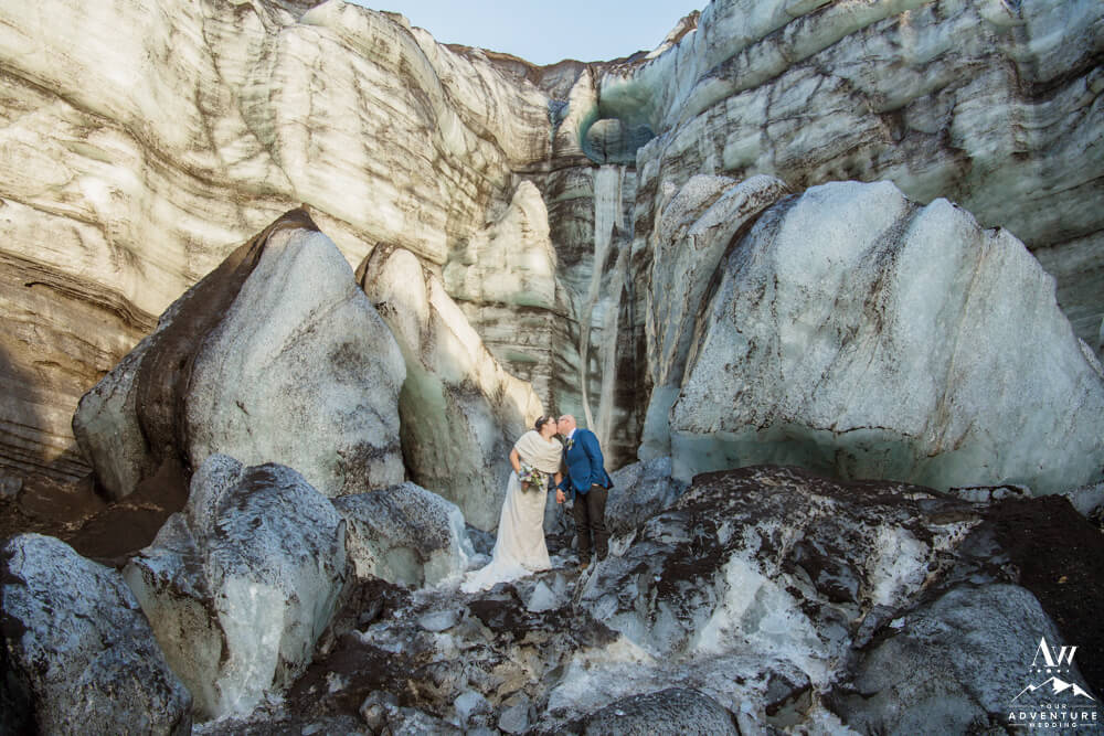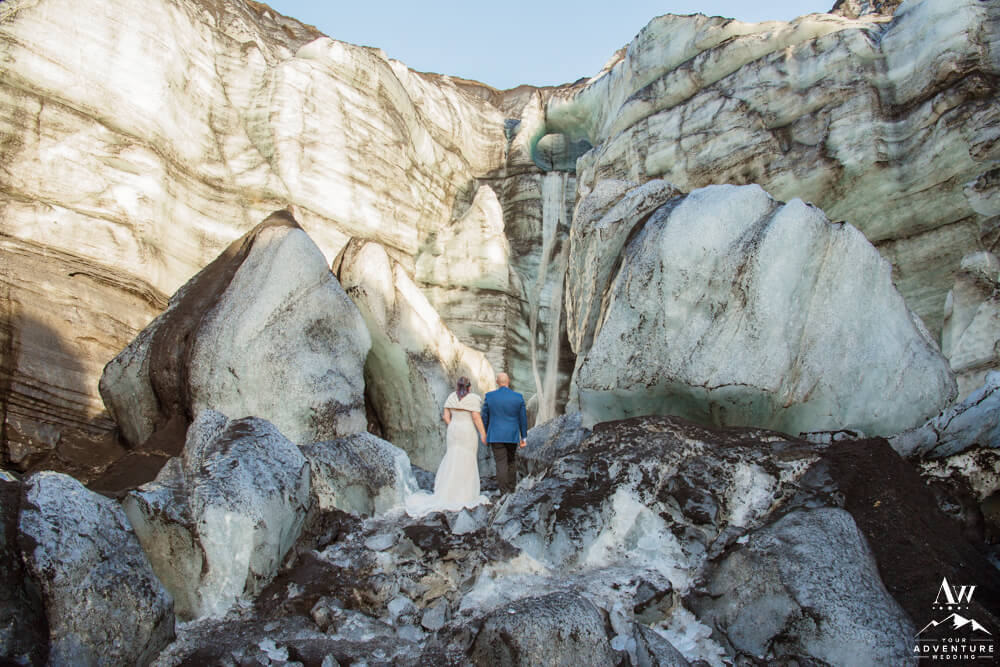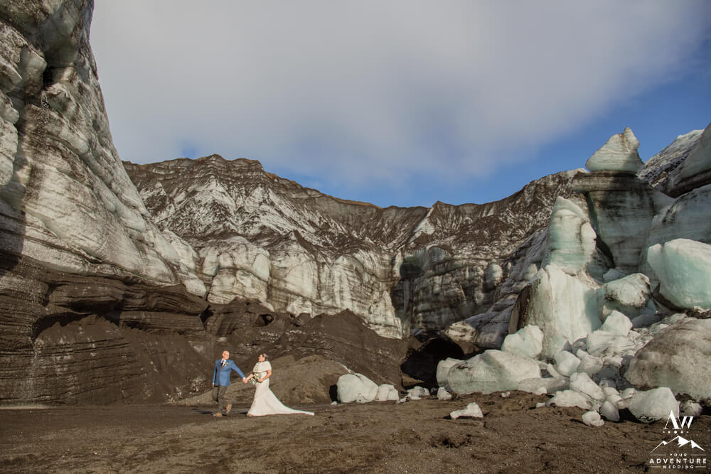 Without a doubt, it’s incredible to explore an ice valley. So many different types of features to experience during their Katla Glacier wedding adventure! To illustrate, there was the ice alter, the waterfall behind, ice boulders, an ice cave, and colorful textured walls. Plus the angle from a drone is quite beautiful too!