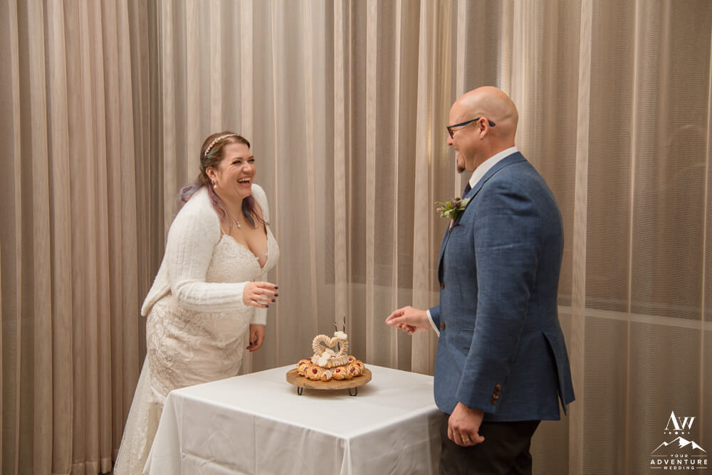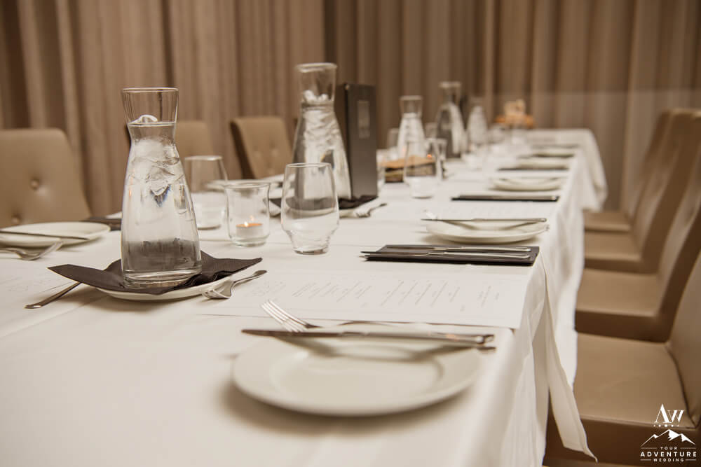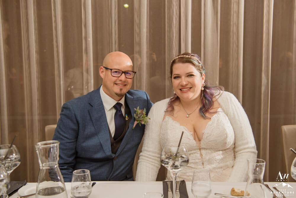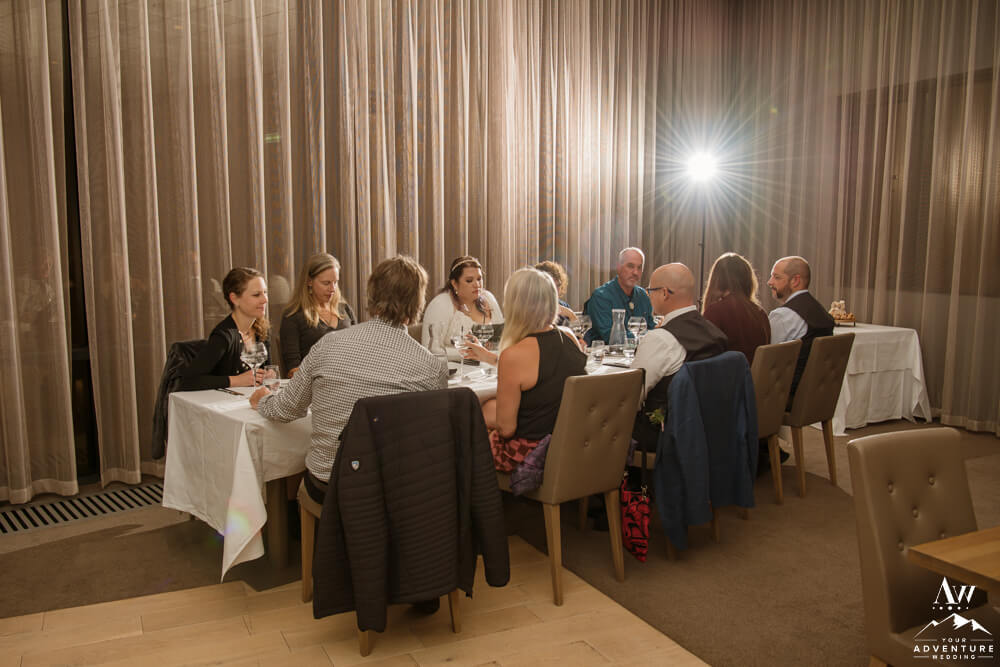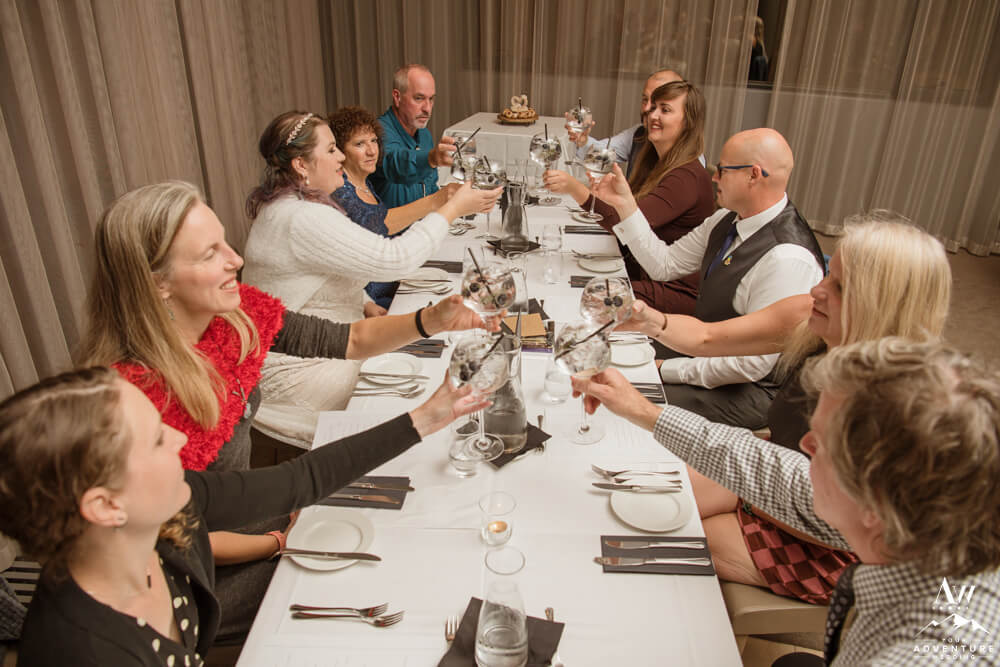 After a short rest and refresh time period, the group met again for a delicious dinner at The Berg. They toasted with signature drinks, laughed endlessly, and took funny photos. Meanwhile a warm homemade meal and conversation after an exciting Katla Glacier wedding and adventuring together, was exactly what they needed to recharge! Along with that, some sugar from their kransakaka (traditional Iceland wedding cake) helped too!! Then it was onto to Aurora Borealis hunting… Because after all it is October!!